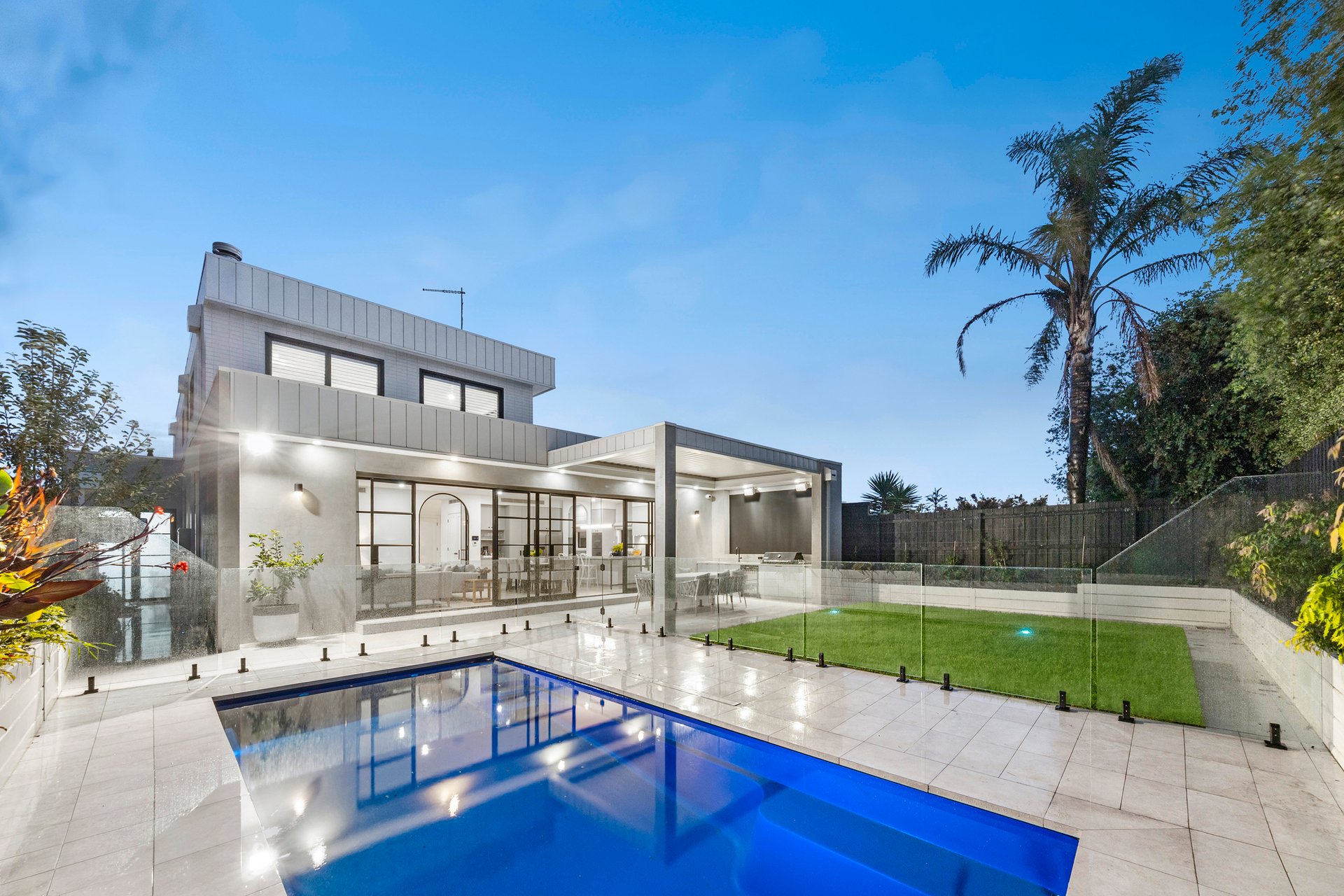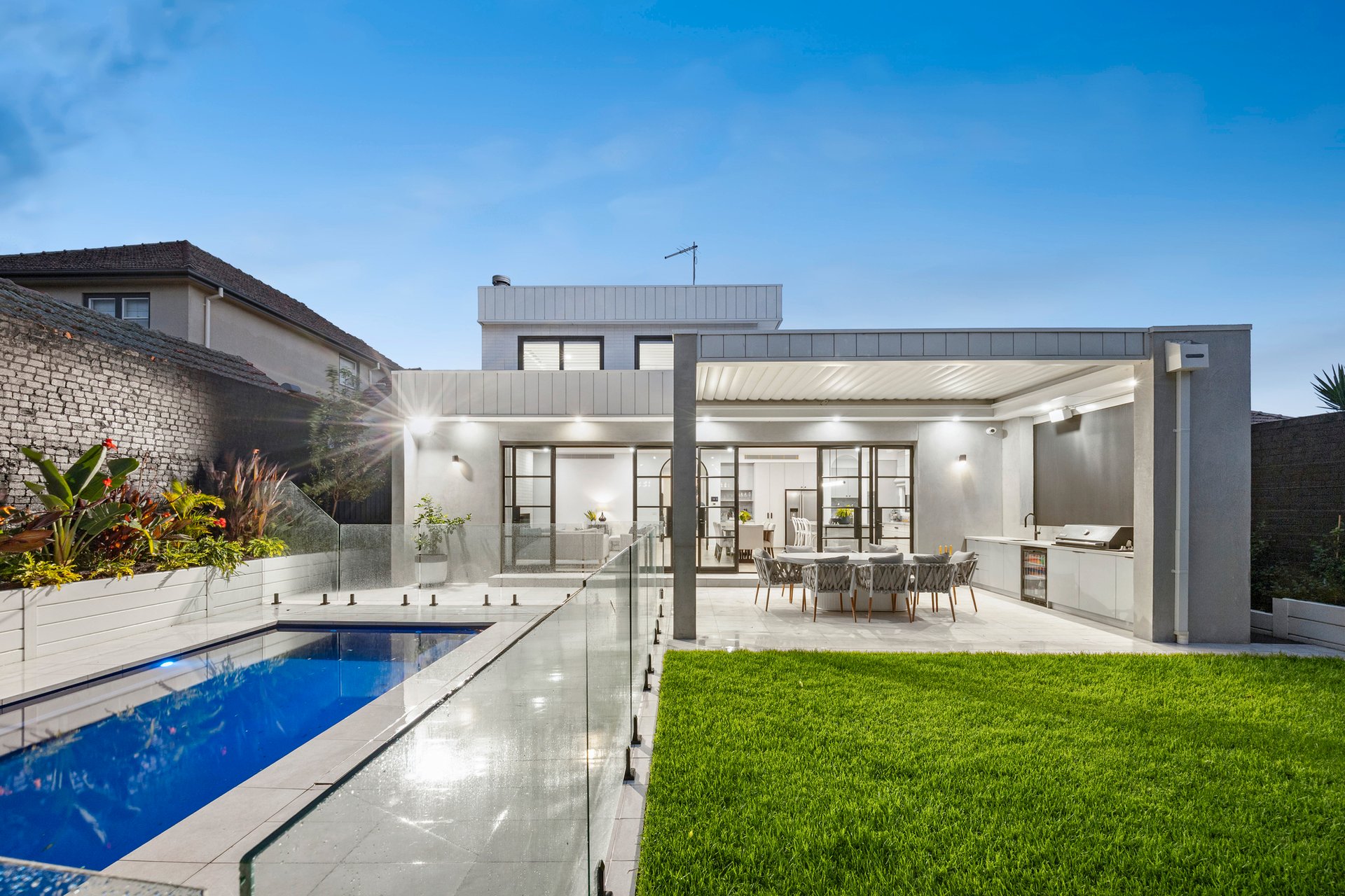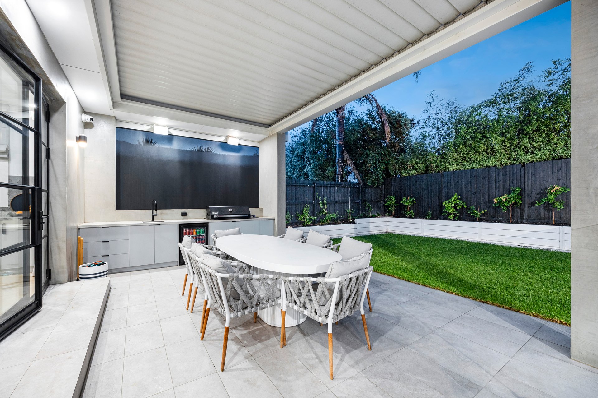 A north facing backyard with fully landscaped gardens enhances the home's appeal, while the alfresco delivers a resort-style setting with built-in Stainless Steel BBQ featuring a plumbed-in gas connection, Husky bar fridge, bespoke cabinetry and a motorised Vergola with rain sensor, all overlooking a heated mineral magnesium pool.