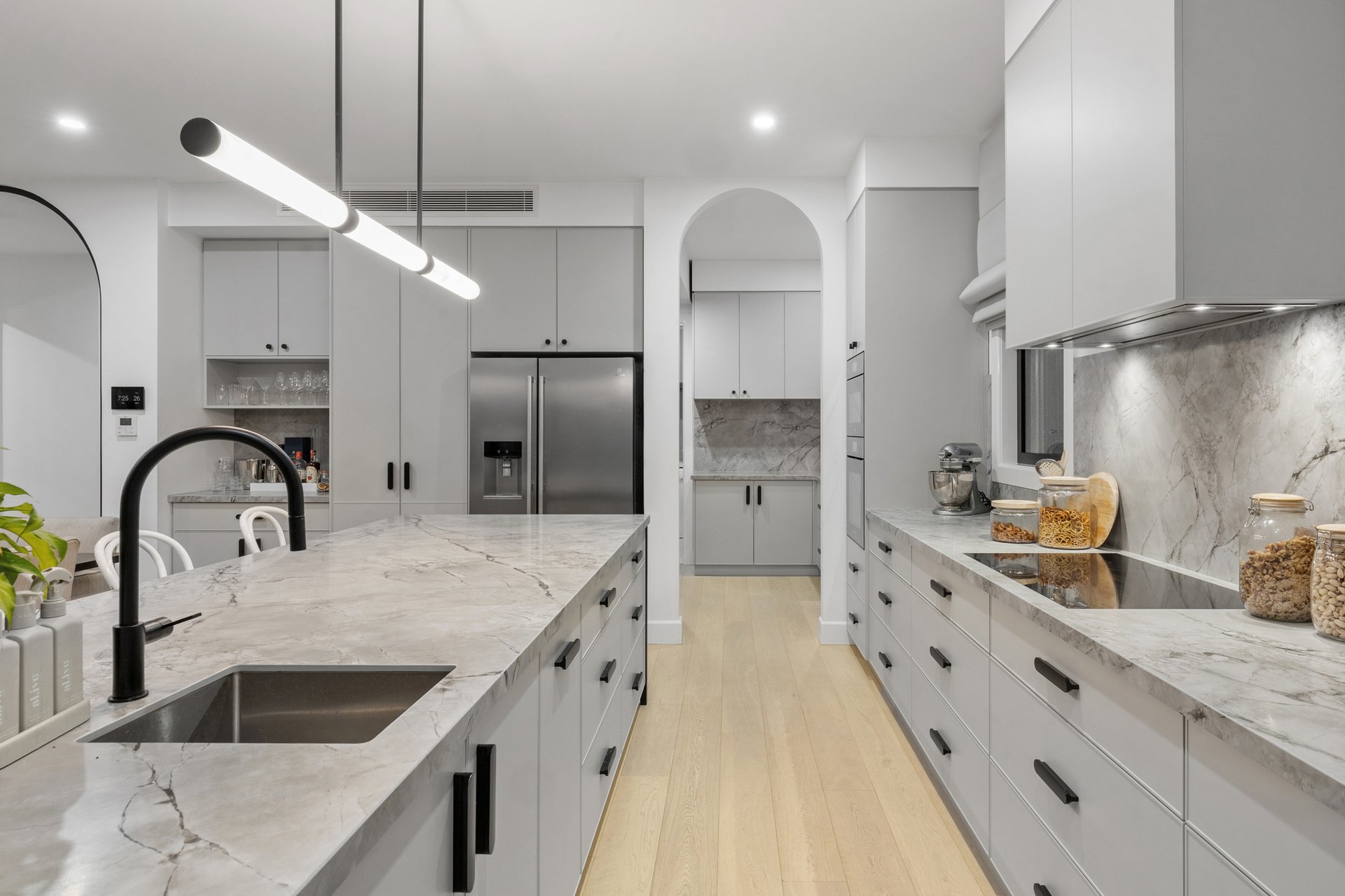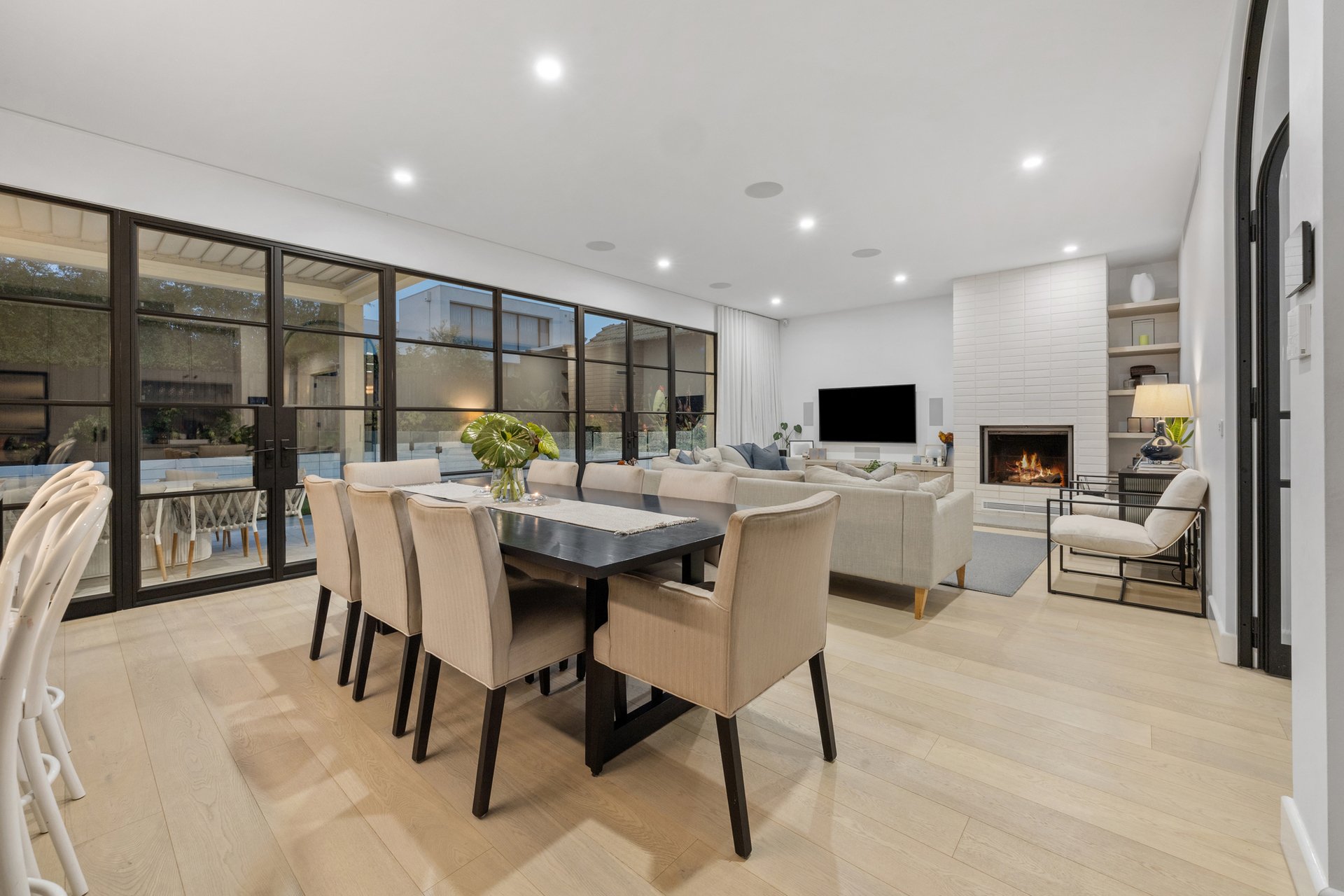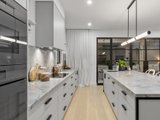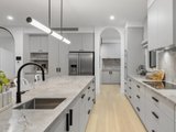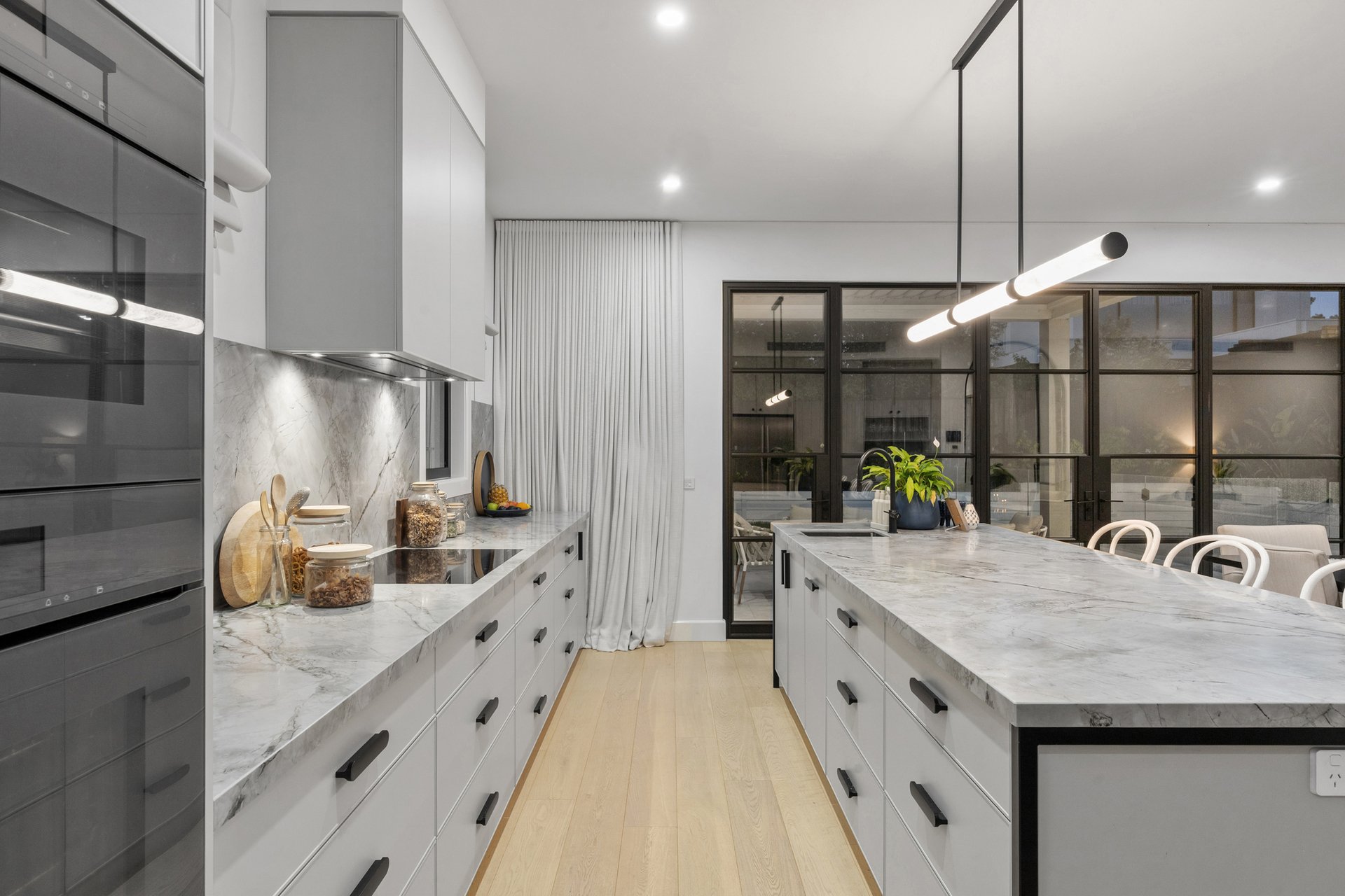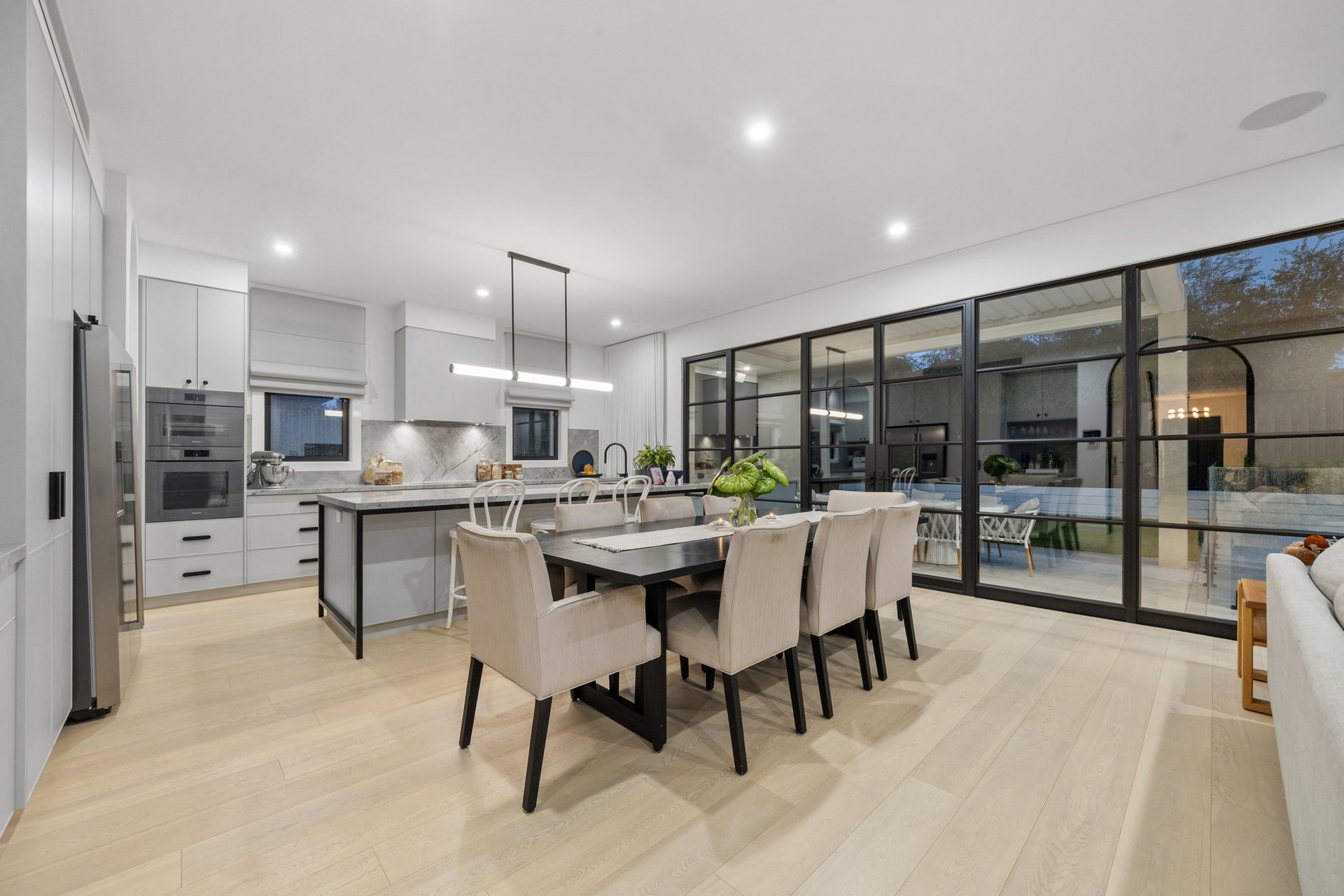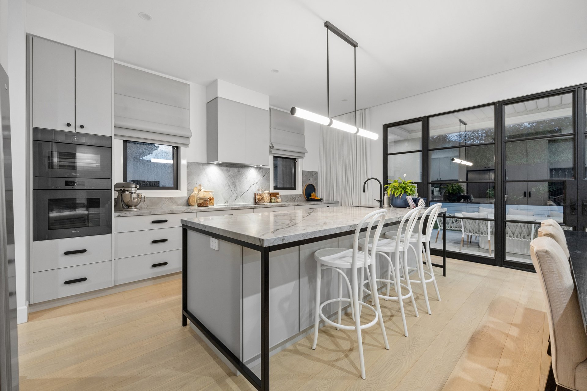 At its centre, an expansive open-plan kitchen, living and dining domain forms a stunning hub for entertaining and relaxed family living. The gourmet kitchen is appointed with Neolith stone benchtops, sleek two-pack cabinetry and a full suite of Miele appliances, complemented by a butler's pantry with Fisher and Paykel double dishwasher drawers. Custom steel framed windows and doors maximise natural light and connect seamlessly to the outdoors.
