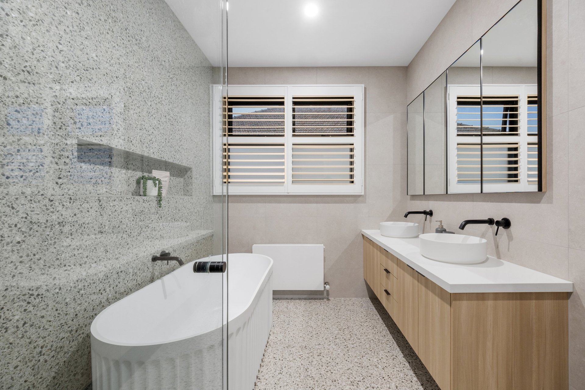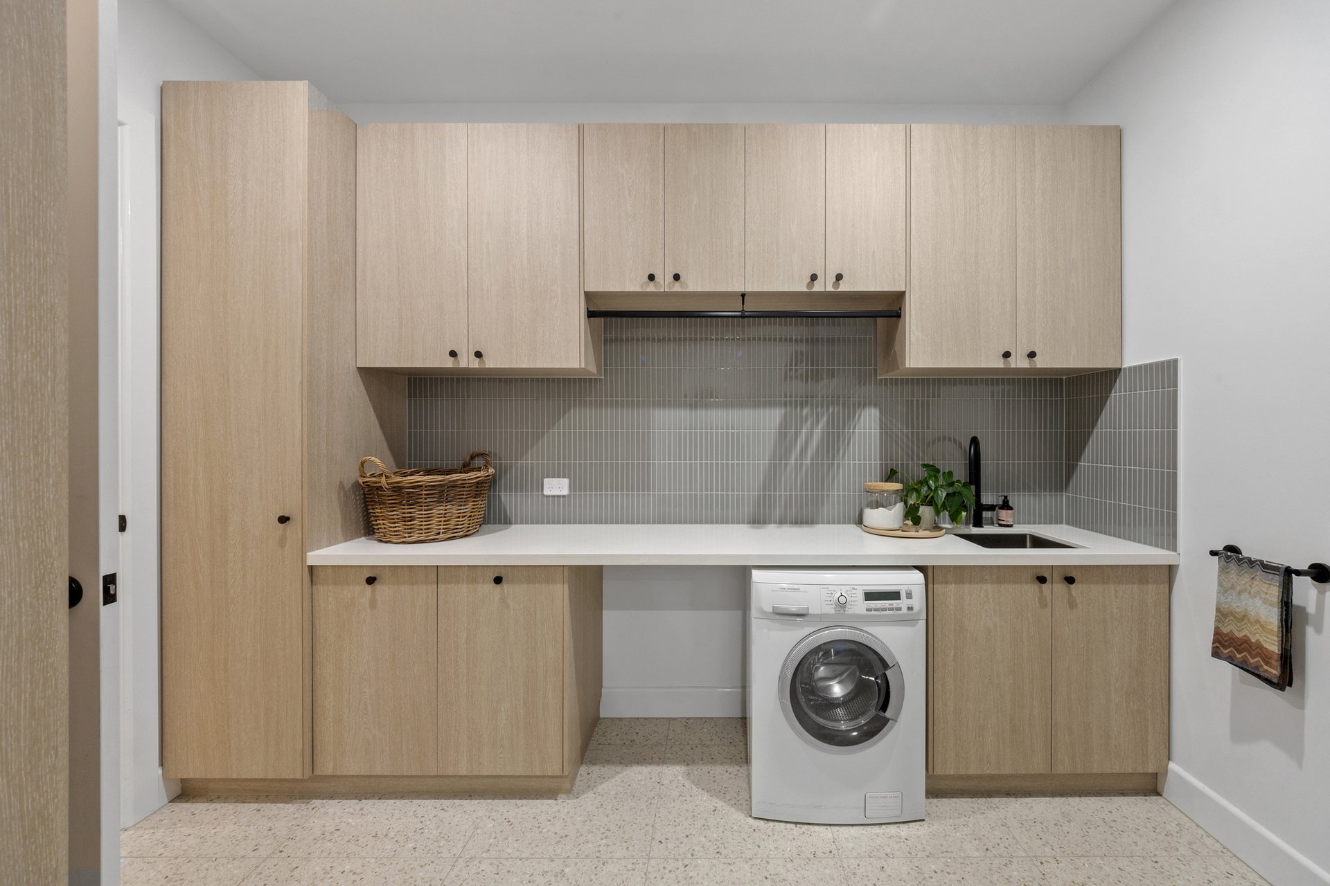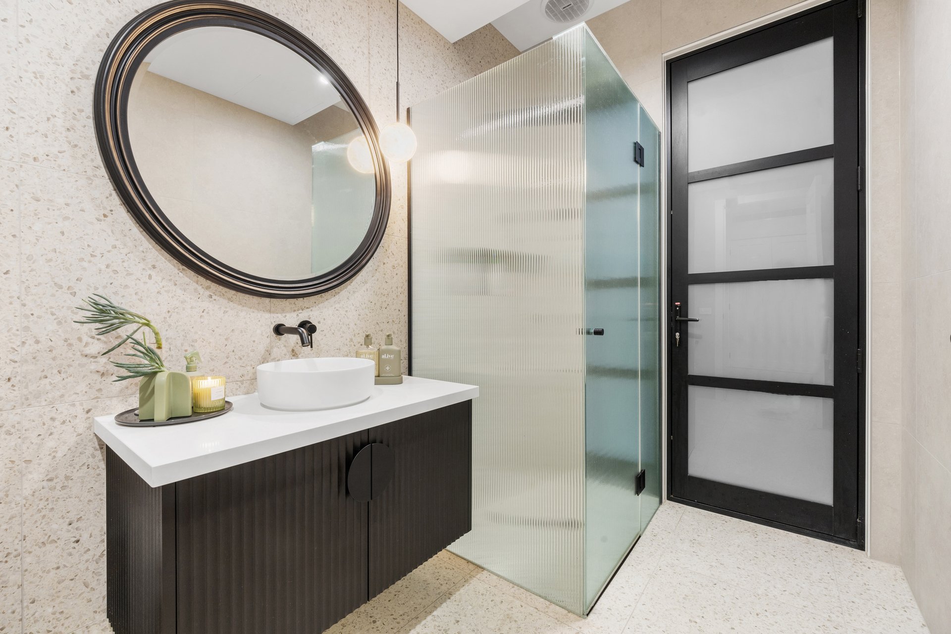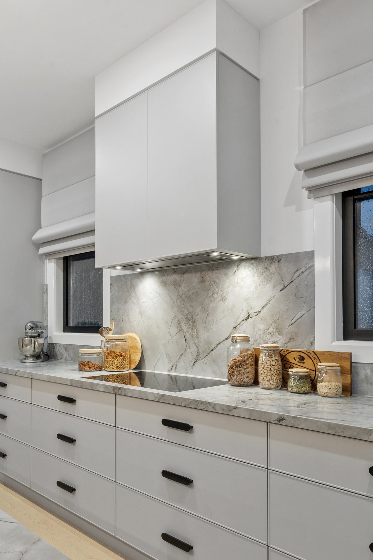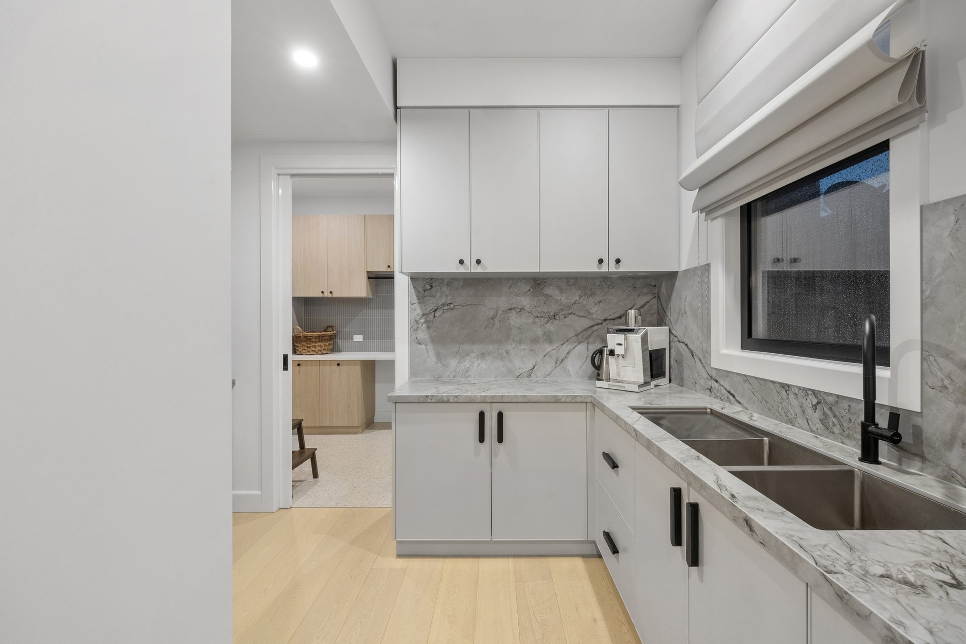 At its centre, an expansive open-plan kitchen, living and dining domain forms a stunning hub for entertaining and relaxed family living. The gourmet kitchen is appointed with Neolith stone benchtops, sleek two-pack cabinetry and a full suite of Miele appliances, complemented by a butler's pantry with Fisher and Paykel double dishwasher drawers. Custom steel framed windows and doors maximise natural light and connect seamlessly to the outdoors.
