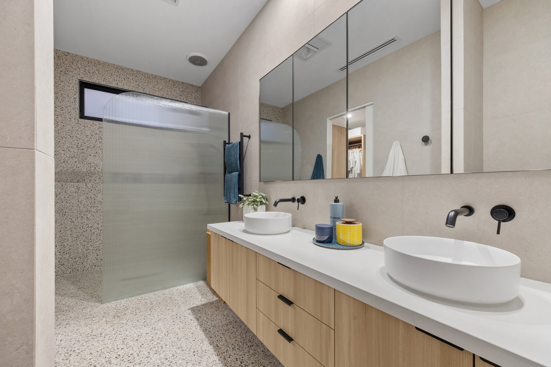 Accommodation is flexible and refined, with a ground floor main bedroom featuring walk-in robe and ensuite, plus a custom fitted bedroom or study. Upstairs offers additional bedrooms, a retreat and a central bathroom.