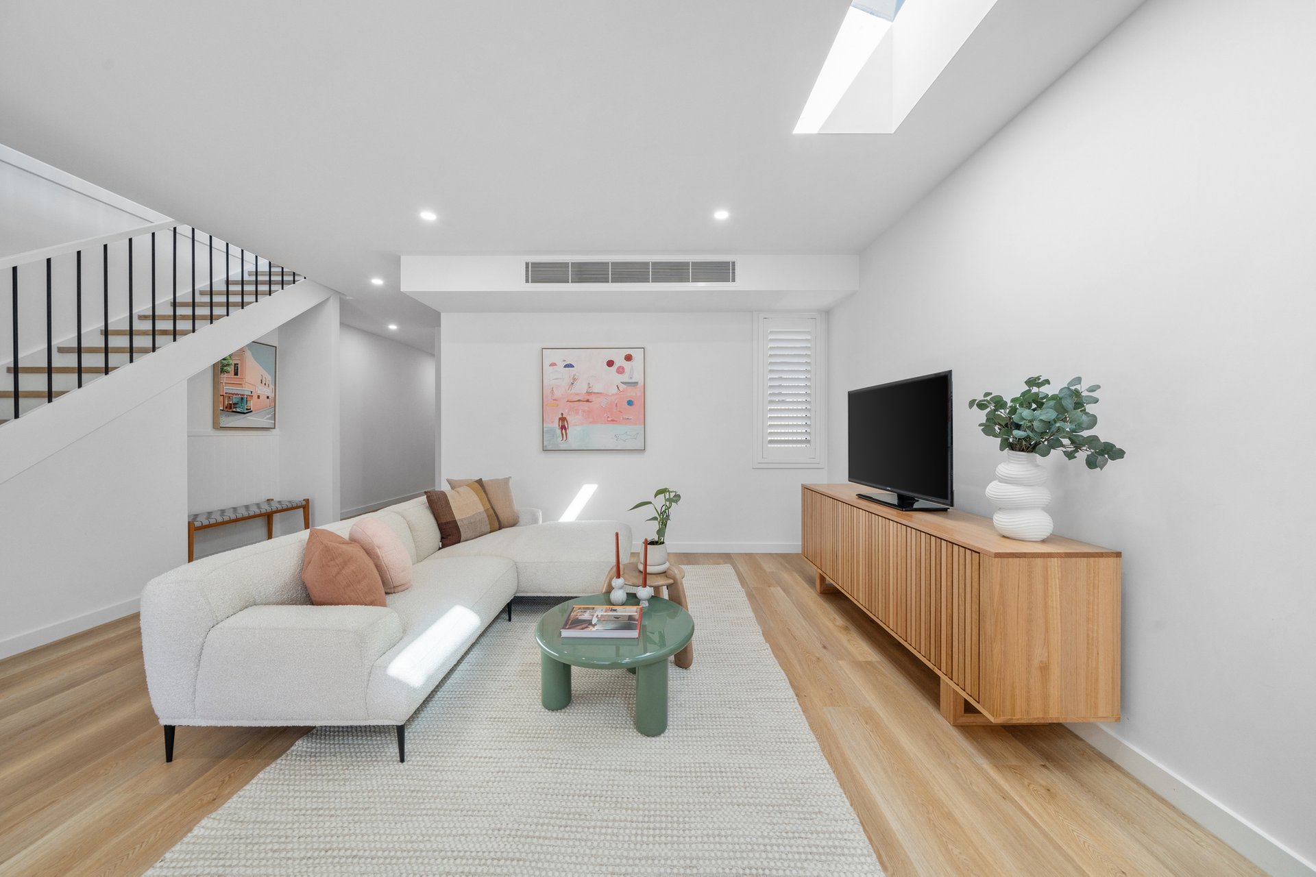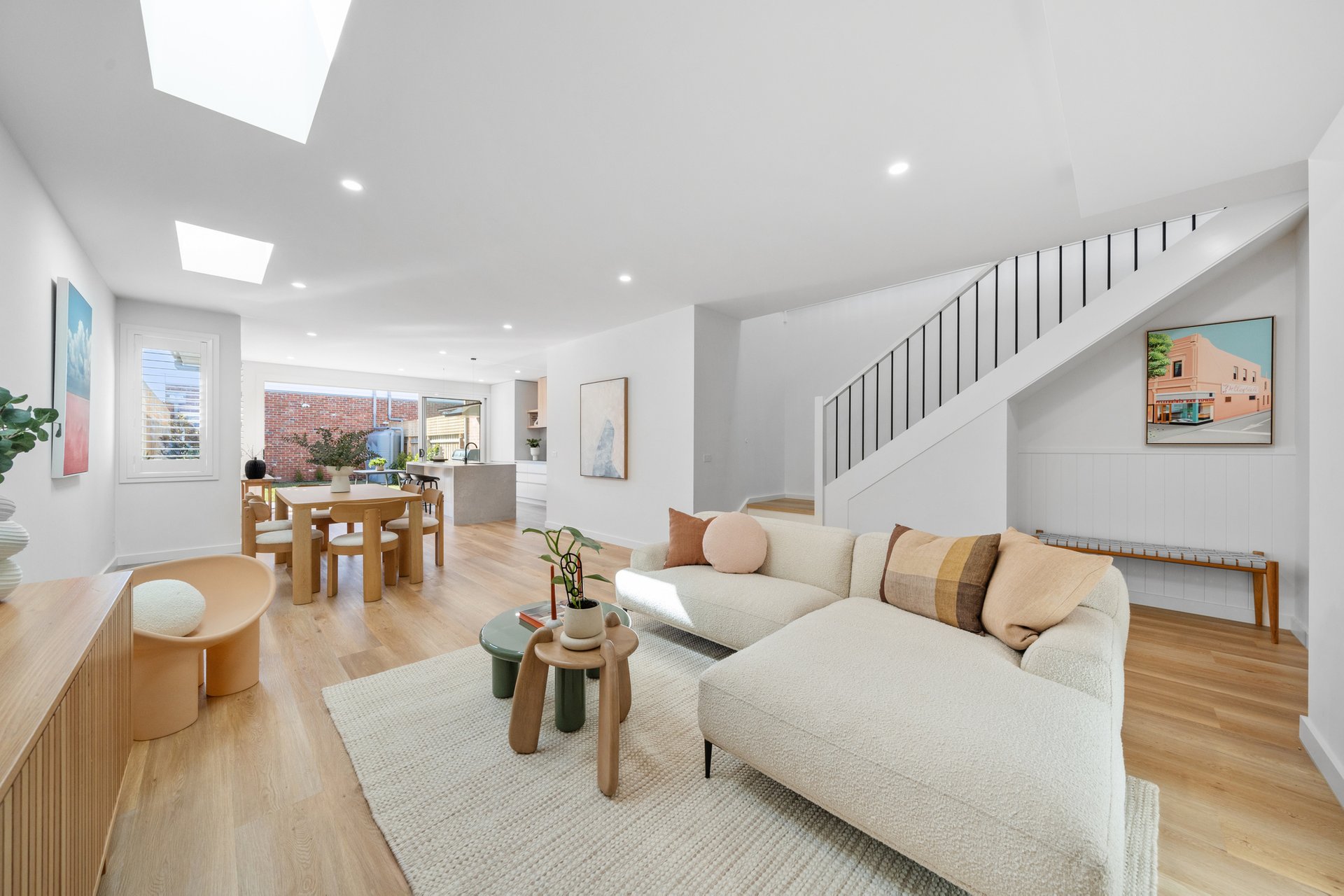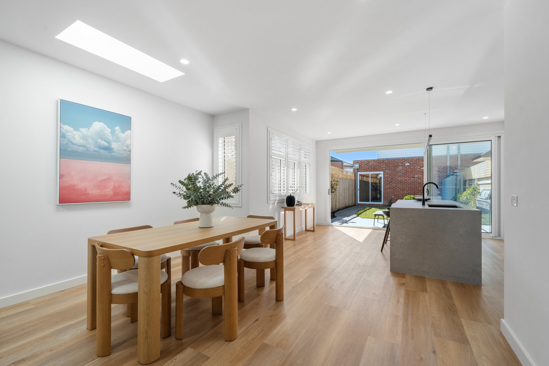 The open-plan kitchen, dining, and living area is the heart of the home, enhanced by skylights that fill the space with natural light. Dual ovens, a dishwasher, butler’s pantry, stone benchtops, built-in shelving, and breakfast bar seating combine functionality with striking design. Timber floors flow throughout, complemented by ample storage and air conditioning in every bedroom.