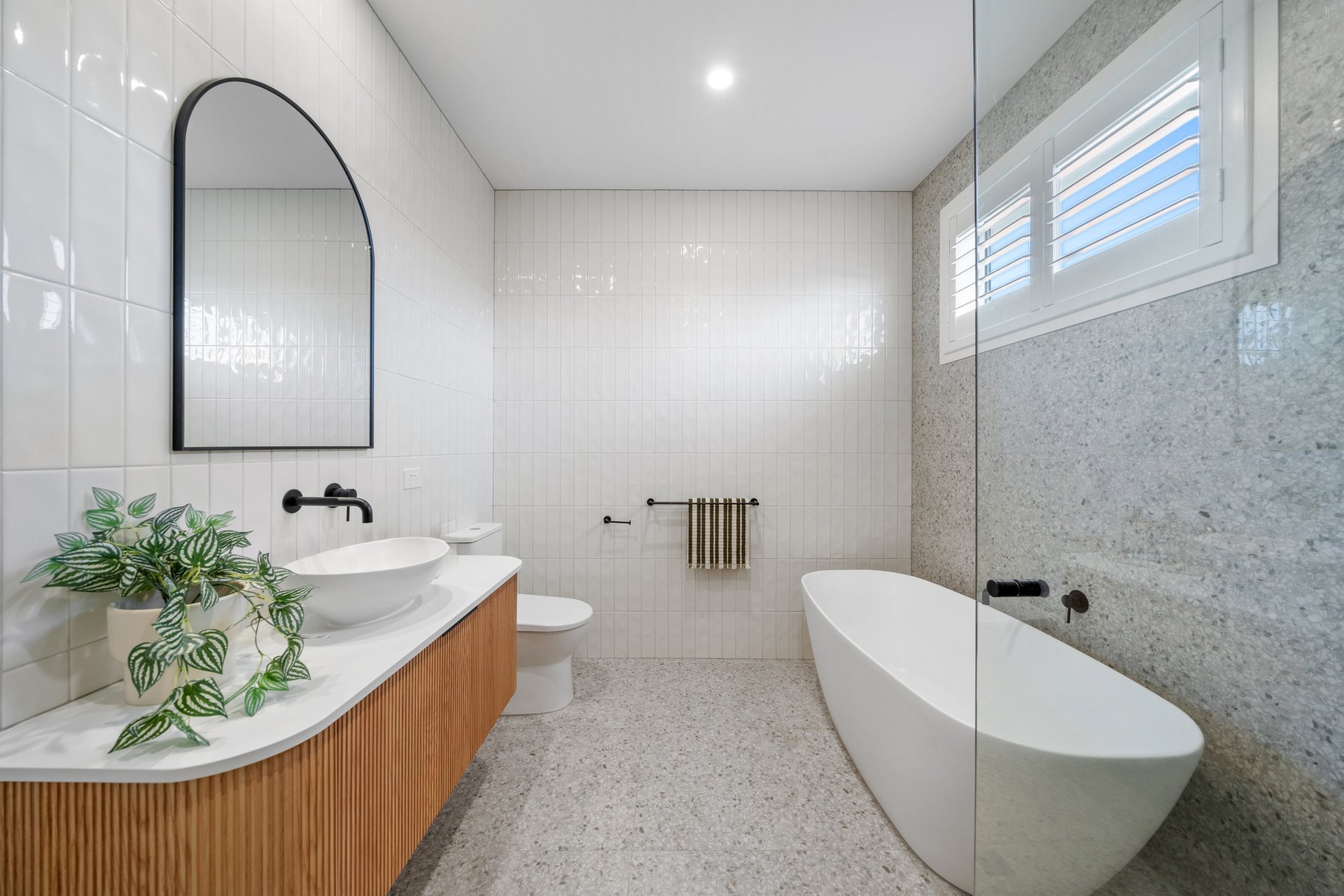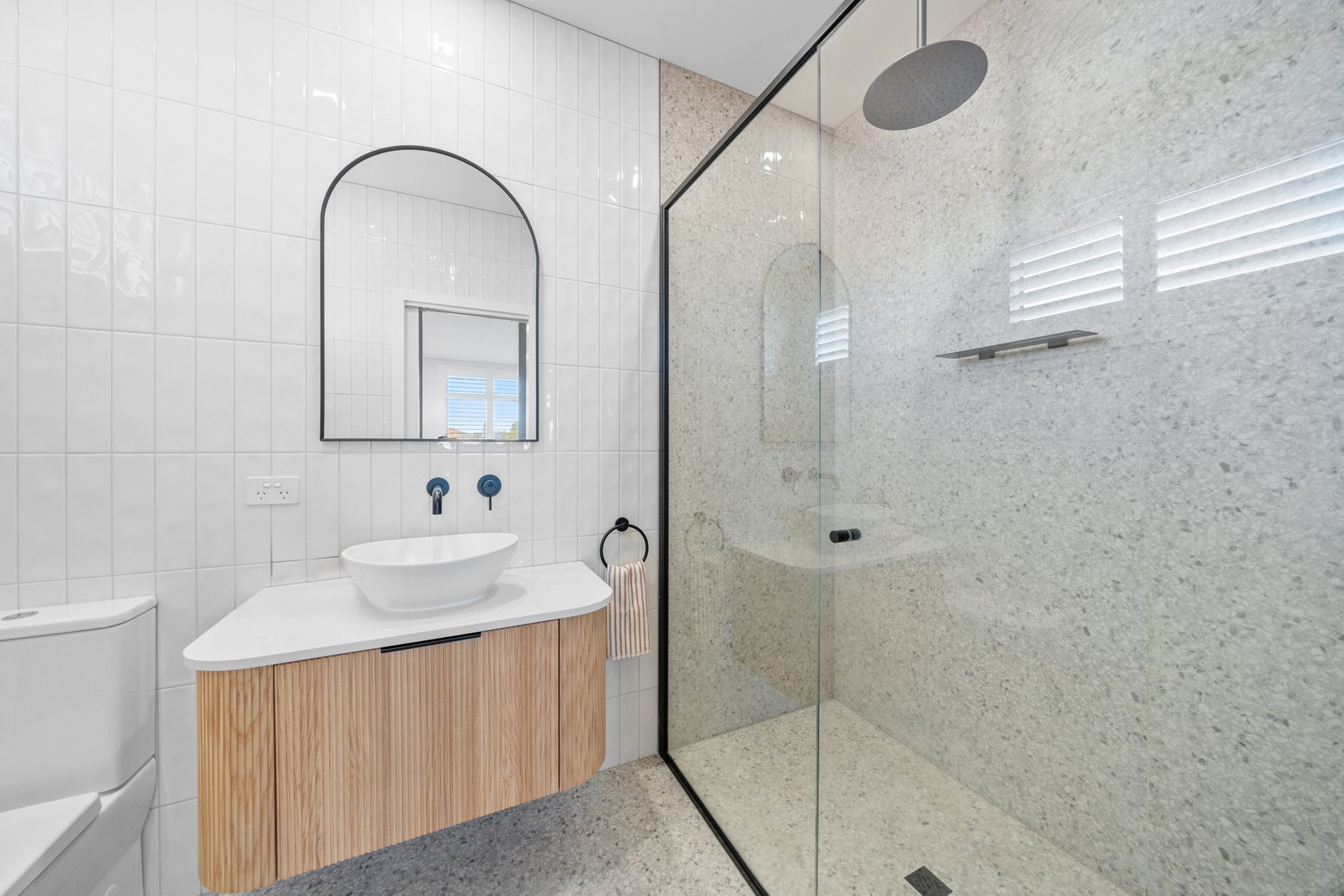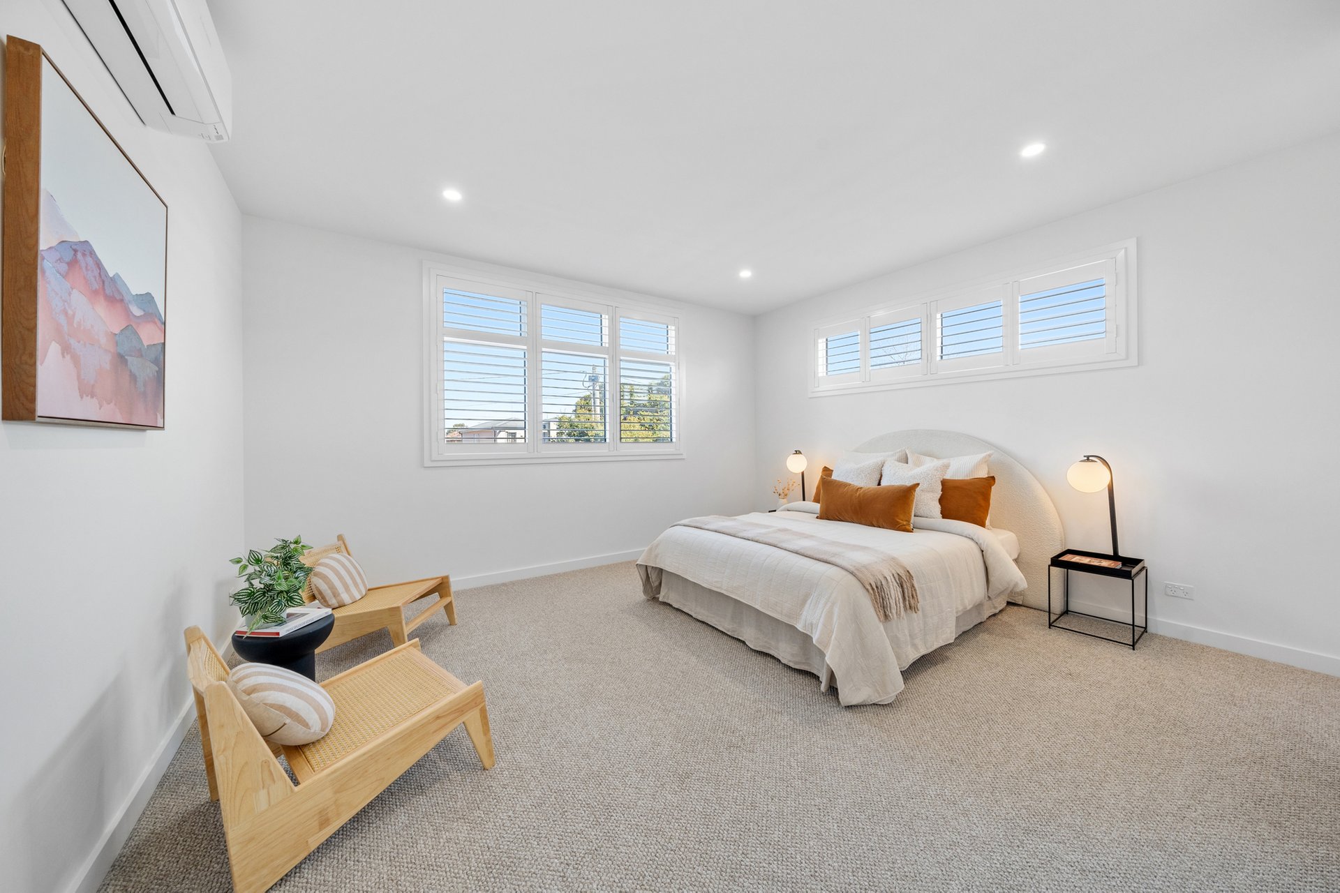 The open-plan kitchen, dining, and living area is the heart of the home, enhanced by skylights that fill the space with natural light. Dual ovens, a dishwasher, butler’s pantry, stone benchtops, built-in shelving, and breakfast bar seating combine functionality with striking design. Timber floors flow throughout, complemented by ample storage and air conditioning in every bedroom.