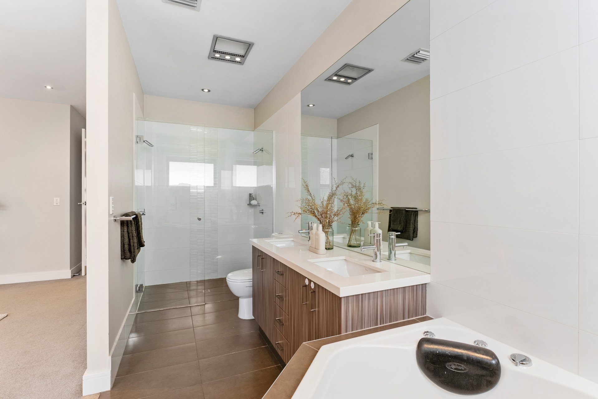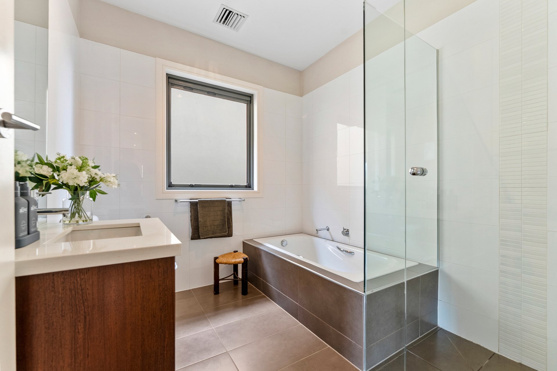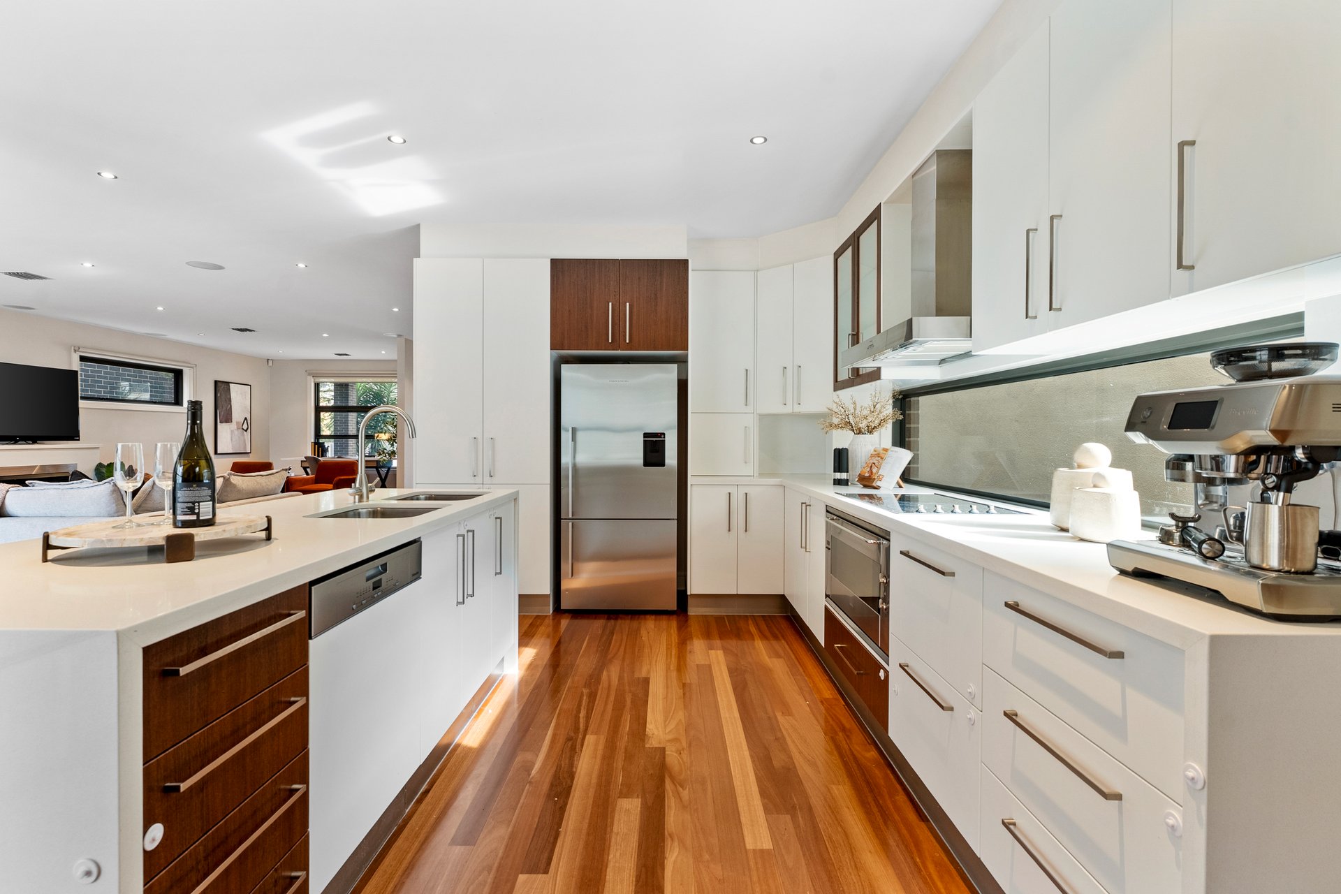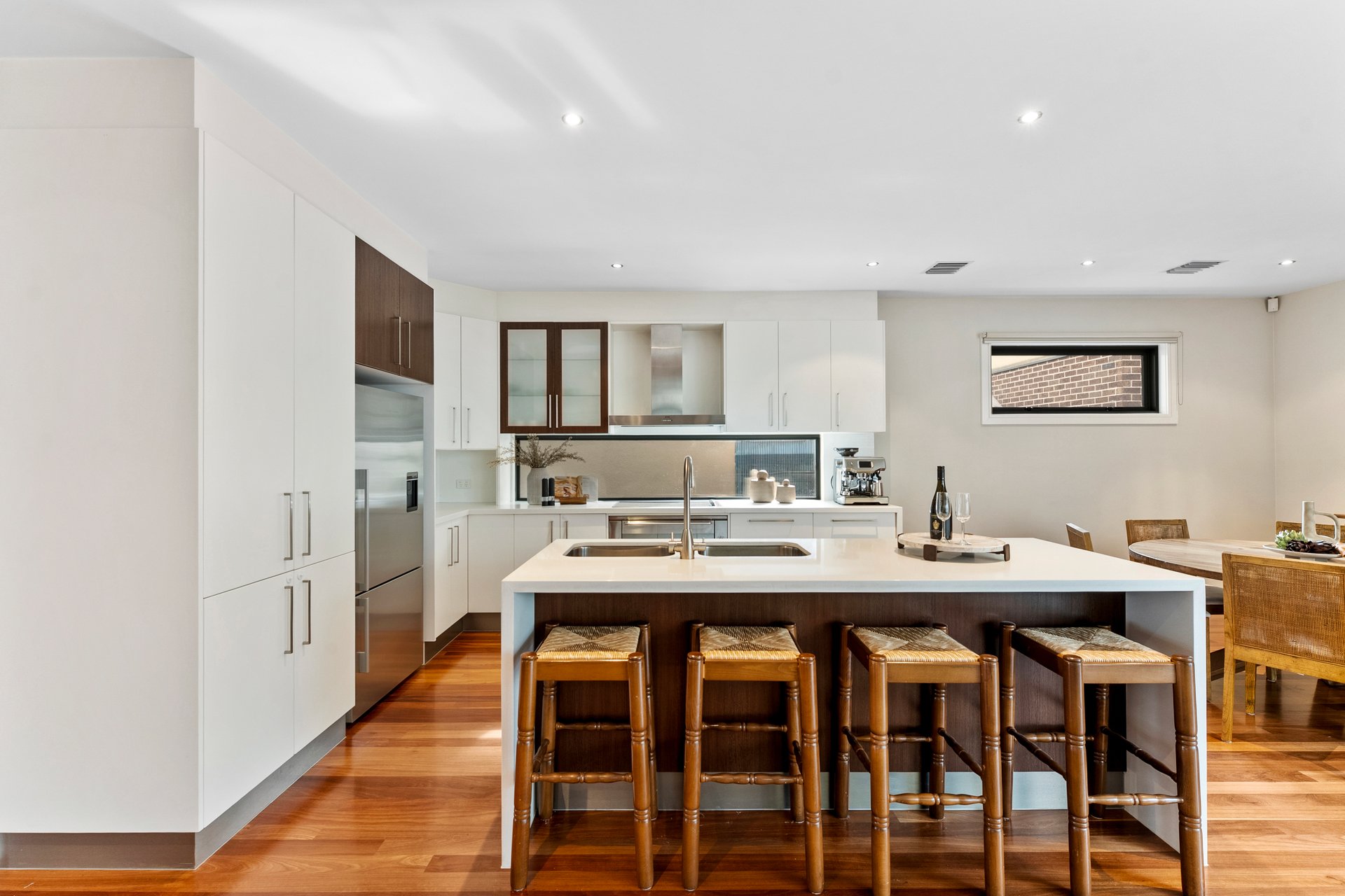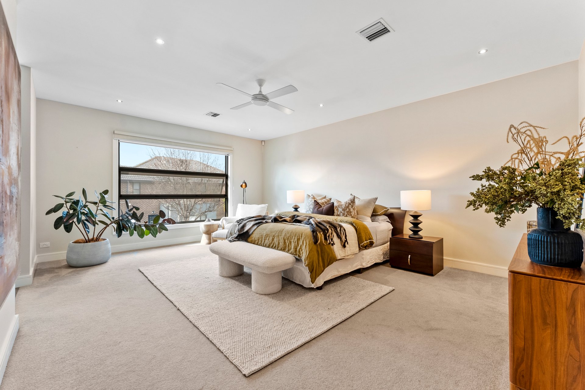 While a palatial main offers a sanctuary for parents, with walk-in-robe and opulent ensuite flaunting luxe spa bath, double shower and vanity. A robed bedroom, powder room and laundry complete the lower level.