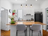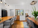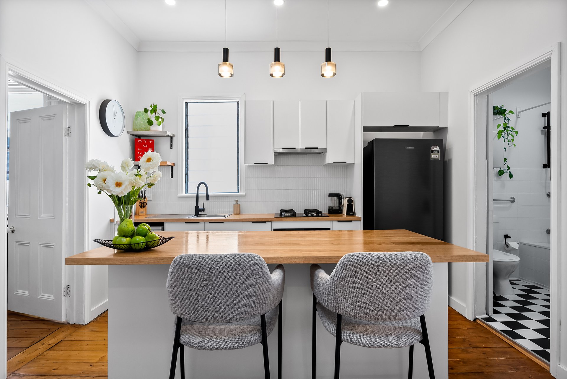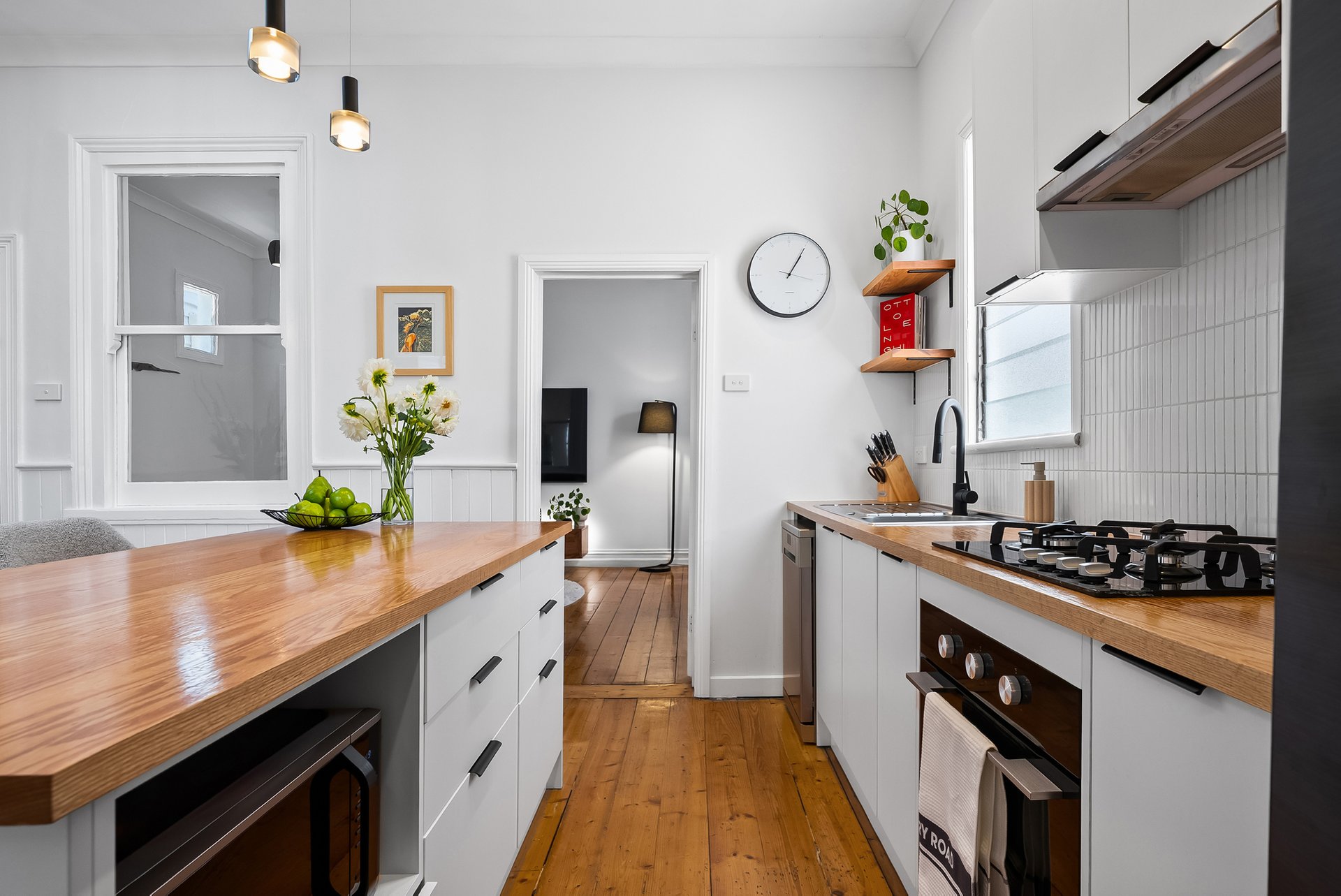 The updated kitchen is filled with light from a large skylight and features timber benchtops that pair beautifully with the flooring. Bright white cabinetry and modern appliances, support a practical and comfortable cooking environment, with an open-plan connection to the dining area suited to family entertaining.