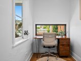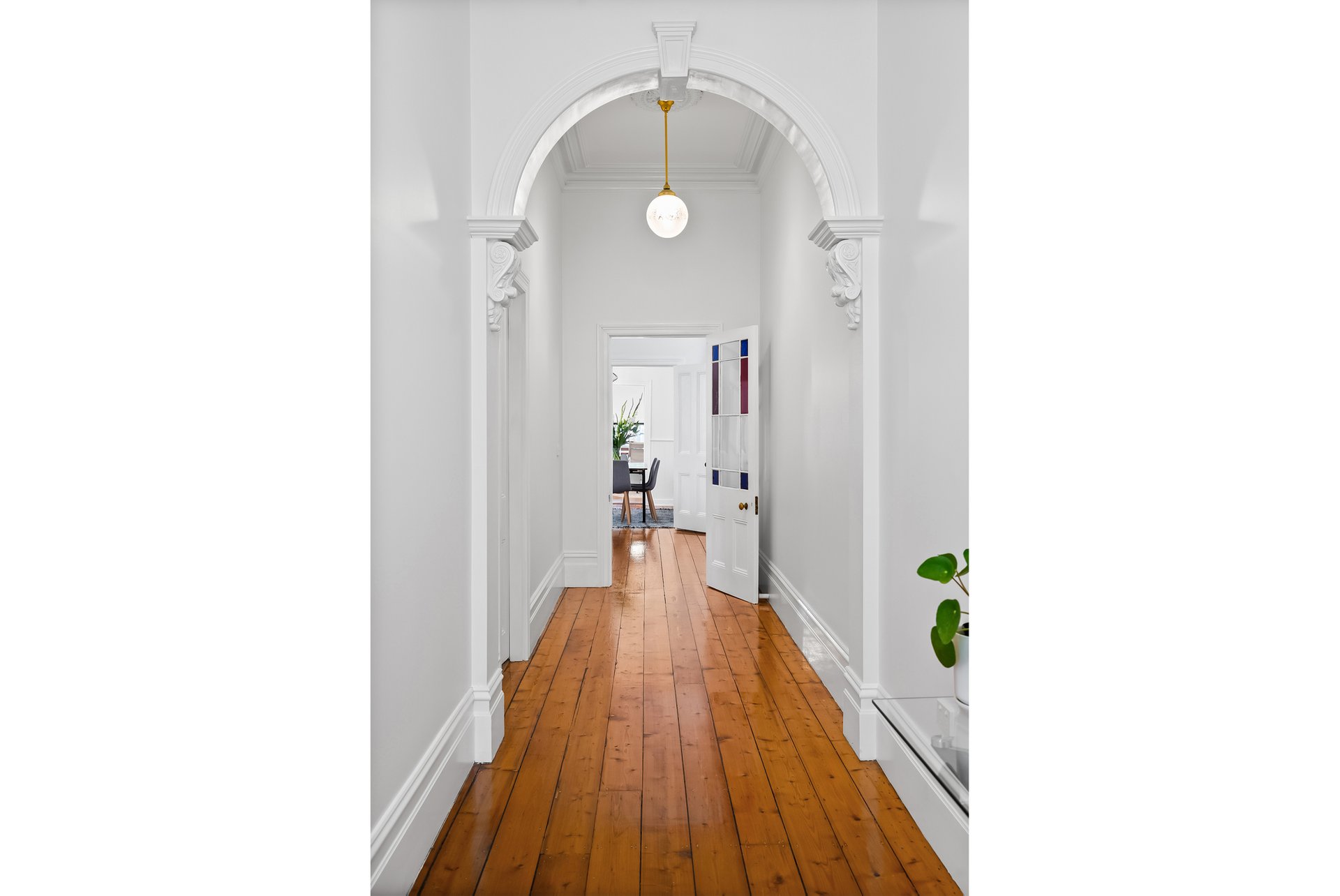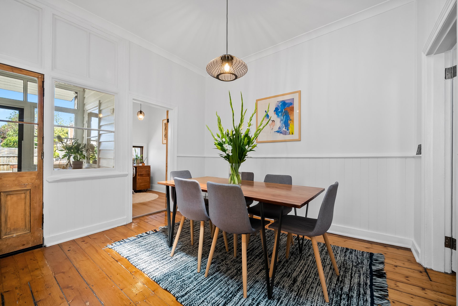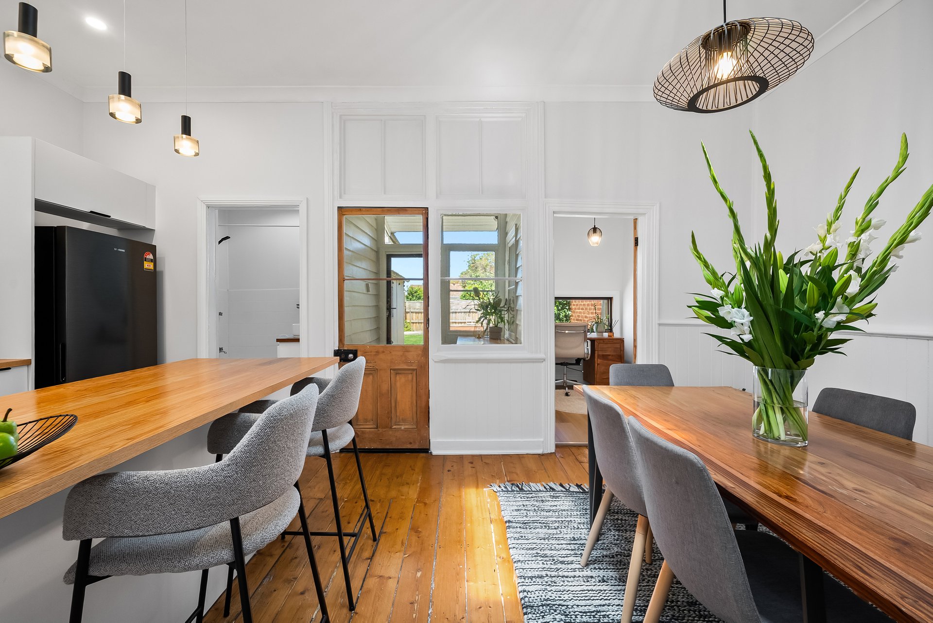 At the heart of the home is a central living room, positioned mid-house to create a natural hub for everyday living. Large windows allow natural light to flood the space, complemented by smaller windows that maintain brightness throughout the day. Original timber flooring adds warmth and continuity, with the room opening from the corridor to create an inviting and welcoming feel. The dining room sits separately yet remains well connected to the kitchen, with original doors and windows linking the old and new sections of the home seamlessly.