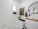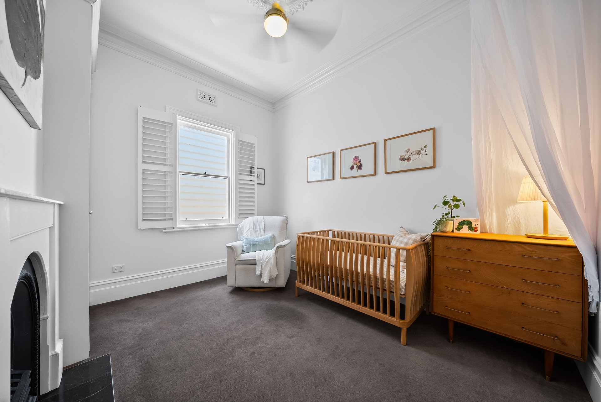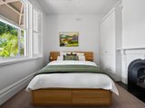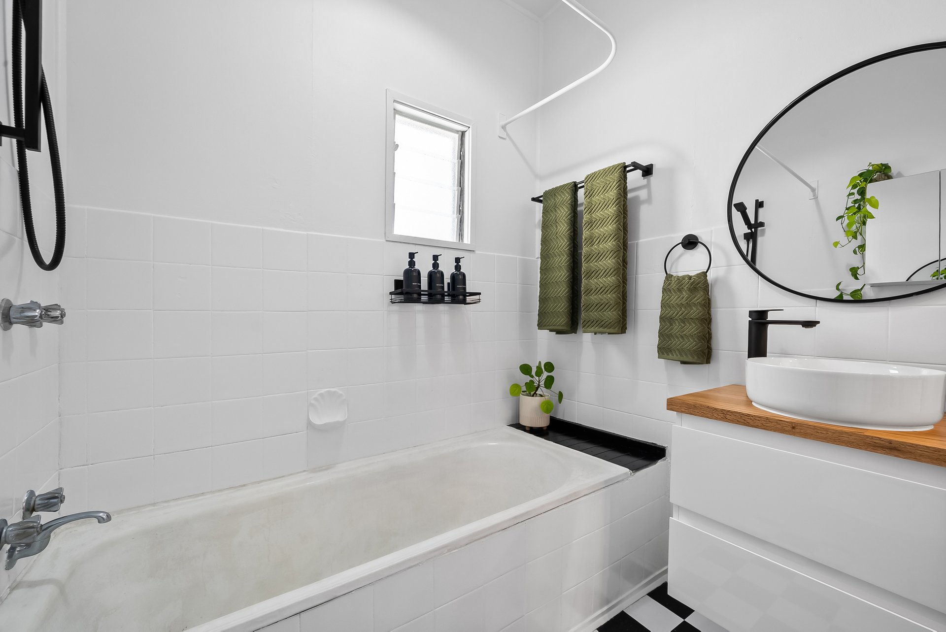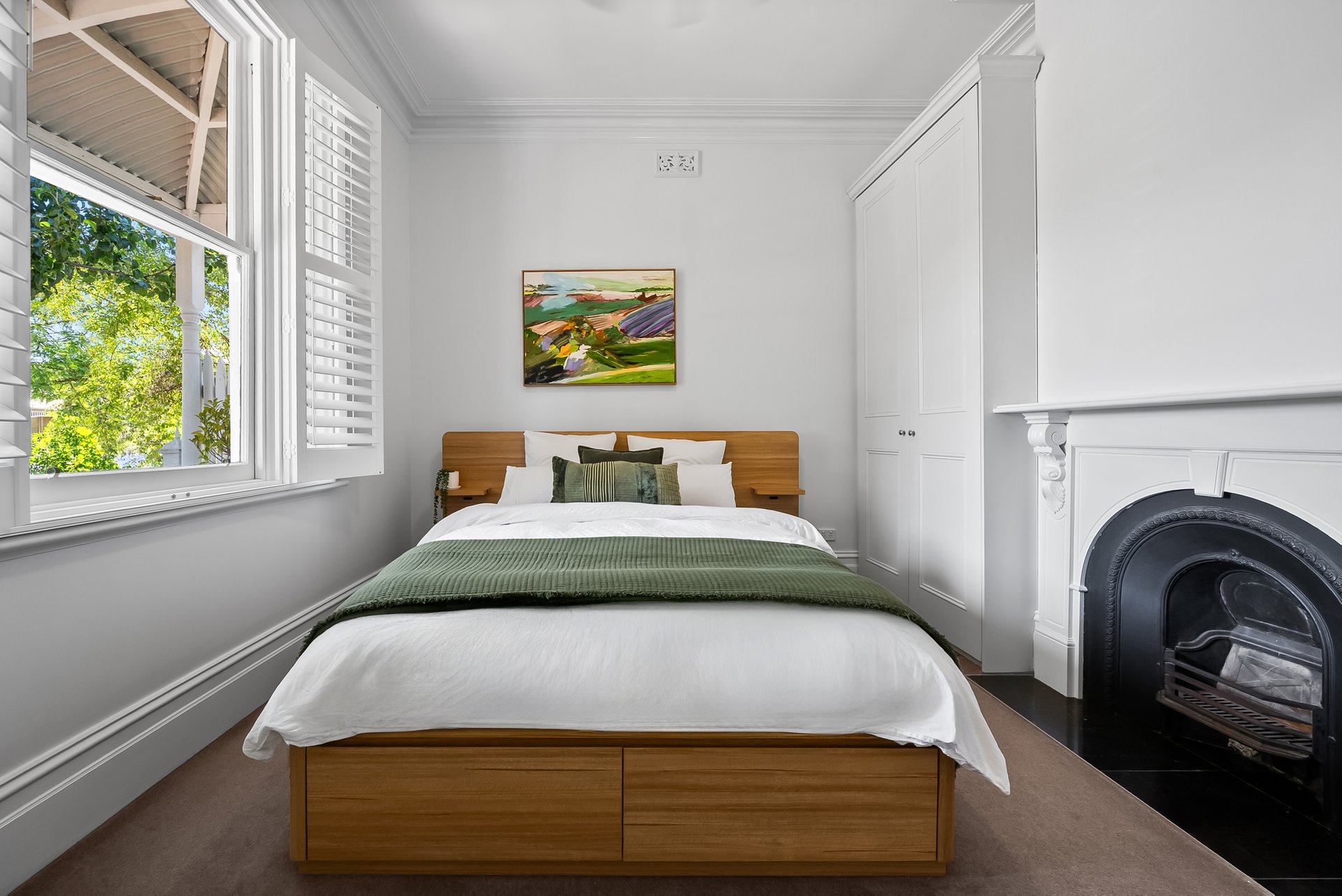 Accommodation includes two generous bedrooms, both featuring fireplaces, large original windows and modern built-in cabinetry for everyday storage. The bathroom includes a bath and shower with an updated showerhead, a timber vanity with freestanding basin, and distinctive chequered tiling.
