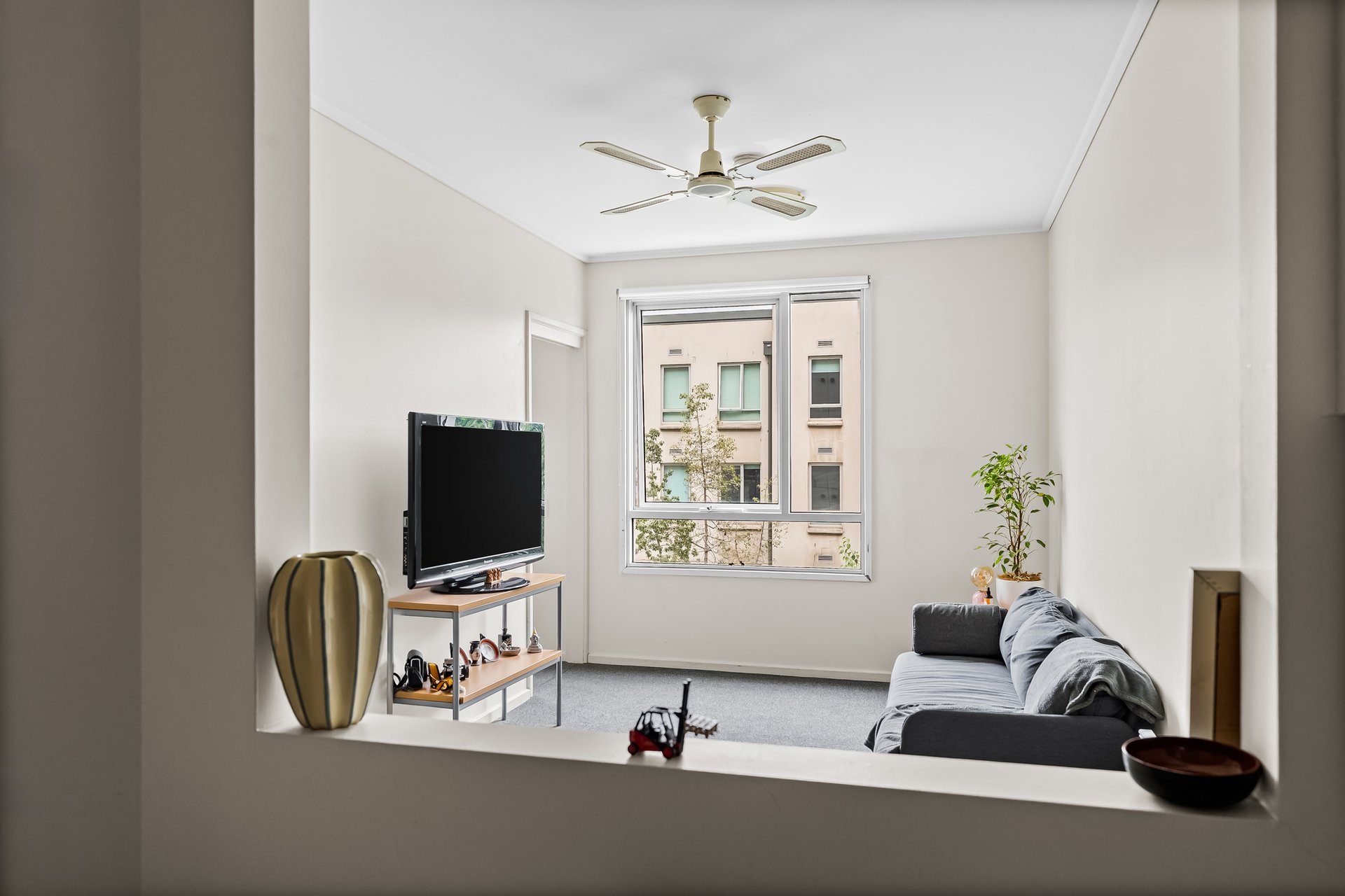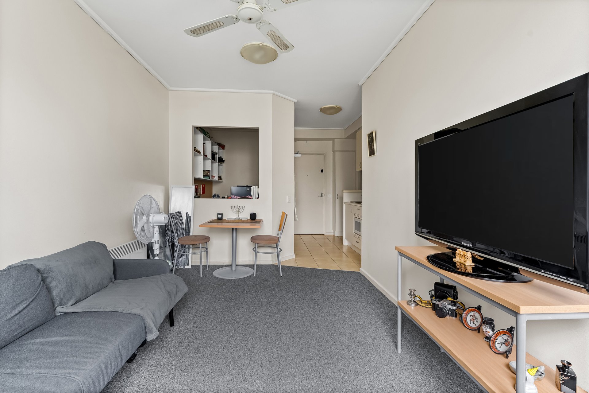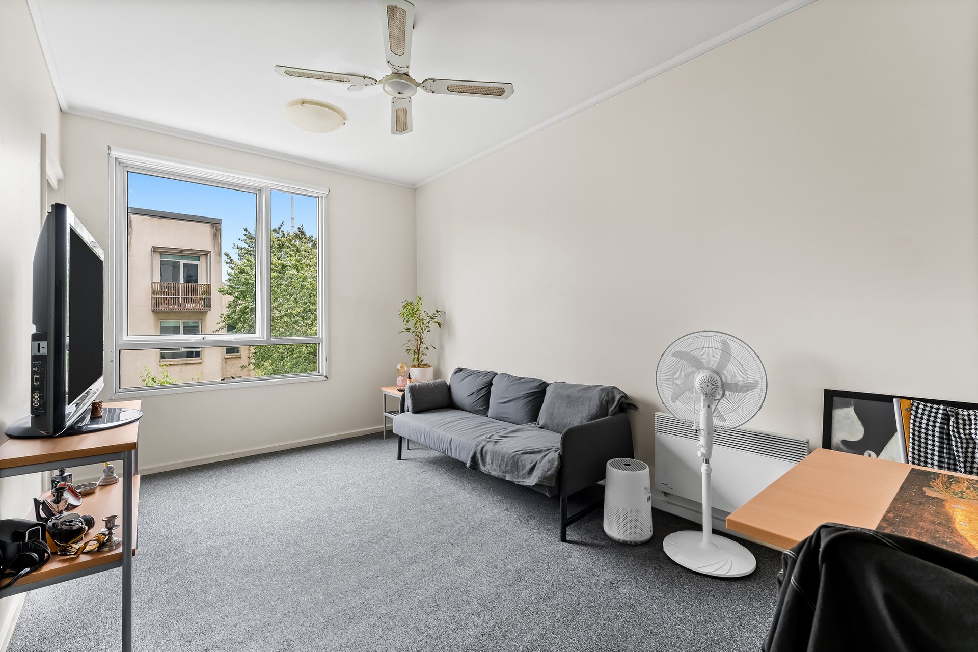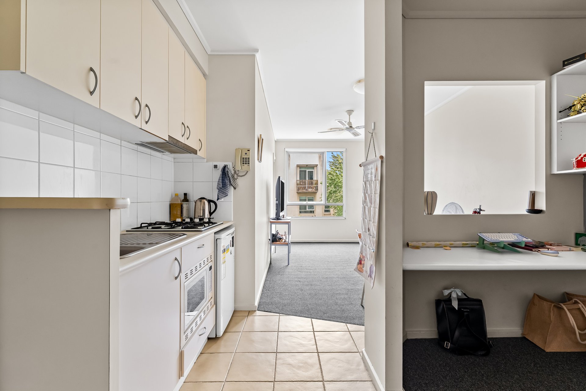 Designed for comfort and functionality, the apartment features a well-considered layout with a carpeted living and dining zone, ceiling fan and a large window overlooking the internal courtyard, allowing natural light to fill the space. The adjoining kitchen is practical and efficient, equipped with a four-burner gas cooktop, tiled flooring and ample storage to support everyday living.