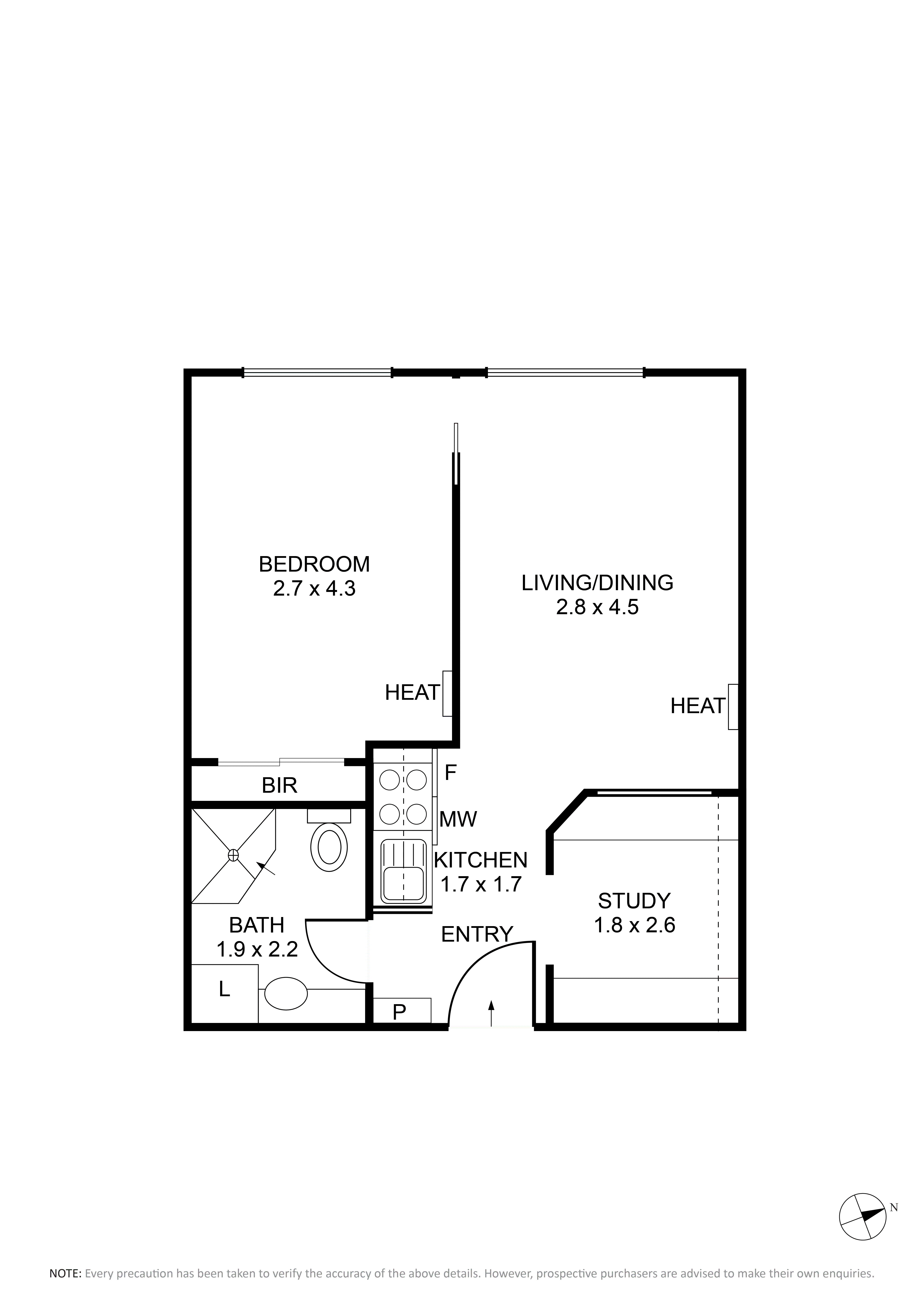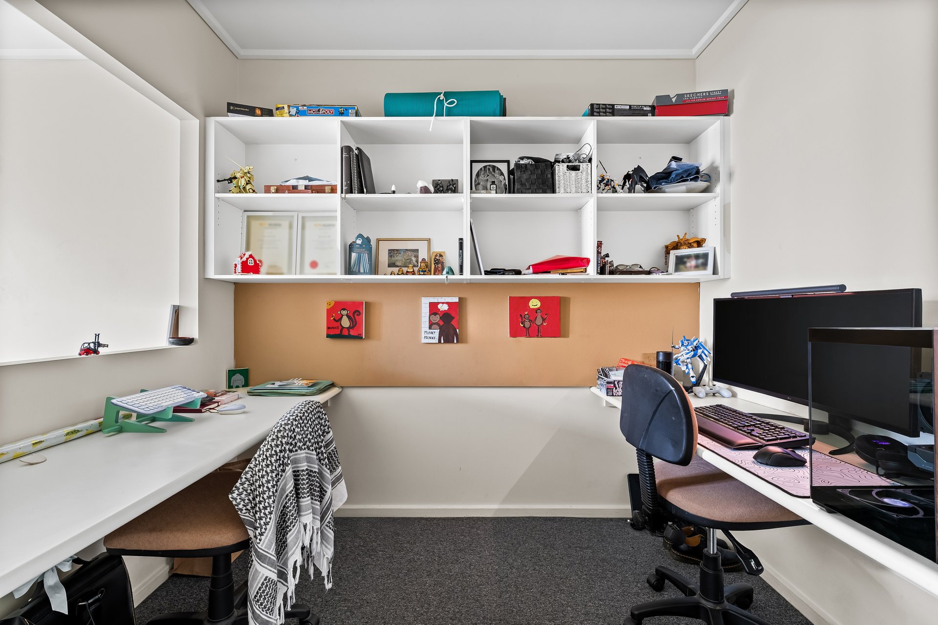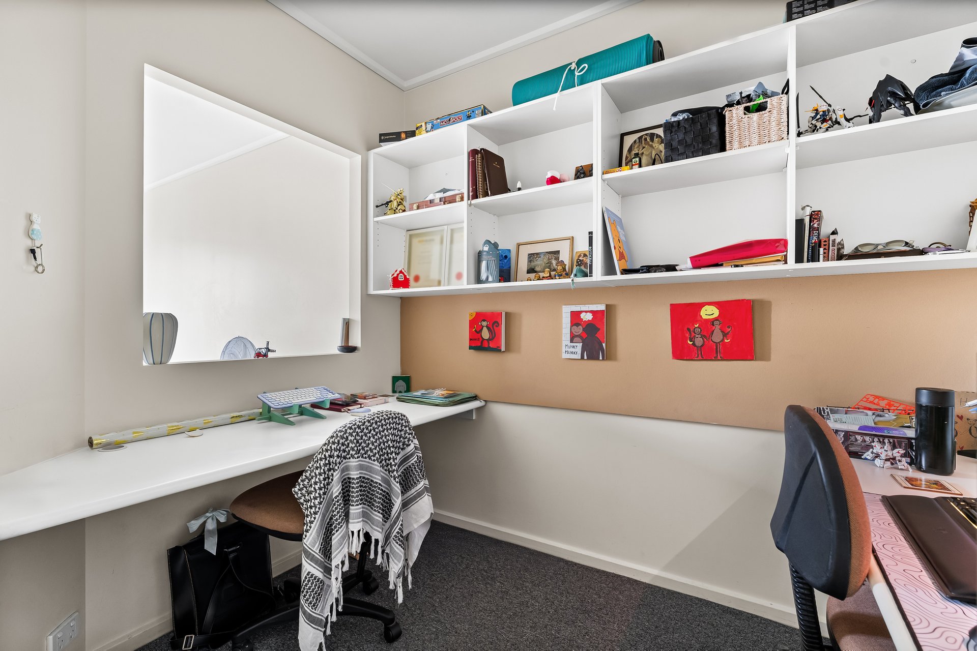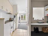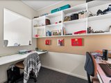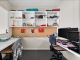 The bedroom is generously proportioned and includes built-in robes and a window to the courtyard, creating a quiet and comfortable retreat. A tiled bathroom services the apartment, while a dedicated study with two built-in desks and shelving provides an ideal work-from-home setup or study zone, a valuable inclusion for students or professionals.
