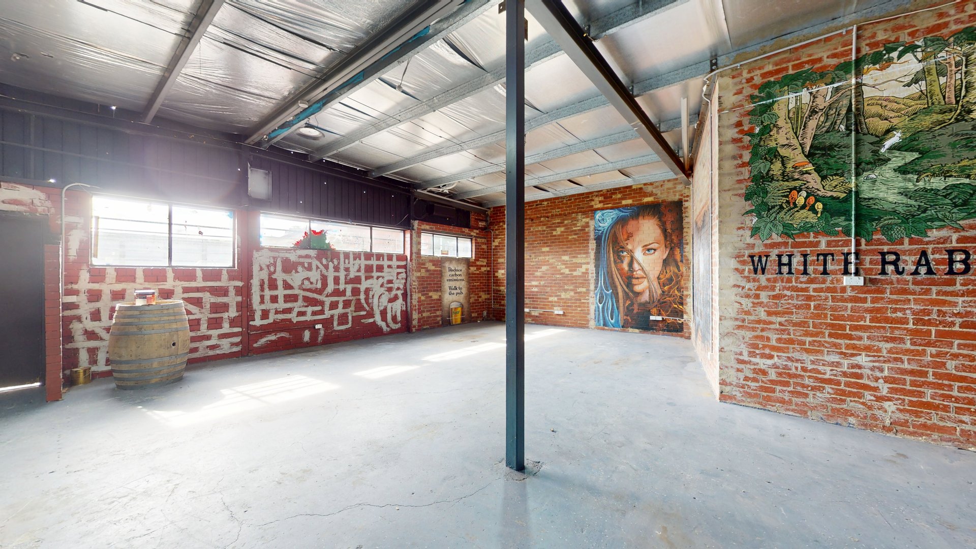 • Expansive open-plan warehouse area with exposed brick and steel beams