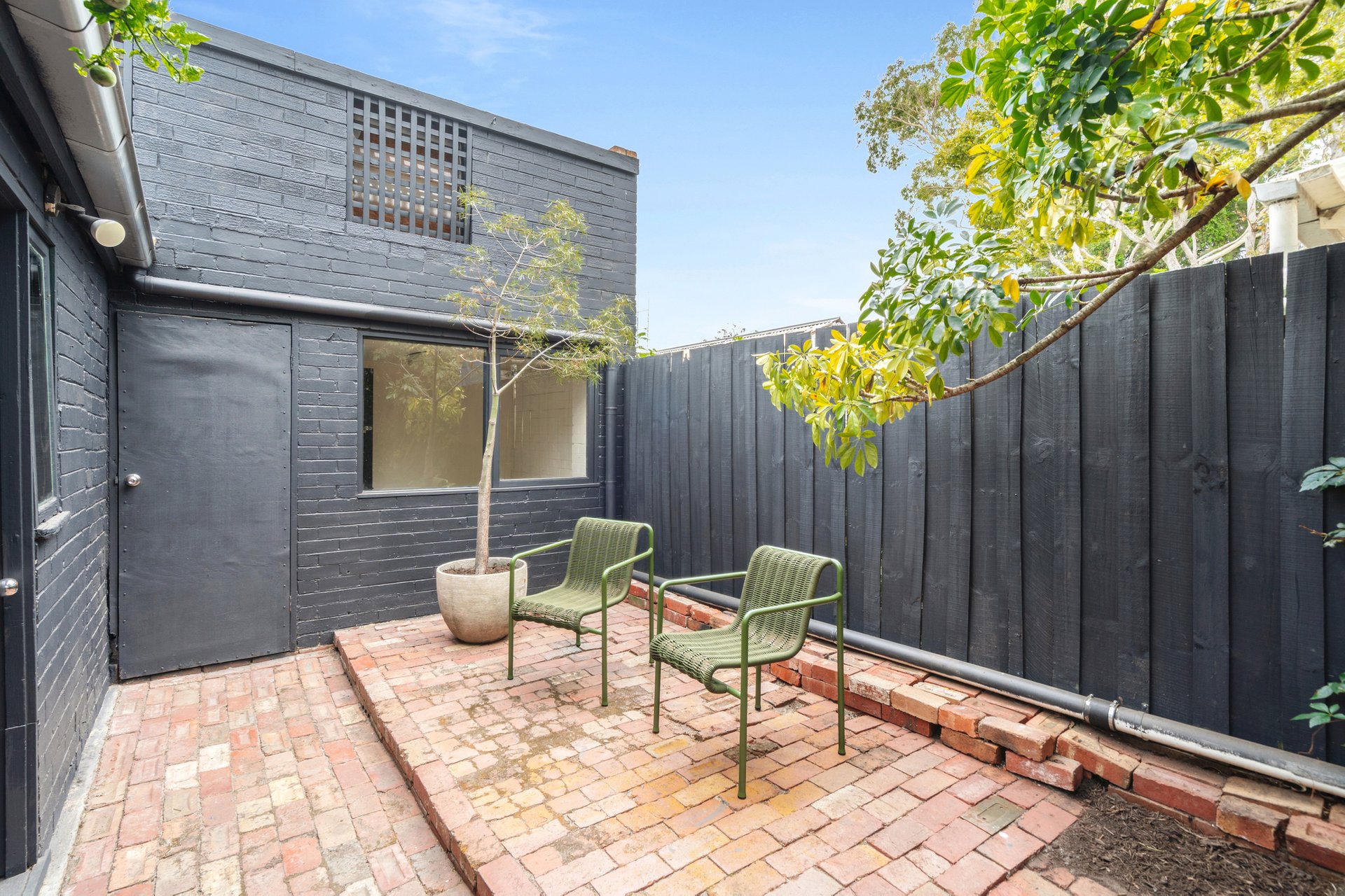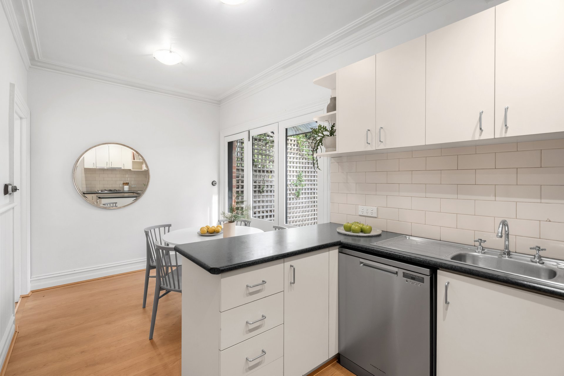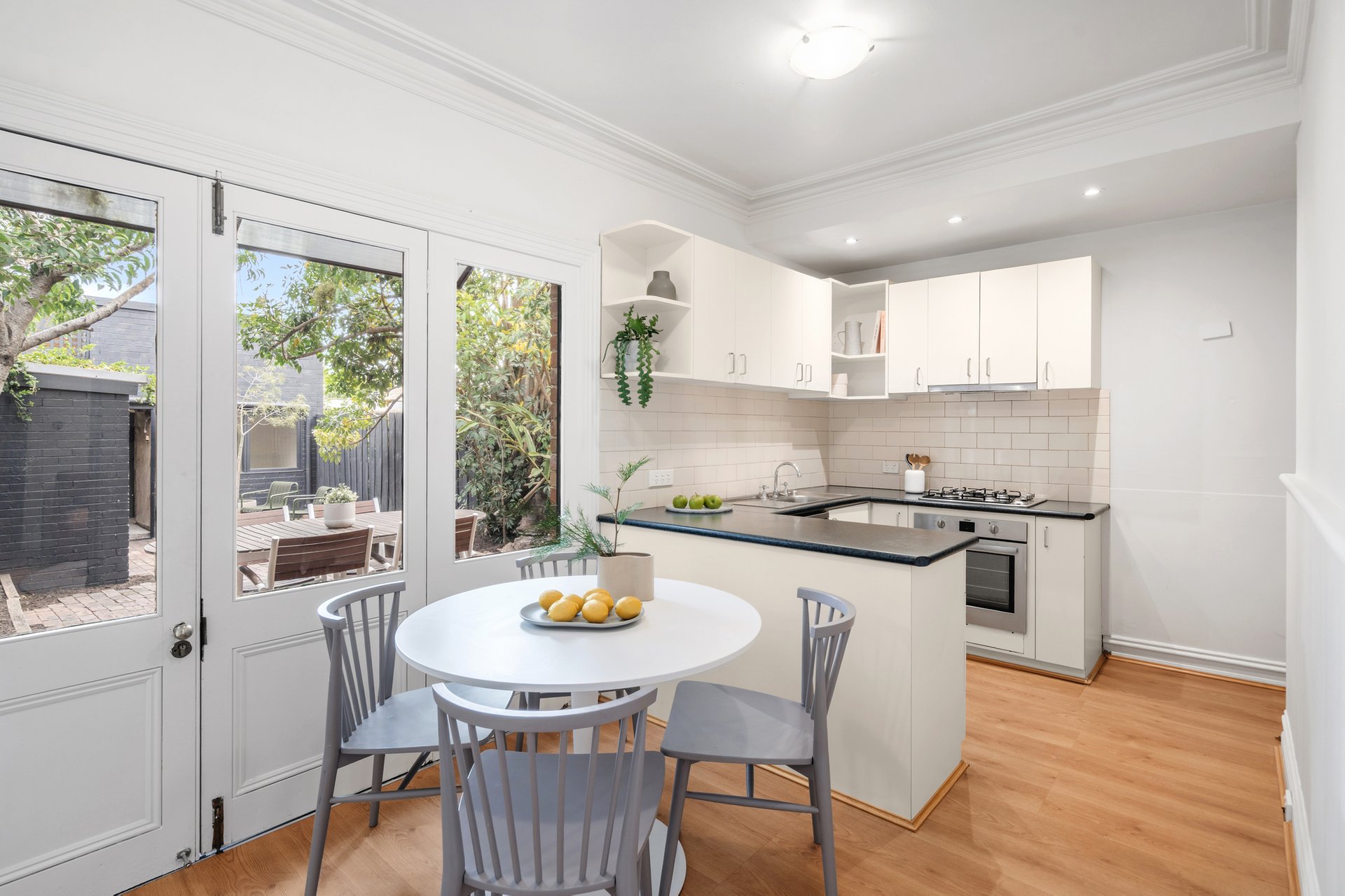 The kitchen and dining zone opens directly to a private, leafy courtyard with established trees, offering a tranquil setting for entertaining friends, long lunches, and relaxed summer evenings. The connection between indoor and outdoor spaces makes everyday living and hosting effortless.