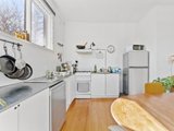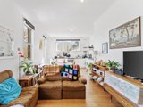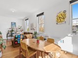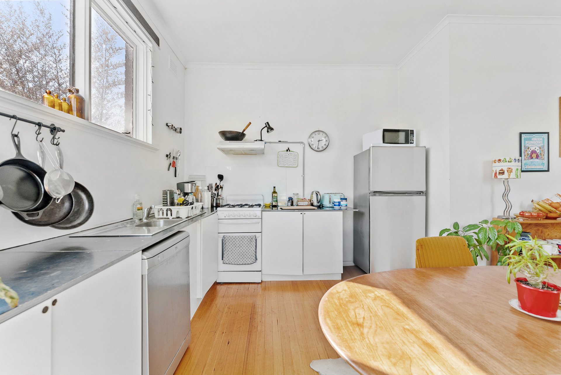 The upper level delivers an apartment-style layout with living, dining, and kitchen spaces flowing together. Large windows overlook a quiet street, a surprising feature in such a central location. Wooden floors enhance the clean flow, and the open-plan kitchen is fitted with a gas cooktop and laminate benchtops.