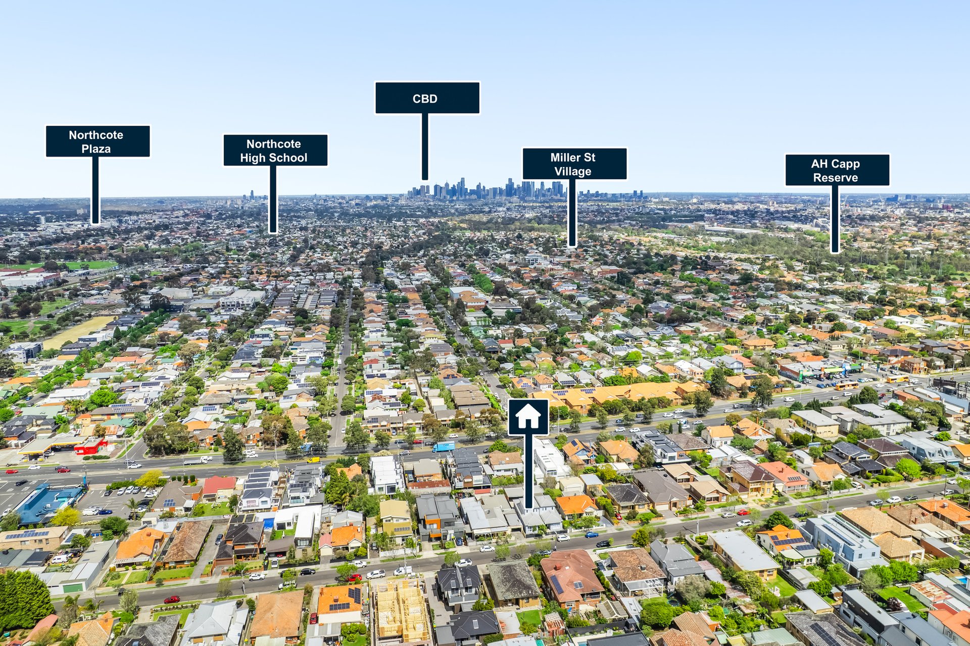 A master/guest bedroom with a walk-in robe and luxe ensuite is privately positioned on the first floor, and opens to a private balcony offering city glimpses, making it an ideal retreat from the main living area, while chic laundry/powder rooms, heating/cooling and secure double carport accessed via right-of way offer high-end modern living. Near amenities that include Gilbert and St Georges Road trams, Bell Station, well-regarded schools, Preston Market and High Street’s cosmopolitan shopping, restaurants and cafes. A must see home!