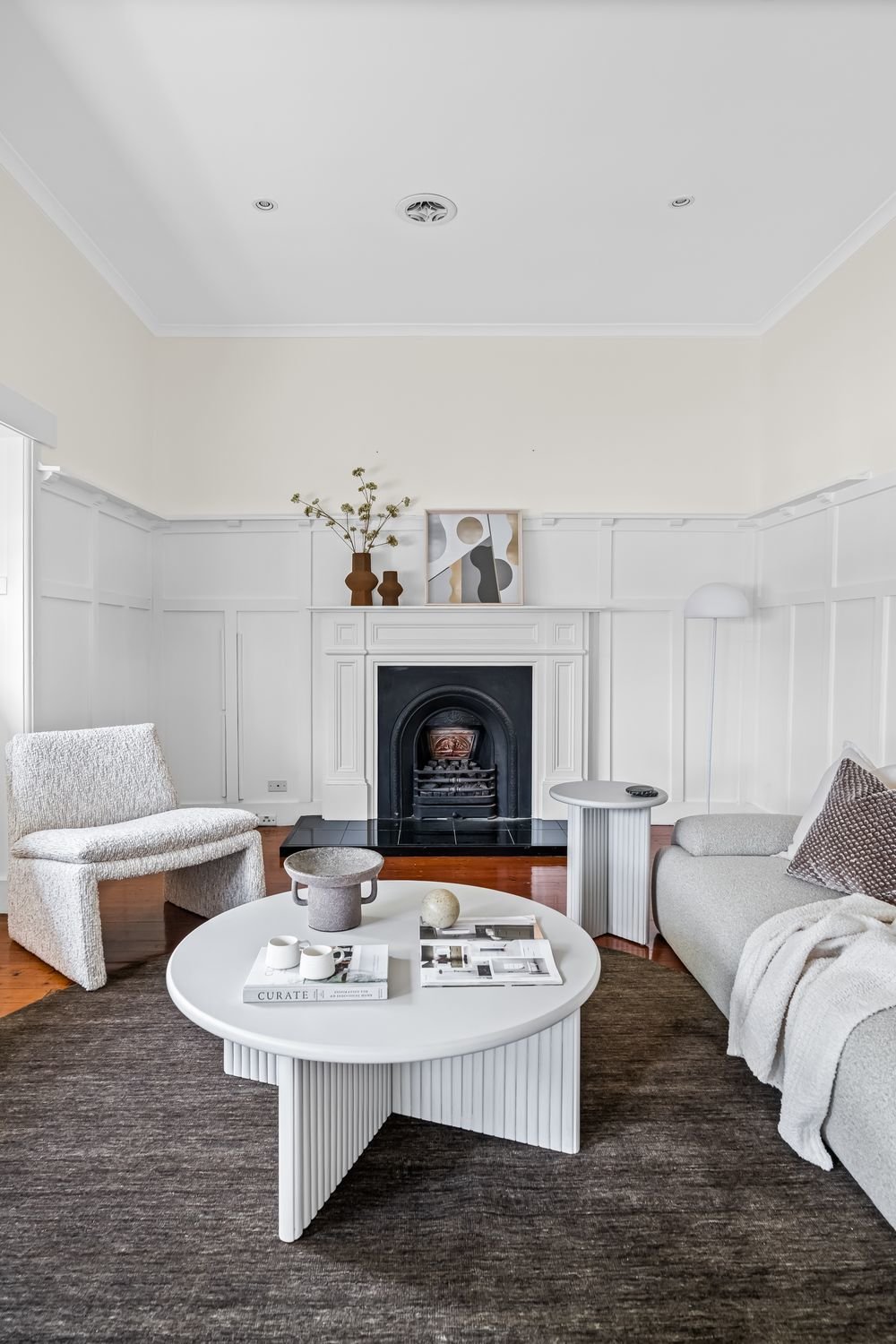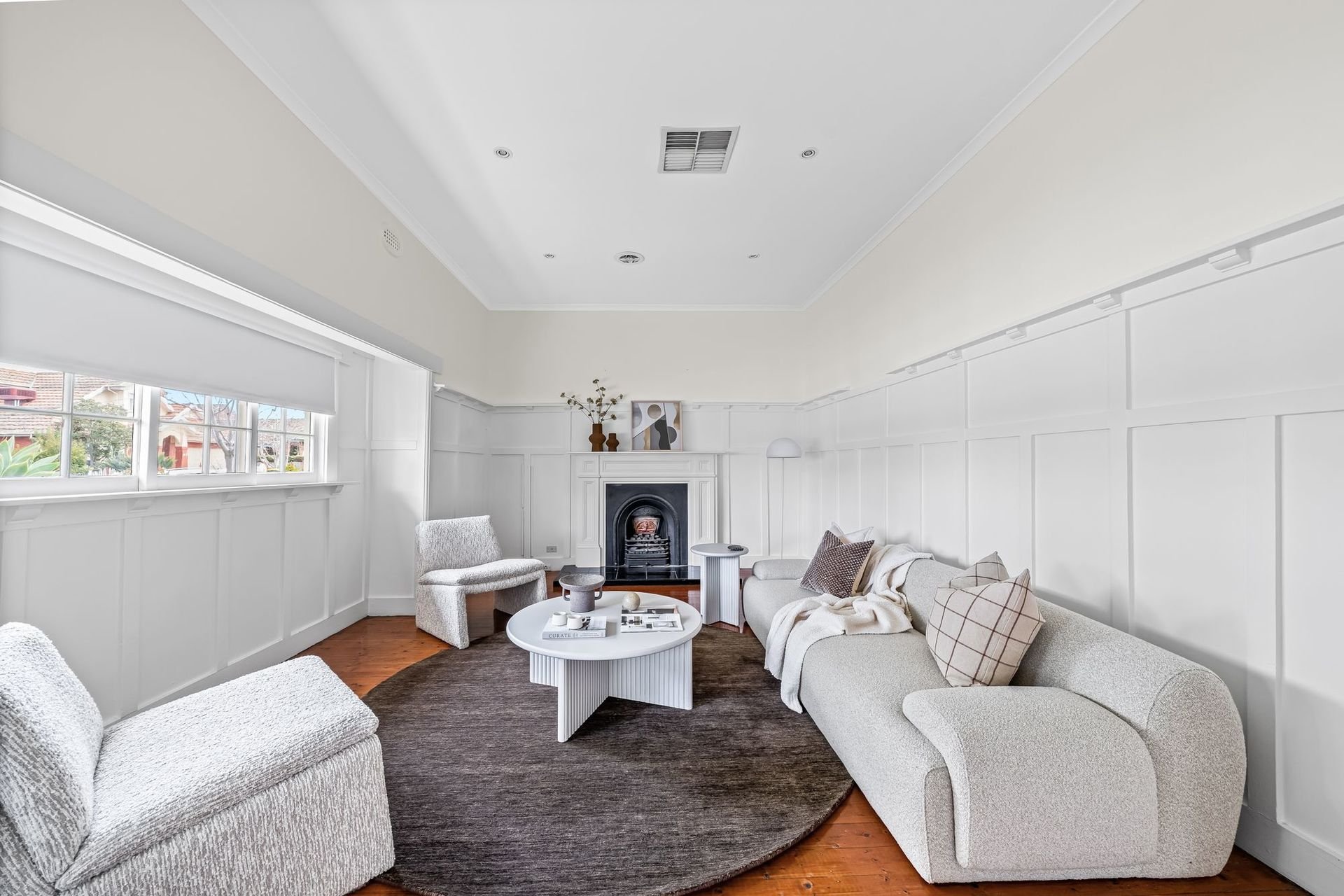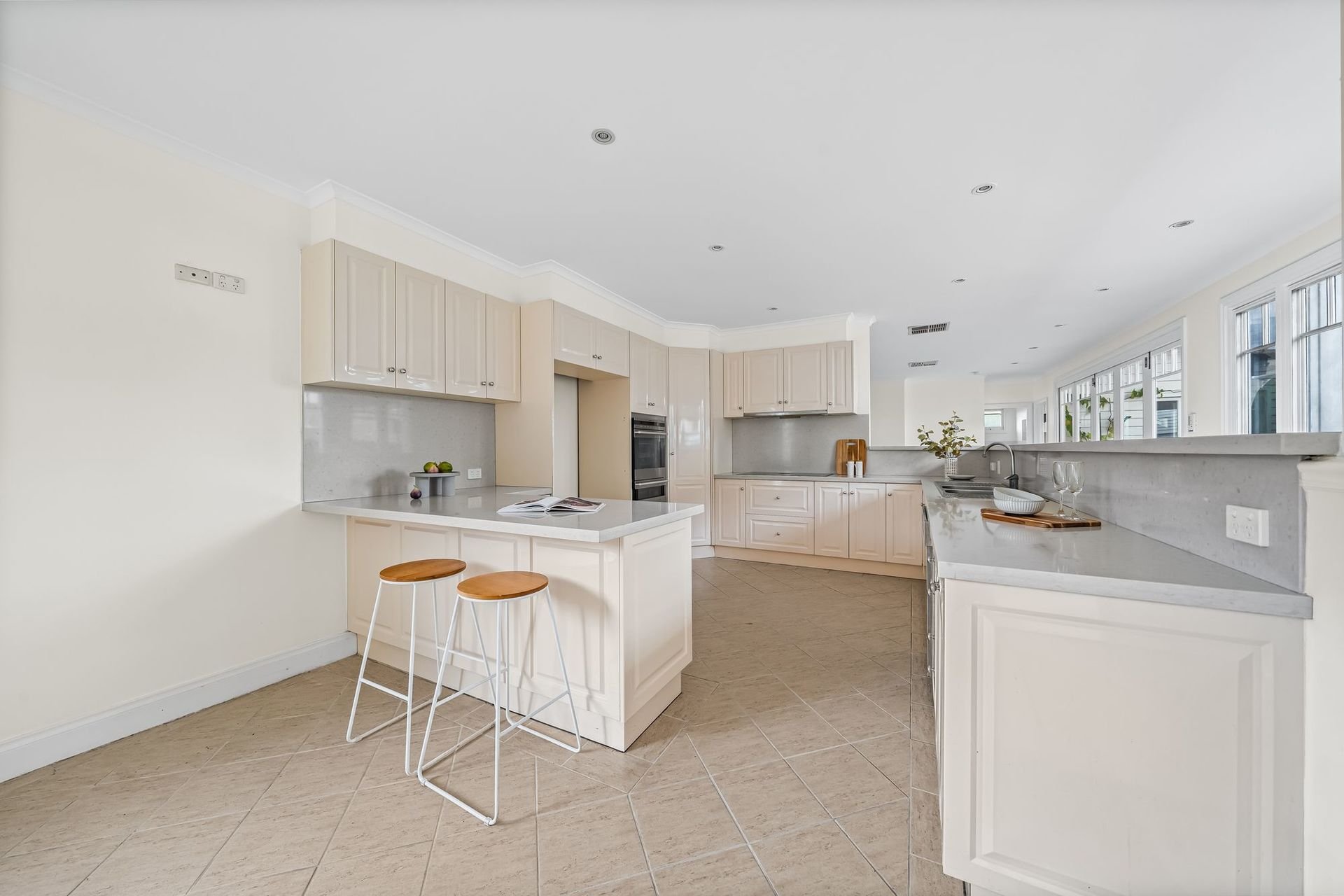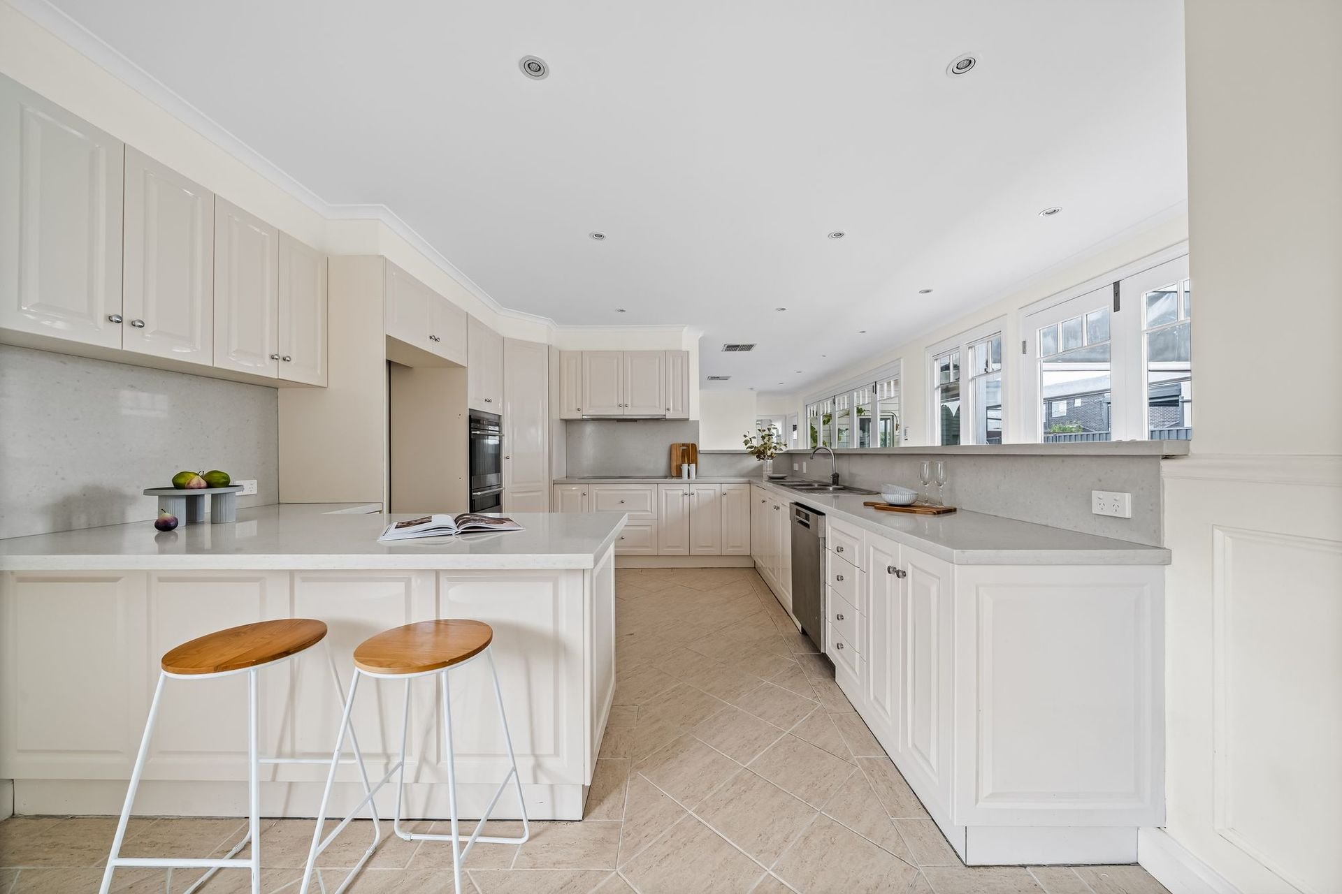 Living and entertaining areas are equally impressive, beginning with a refined front lounge featuring a fireplace, flowing through to a central dining room and a contemporary stone-bench kitchen appointed with island breakfast bar, quality appliances, and ample storage.