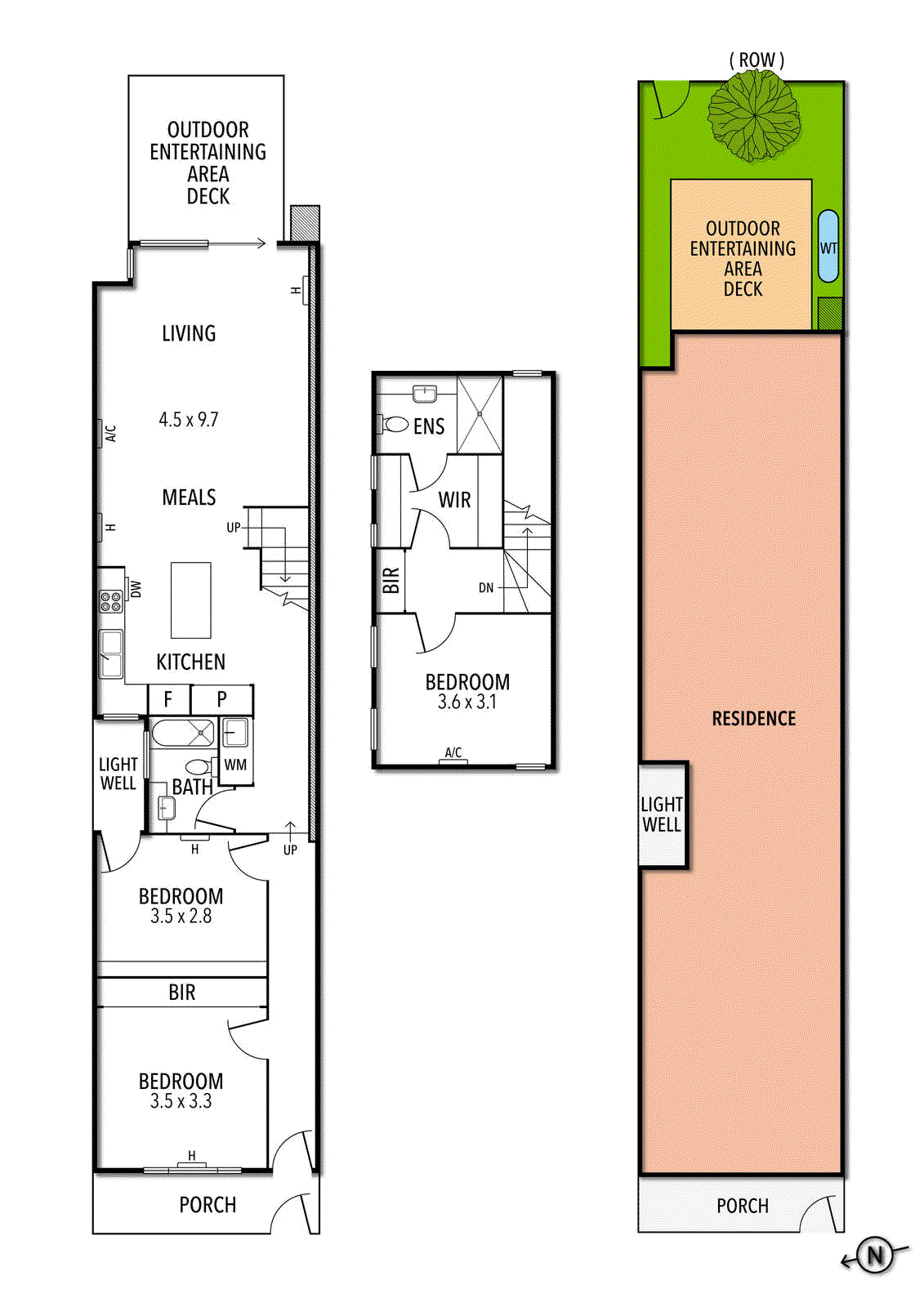 Generous accommodation includes a master suite occupying the entire first floor, with walk in robes and bright central bathroom, accompanied by two sizeable bedrooms on the ground floor with inbuilt storage, one with a private lightwell courtyard. A second central bathroom is equipped with a shower over inbuilt bath. Double glazed windows throughout ensure peaceful enjoyment of the home, and a European laundry adds convenience.