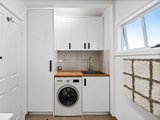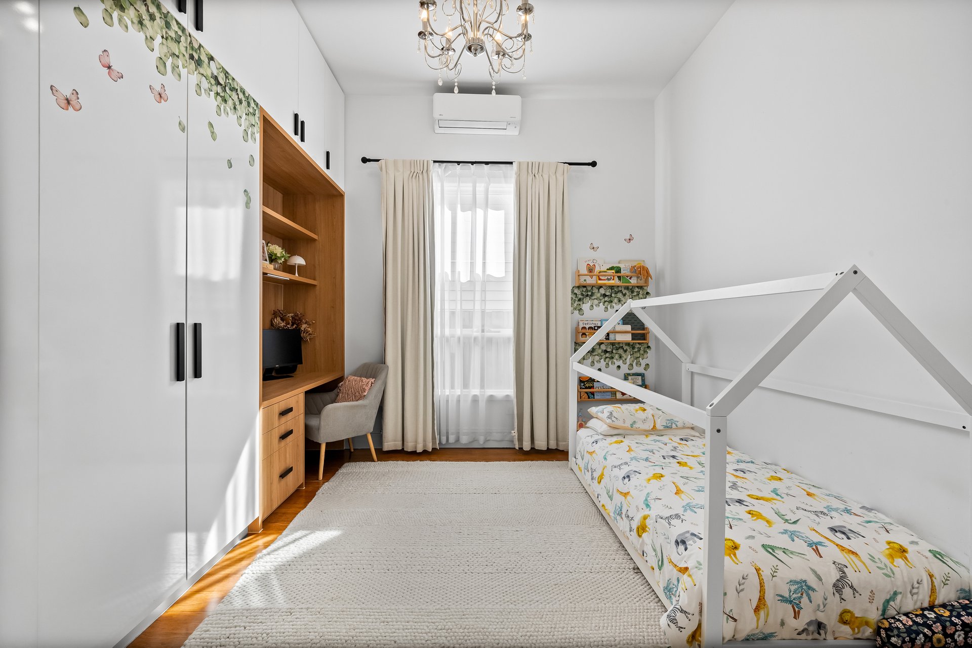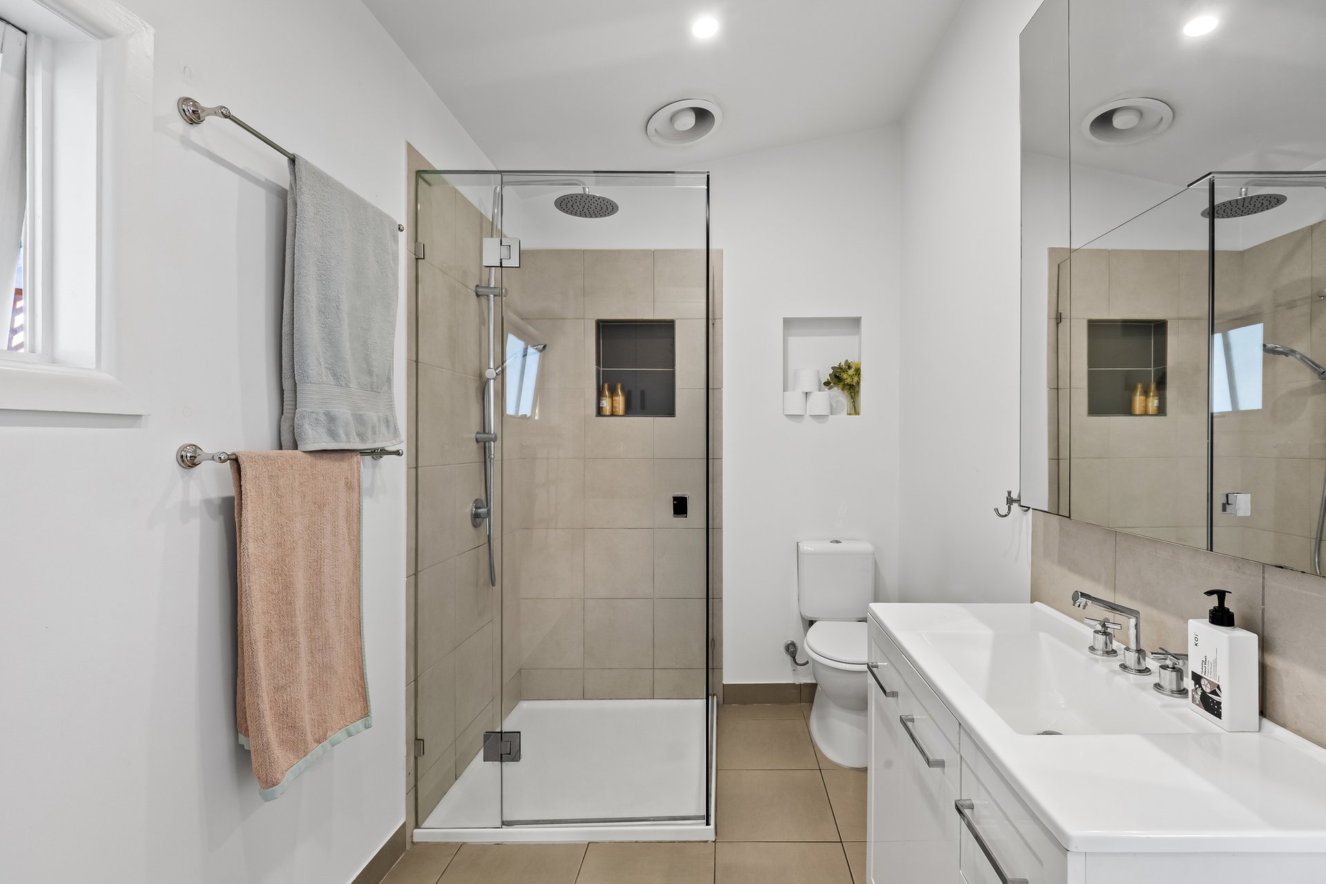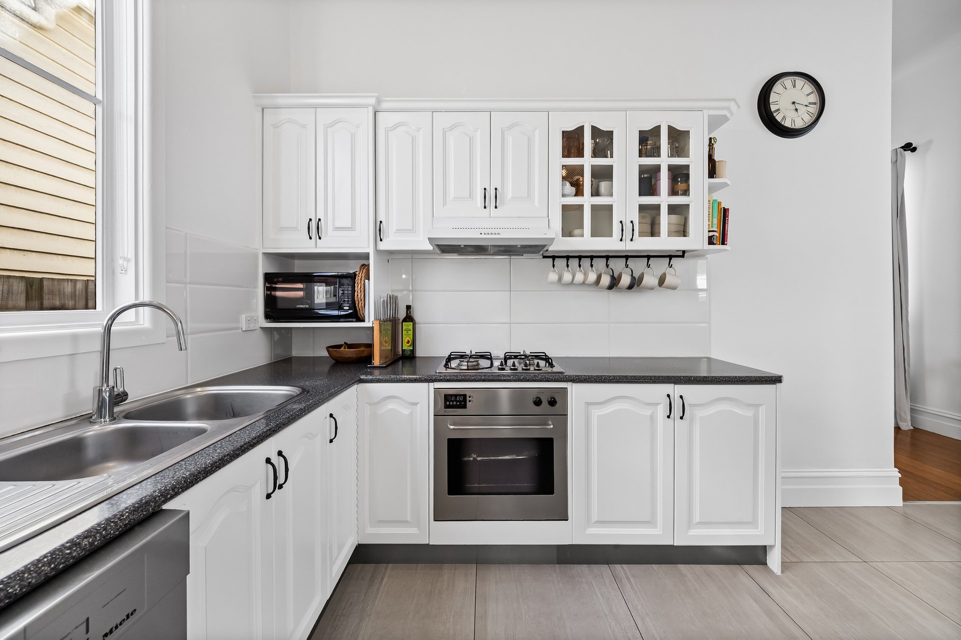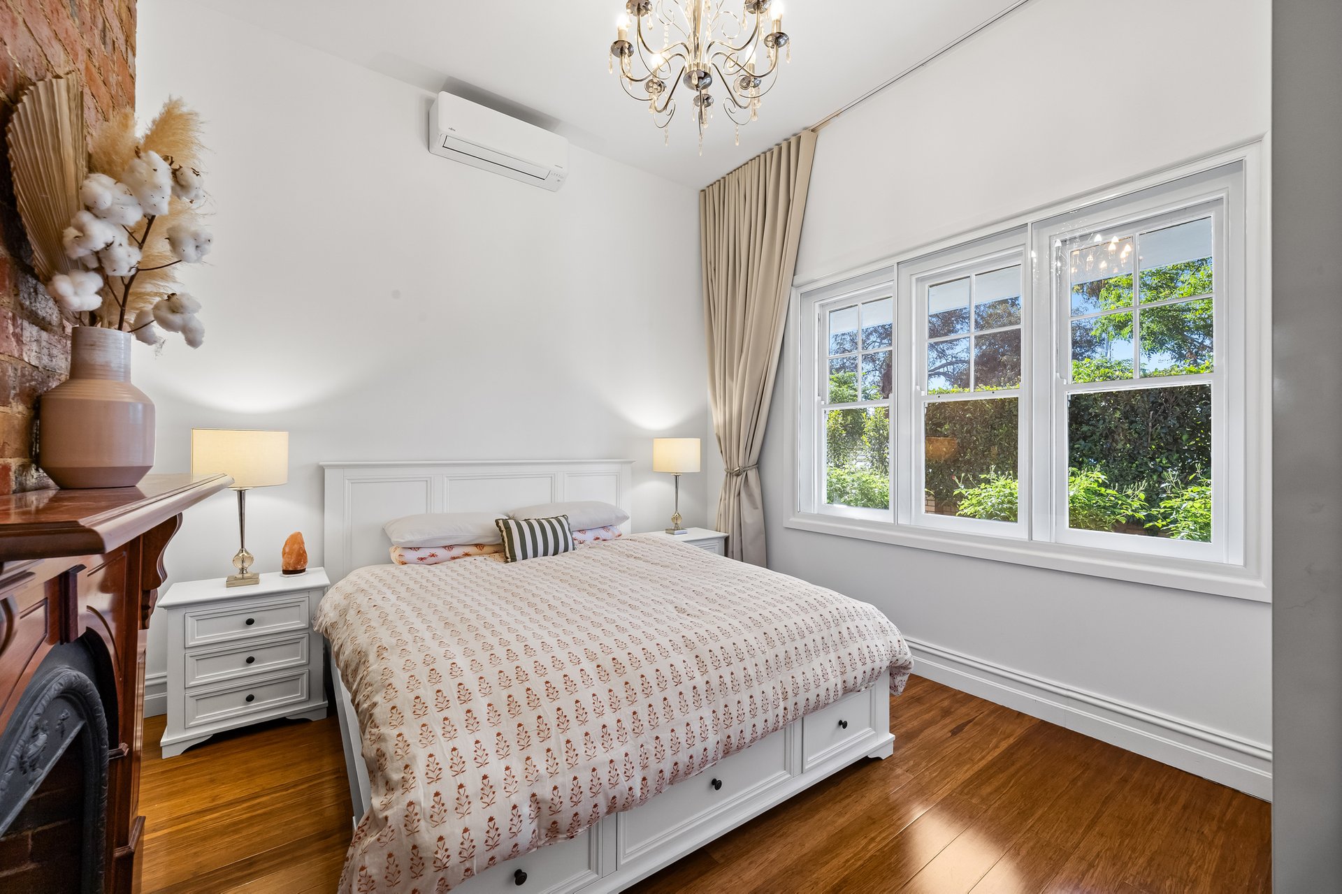 A recently renovated solid timber kitchen features tiled flooring, gas cooktop, electric oven and integrated Miele dishwasher providing both functionality and style. Two generous bedrooms feature new floor-to-ceiling built-in robes, with the front bedroom benefiting from thermally efficient and sound-reducing double-glazed windows. Fujitsu split-system air conditioning services both bedrooms, while a built-in study or book nook in the second bedroom adds valuable flexibility. The tiled bathroom is supported by a modern built-in laundry with cabinetry, folding space, washing machine provision and an integrated broom cupboard.