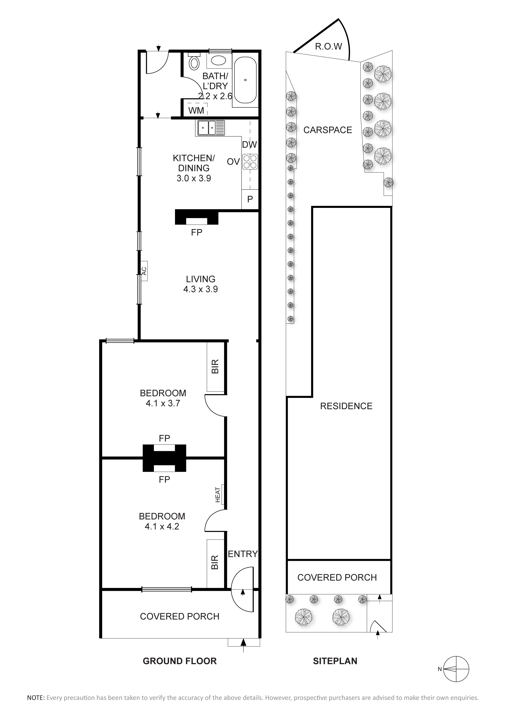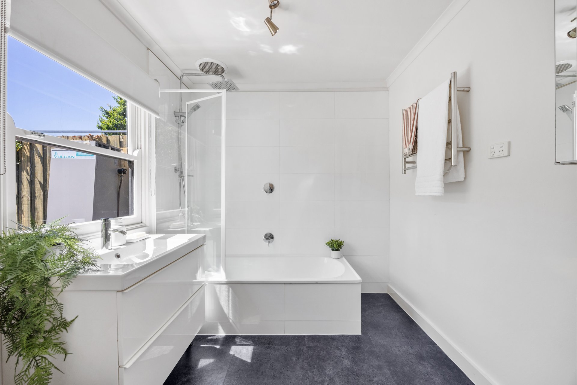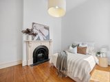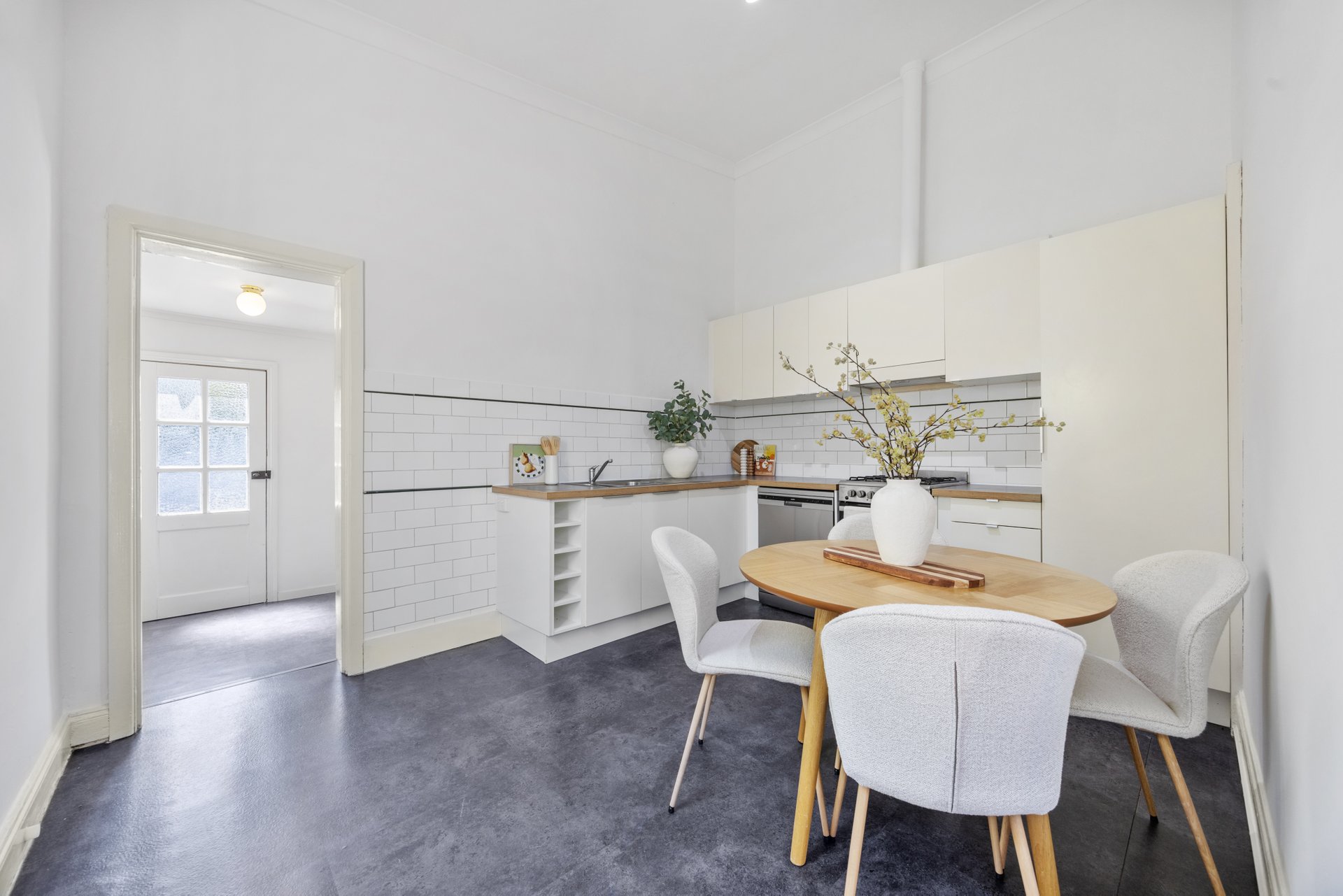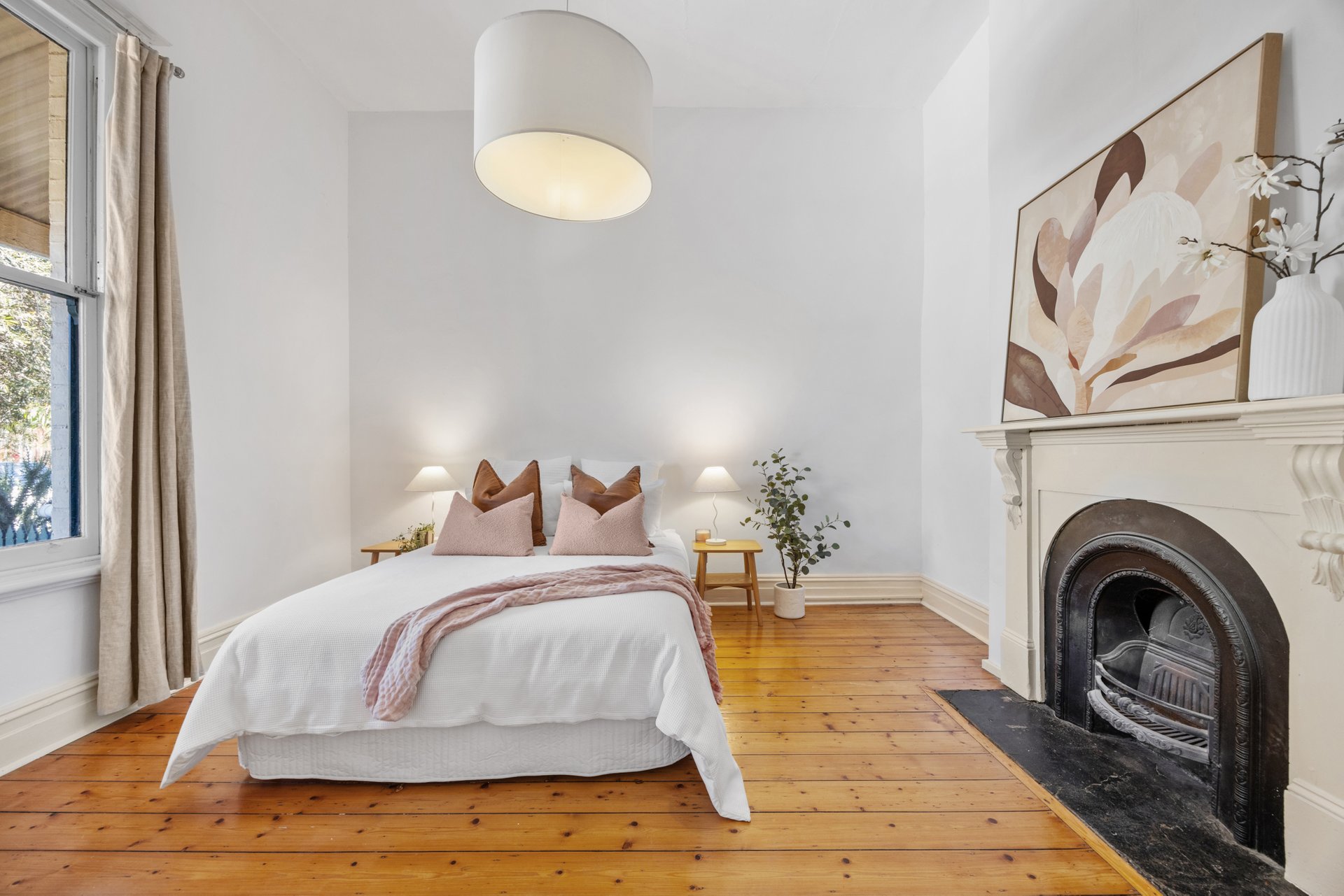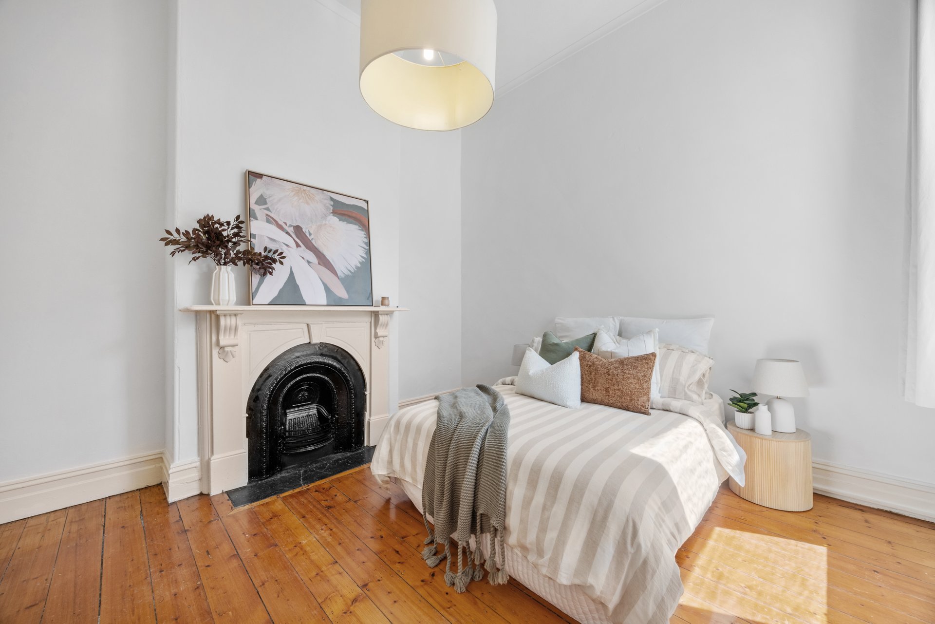 Accommodation is generous and flexible, with two well-proportioned bedrooms both featuring built-in robes, original hardwood floors, high ceilings and their own fireplaces. The bathroom is neatly presented with tiled walls, a shower-over-bath combination, freestanding single vanity and space for a washing machine, offering everyday functionality without compromise.