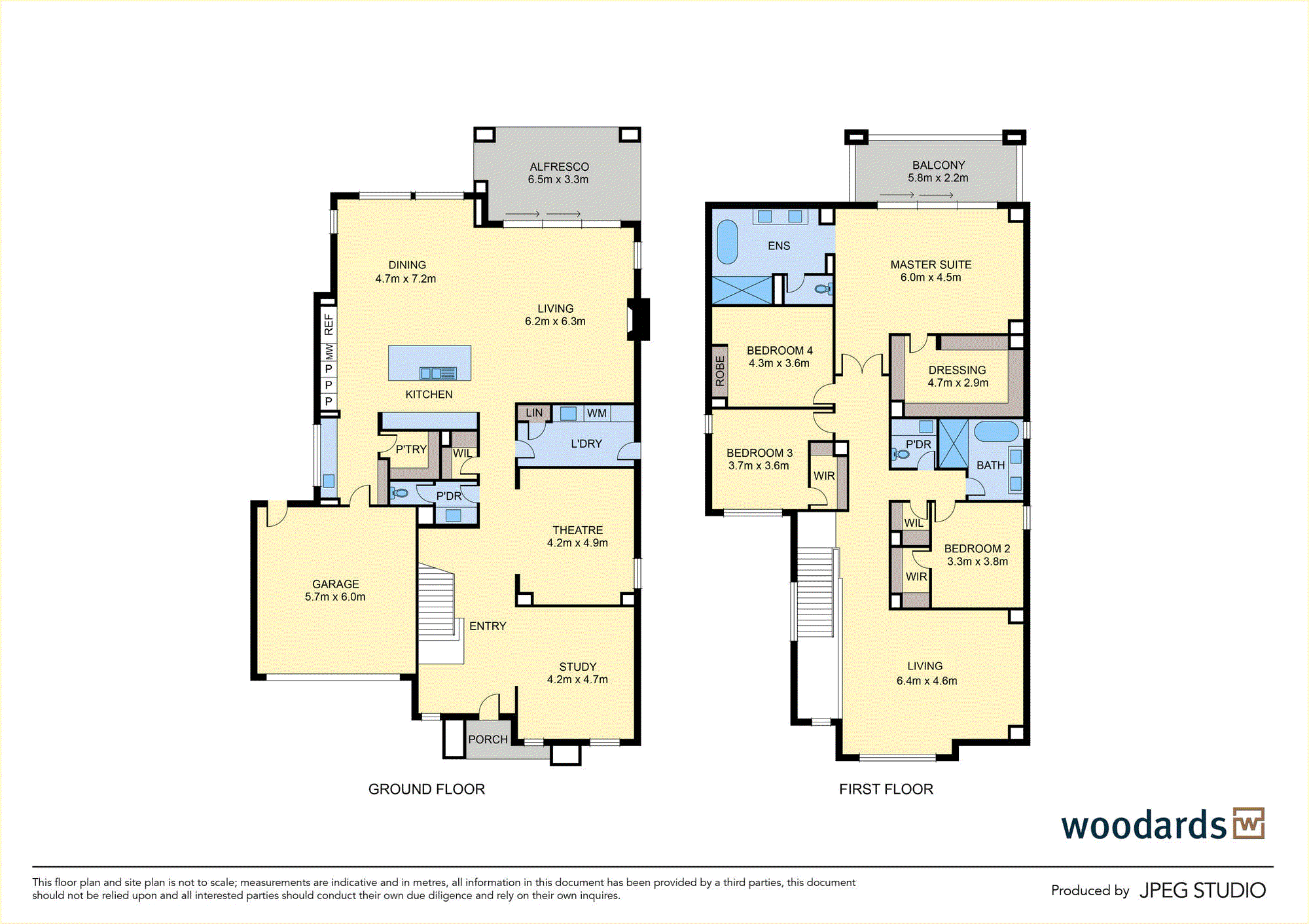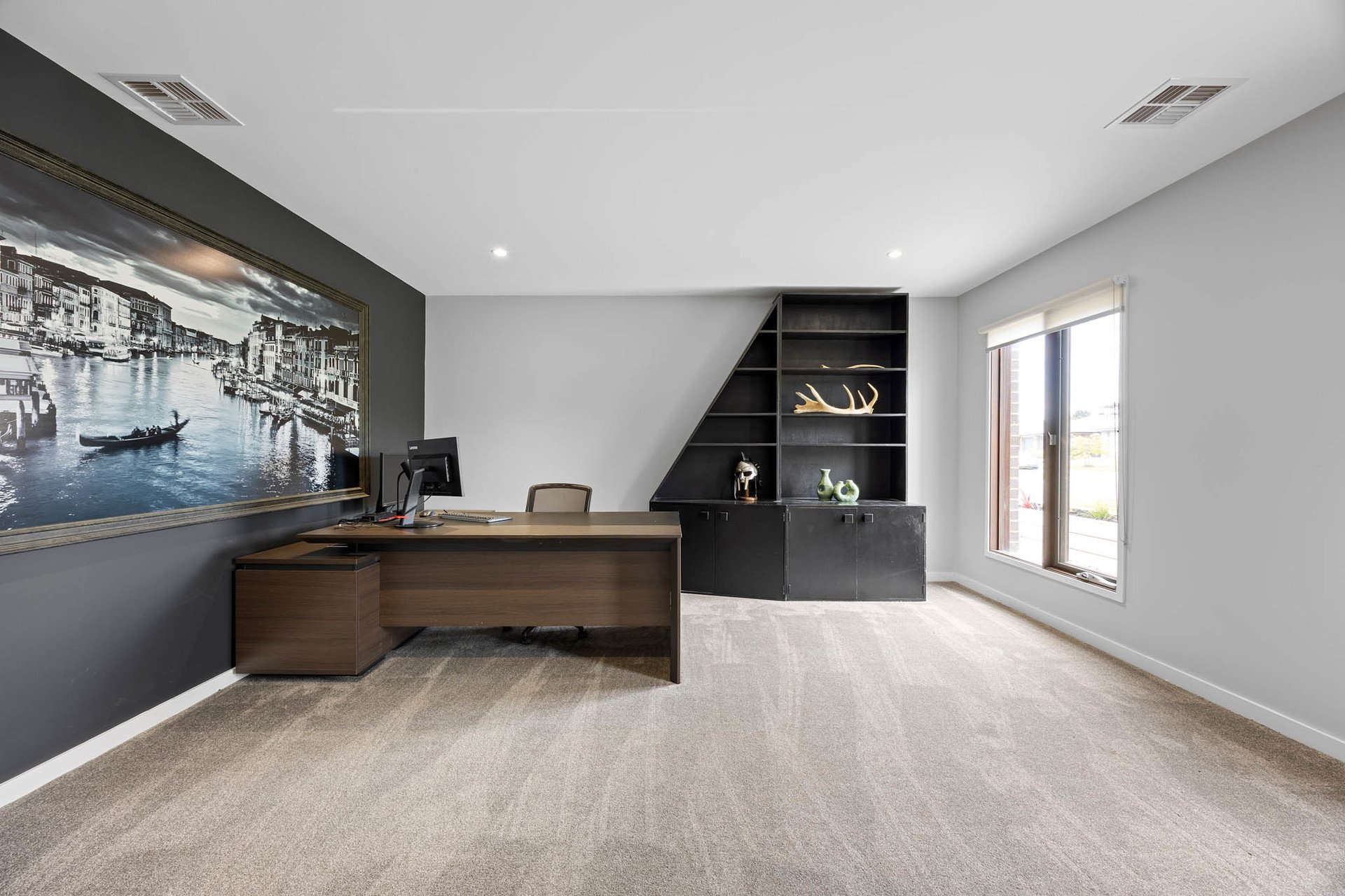Glossy 600mm polished floor tiles set a refined tone, with an impressive entry foyer anchored by a grand floating staircase in rich timber, with frameless glass and metal balusters. To the ground floor, a lounge-sized study and a theatre room precede a vast north-to-rear living zone, where open dining and living spaces feature gorgeous stone TV cabinetry while offering effortless flow to the alfresco.