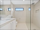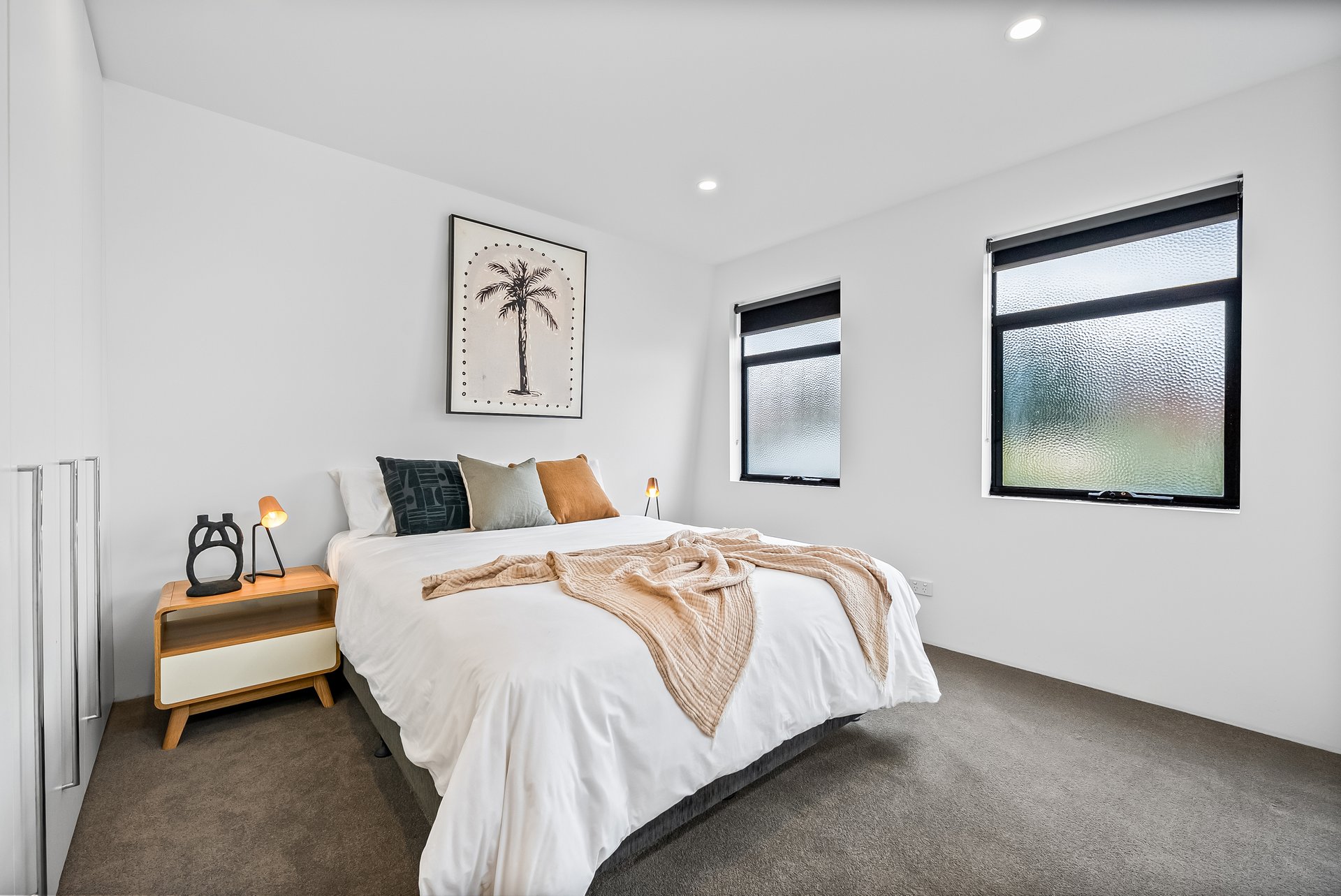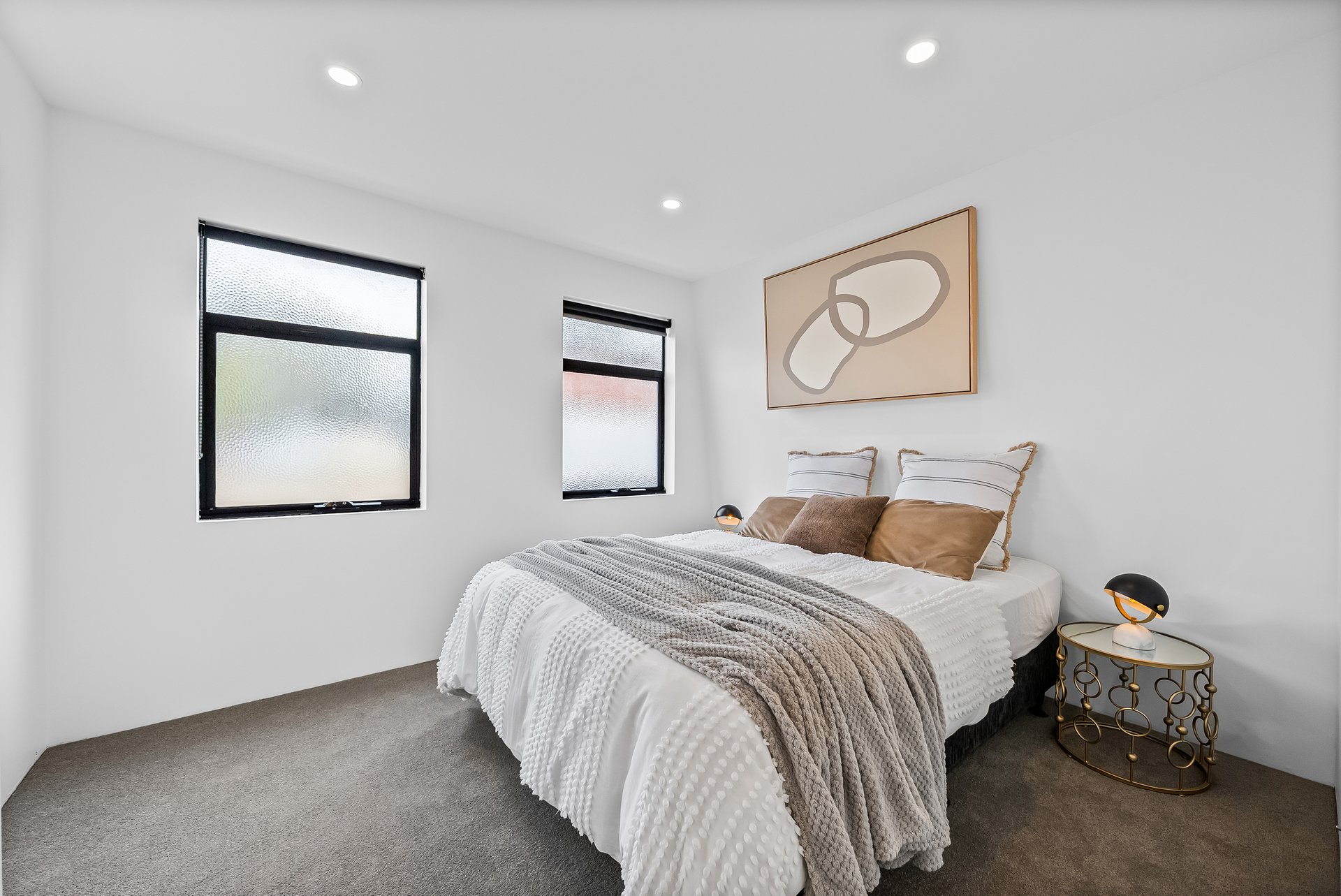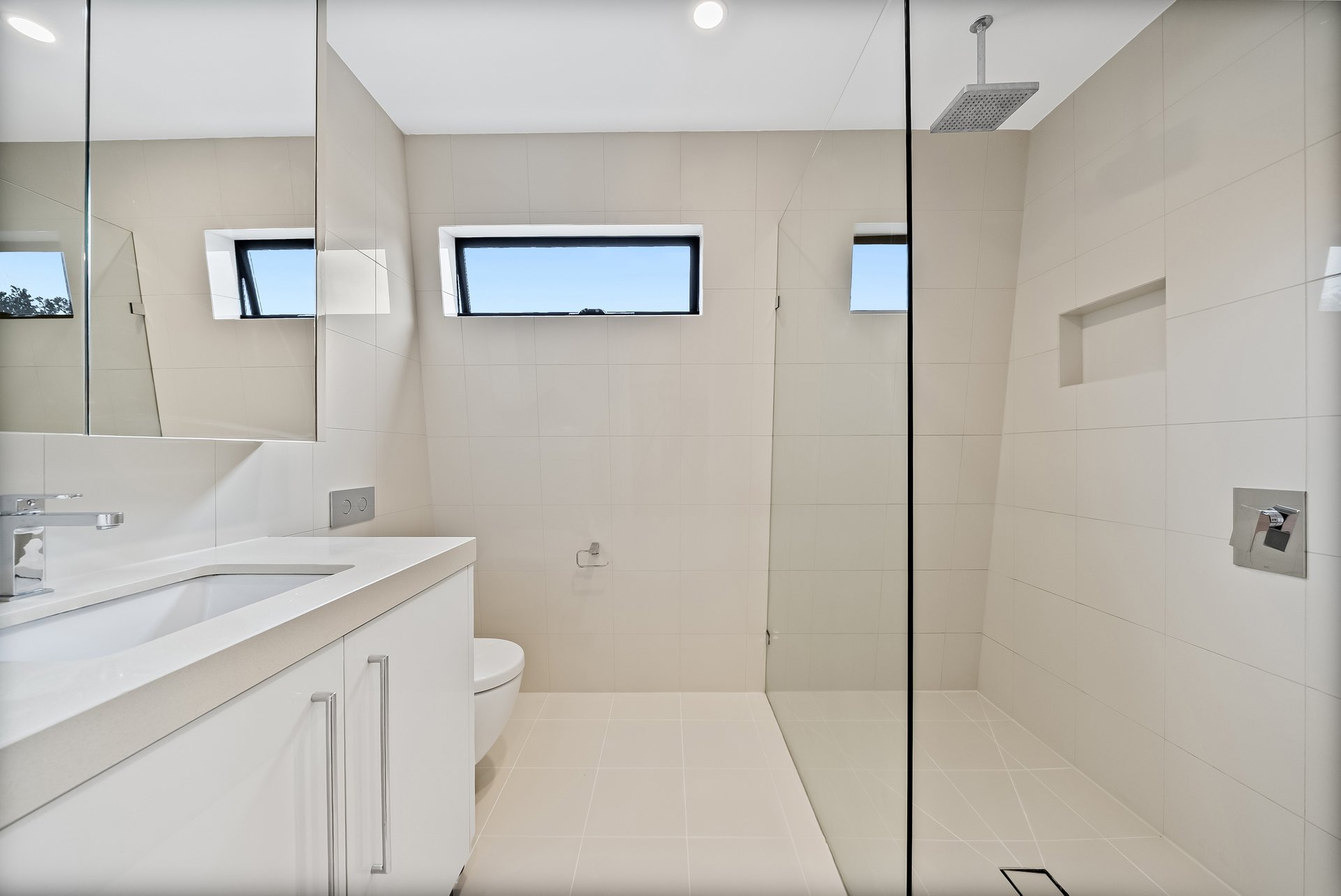 Upstairs, two generous, light-filled bedrooms enjoy plush carpet, high ceilings, and abundant natural light. A sleek central bathroom with floor-to-ceiling tiles and a rainwater shower enhances the home’s sense of comfort and luxury.