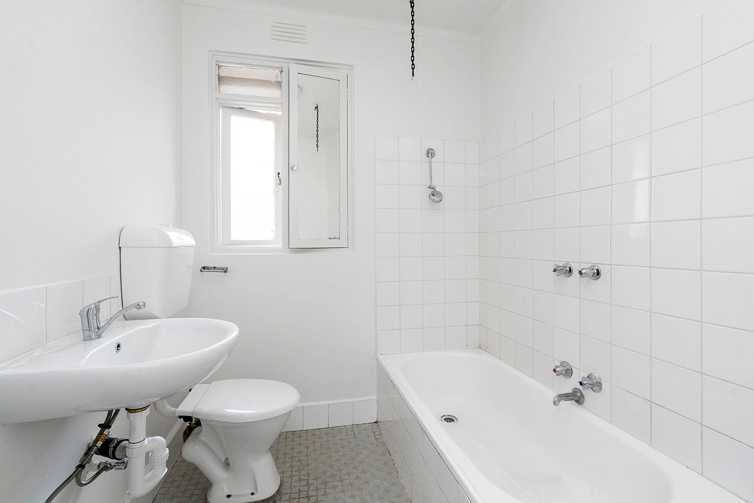Central bathroom with shower over bath and internal washing machine taps