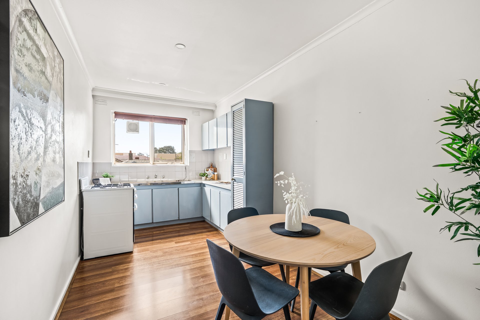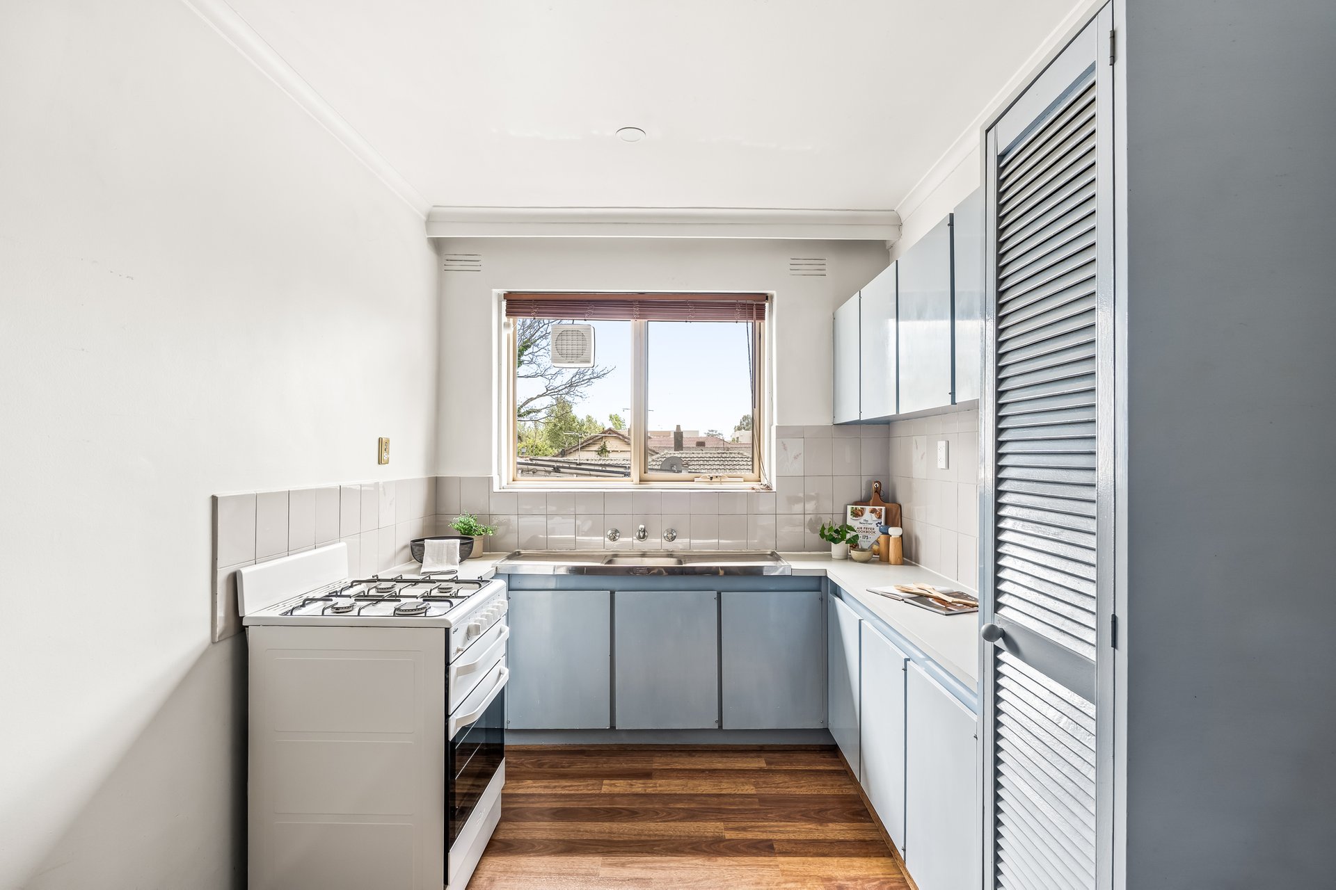 From an entrance hall with storage, through to a well-ordered eat-in kitchen including a pantry and an upright range, and onto a sizeable living room that opens to a balcony that basks in northern light, low-maintenance living is spacious, bright and streamlined. Secondary glazing adds a level of serenity to the two spacious bedrooms, each featuring built-in robes, and the bright bathroom with a shower over the tub includes laundry taps for your convenience.