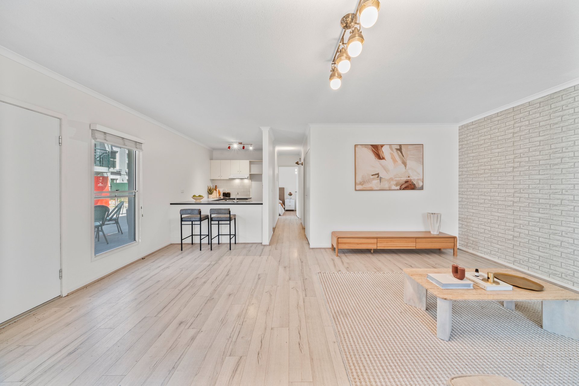 Two bright bedrooms each offer built-in wardrobes and newly installed floorboards, while the central bathroom includes a shower-over-bath and a cleverly concealed European laundry. A new hot water system further enhances everyday comfort and efficiency.