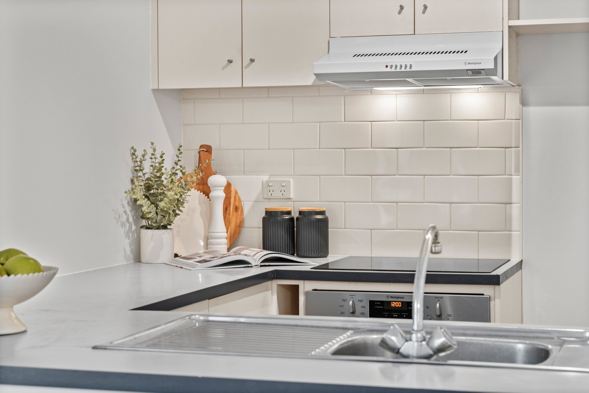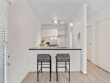 The sleek, well-appointed kitchen combines form and function, featuring stainless-steel appliances (including a new rangehood), a breakfast bar, and abundant storage.