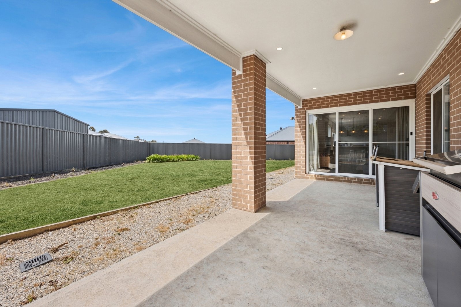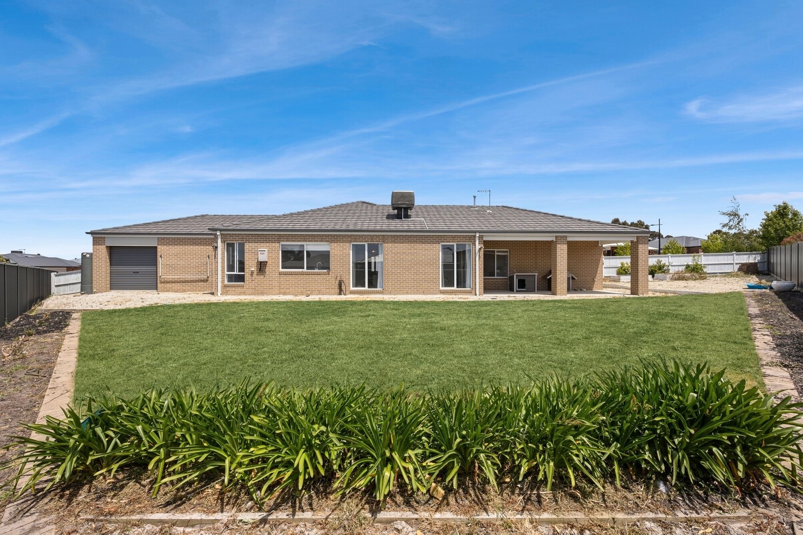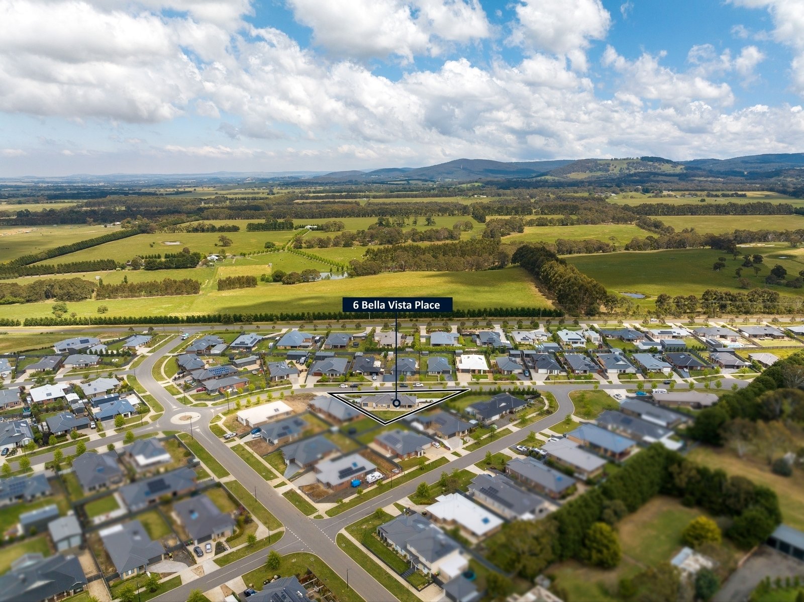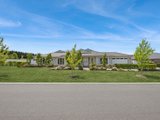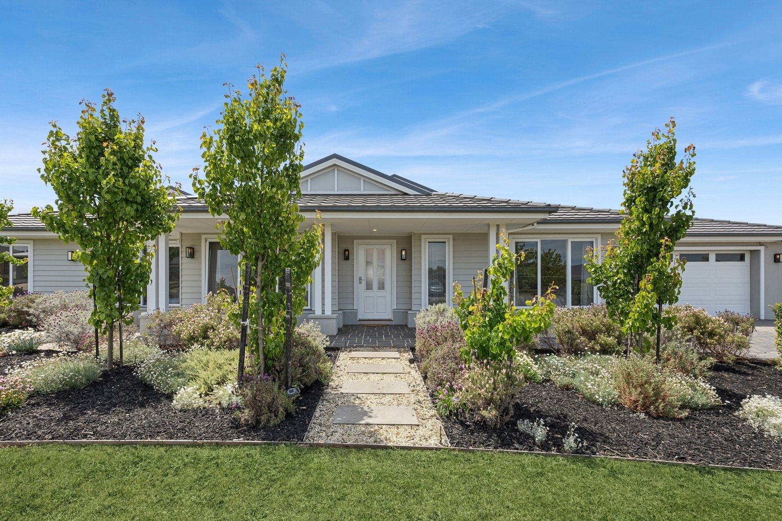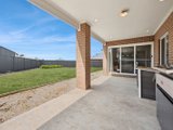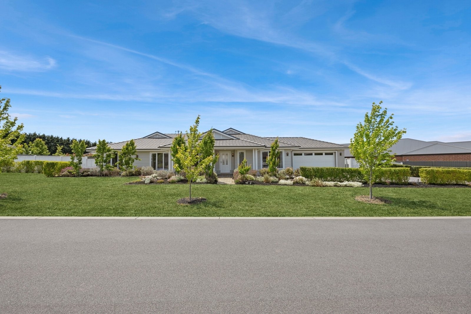 Prepare to be captivated by the allure of this stunning four-bedroom plus study, two-bathroom Lomandra Estate gem, set on sprawling landscaped gardens spanning approximately 1130m. Seamlessly blending with its picturesque Macedon Ranges surroundings, the home is characterized by long, horizontal lines that exude a sense of cleanliness and contemporary sophistication. Embracing classic elegance, the residence is detailed with superb high end selections, downlights and feature light fittings, wainscoting, and a soothing patina of soft neutrals with classic duck egg blue highlights. An expansive lounge offers ample room for relaxation, while the open concept kitchen, meals, and living areas are designed to maximize the influx of natural light. The gourmet kitchen showcases stone benchtops seamlessly extending to the breakfast bar, and features soft-close cabinetry, a large walk-in pantry, and stainless steel ILVE appliances including an oven and dishwasher. Outside, a spacious alfresco entertaining area is surrounded by the fully fenced, level rear yard with citrus trees. Luxurious accommodation enhanced by wool carpets include three bedrooms fitted with mirrored built-in robes, while the primary bedroom retreat is graced by a walk-in robe and a sumptuous ensuite featuring a twin stone-topped vanity and a double shower with herringbone-tiled niching. The main bathroom carries the same elegant theme and includes a relaxing bath. For those seeking a dedicated workspace or a home office, a study provides the ideal nook for productivity. The property includes an integrated oversize remote-controlled double garage with a rear roller door, gated side access with ample space for trailer parking, ducted heating, evaporative cooling, a 2020-litre water tank, sizeable laundry, and Bosch alarm. It's the perfect blend of privacy and community close to shops, schools, parklands, childcare centres, and every essential for a comfortable lifestyle.