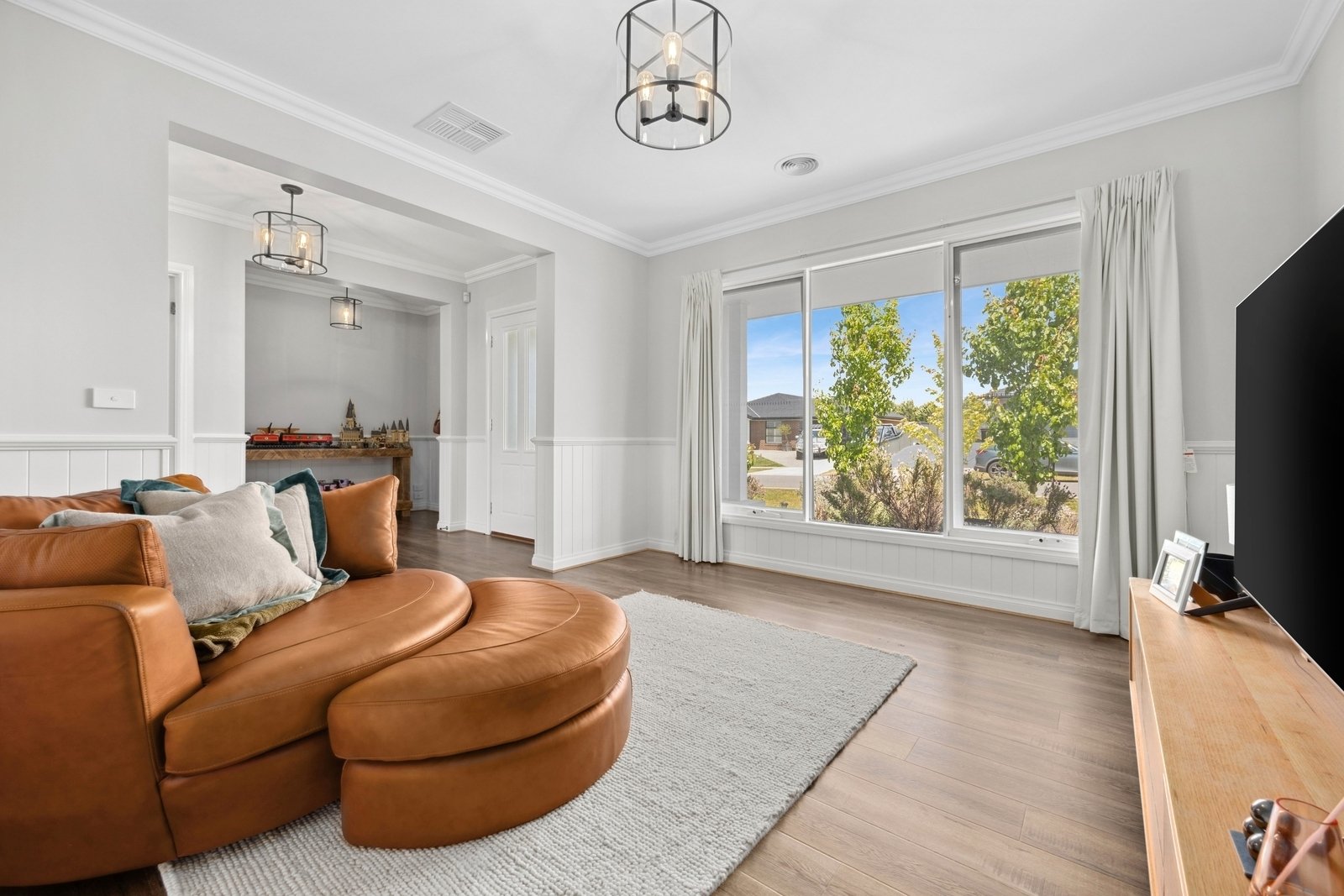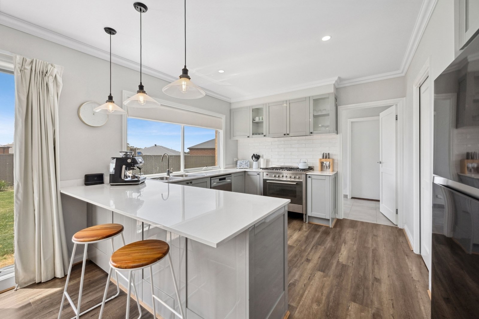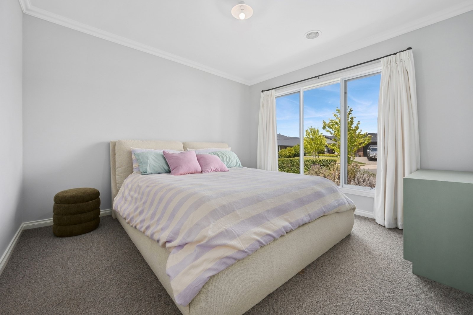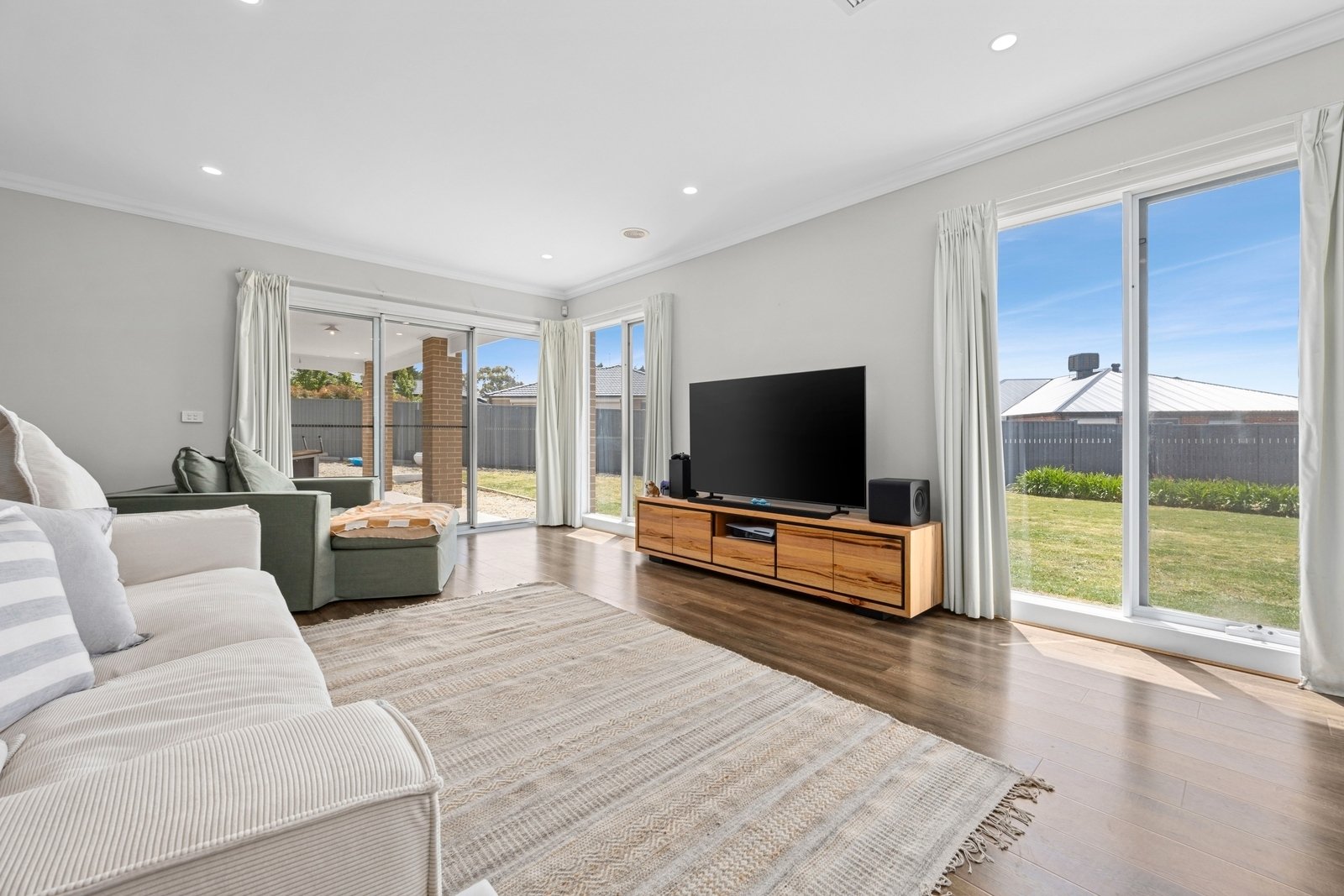 Prepare to be captivated by the allure of this stunning four-bedroom plus study, two-bathroom Lomandra Estate gem, set on sprawling landscaped gardens spanning approximately 1130m. Seamlessly blending with its picturesque Macedon Ranges surroundings, the home is characterized by long, horizontal lines that exude a sense of cleanliness and contemporary sophistication. Embracing classic elegance, the residence is detailed with superb high end selections, downlights and feature light fittings, wainscoting, and a soothing patina of soft neutrals with classic duck egg blue highlights. An expansive lounge offers ample room for relaxation, while the open concept kitchen, meals, and living areas are designed to maximize the influx of natural light. The gourmet kitchen showcases stone benchtops seamlessly extending to the breakfast bar, and features soft-close cabinetry, a large walk-in pantry, and stainless steel ILVE appliances including an oven and dishwasher. Outside, a spacious alfresco entertaining area is surrounded by the fully fenced, level rear yard with citrus trees. Luxurious accommodation enhanced by wool carpets include three bedrooms fitted with mirrored built-in robes, while the primary bedroom retreat is graced by a walk-in robe and a sumptuous ensuite featuring a twin stone-topped vanity and a double shower with herringbone-tiled niching. The main bathroom carries the same elegant theme and includes a relaxing bath. For those seeking a dedicated workspace or a home office, a study provides the ideal nook for productivity. The property includes an integrated oversize remote-controlled double garage with a rear roller door, gated side access with ample space for trailer parking, ducted heating, evaporative cooling, a 2020-litre water tank, sizeable laundry, and Bosch alarm. It's the perfect blend of privacy and community close to shops, schools, parklands, childcare centres, and every essential for a comfortable lifestyle.