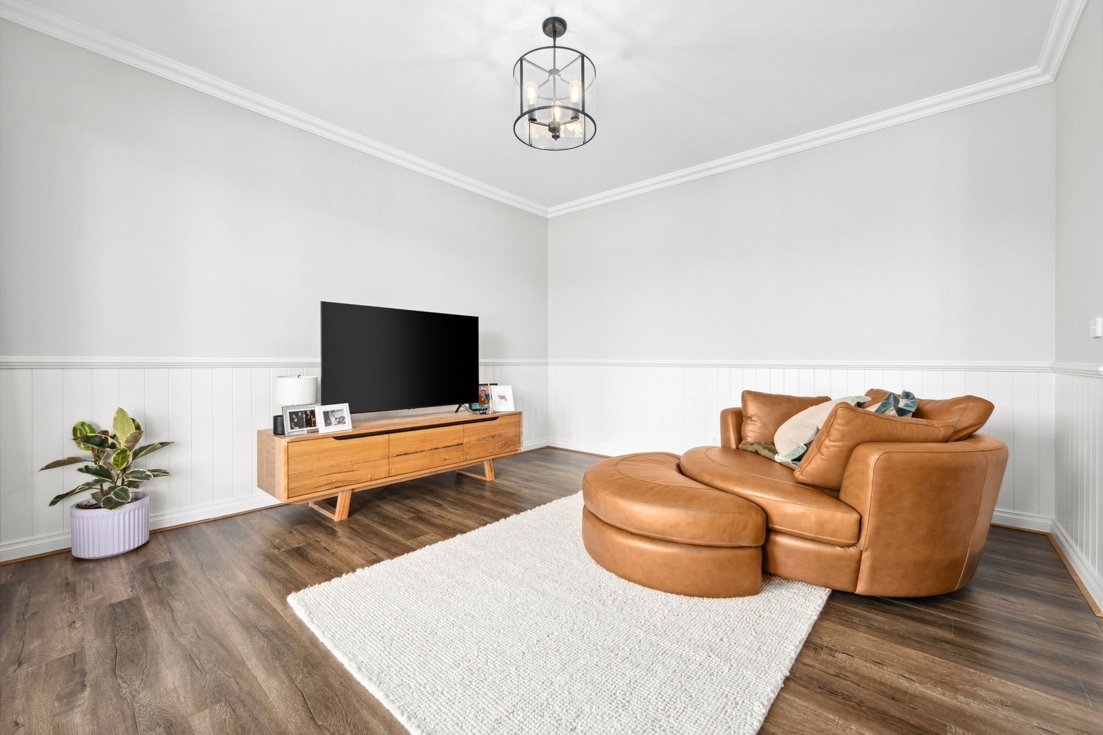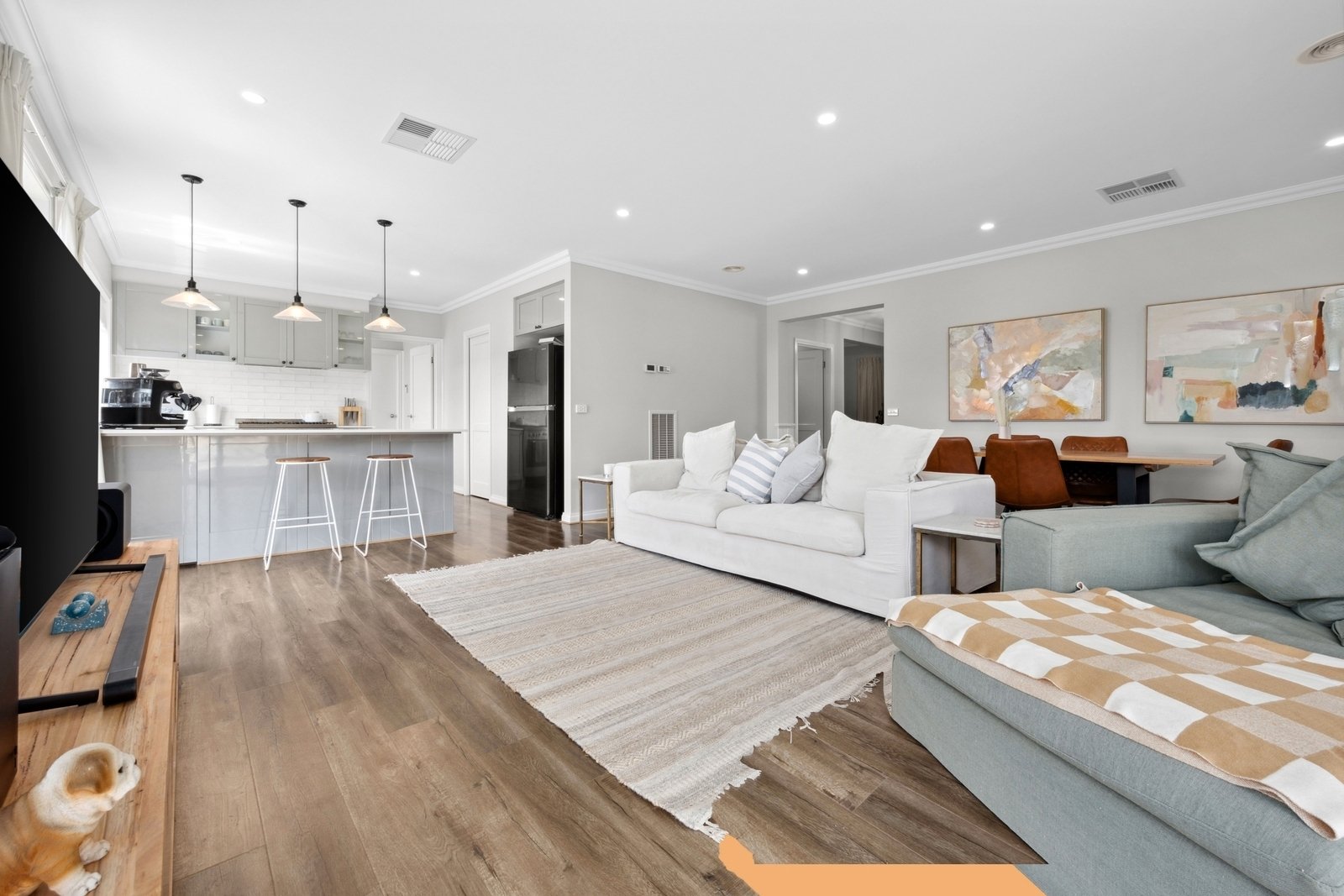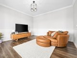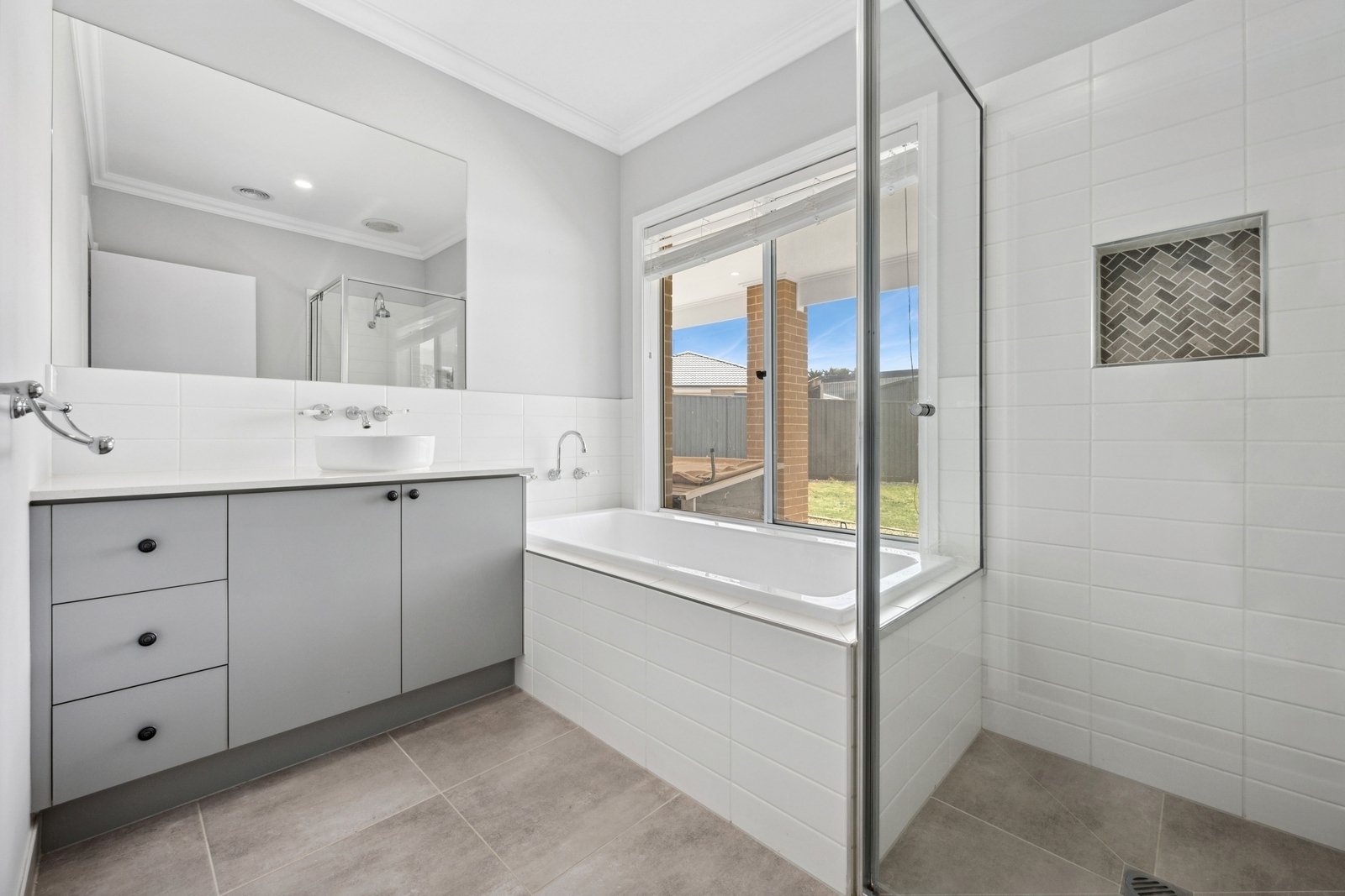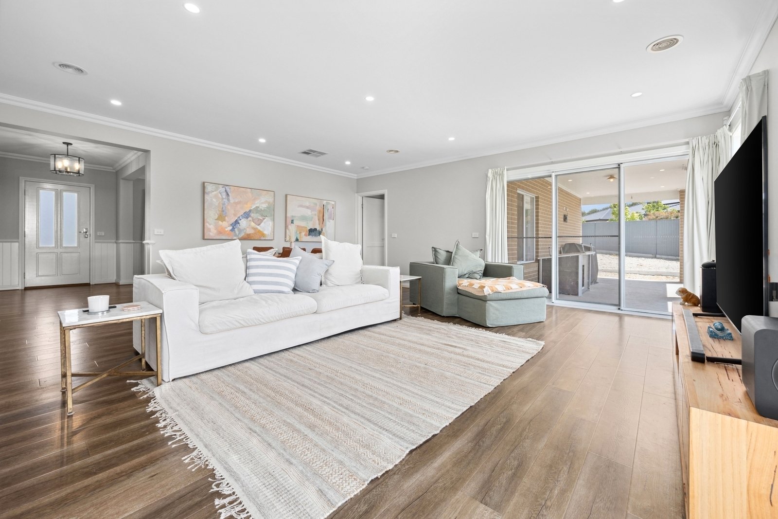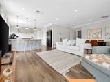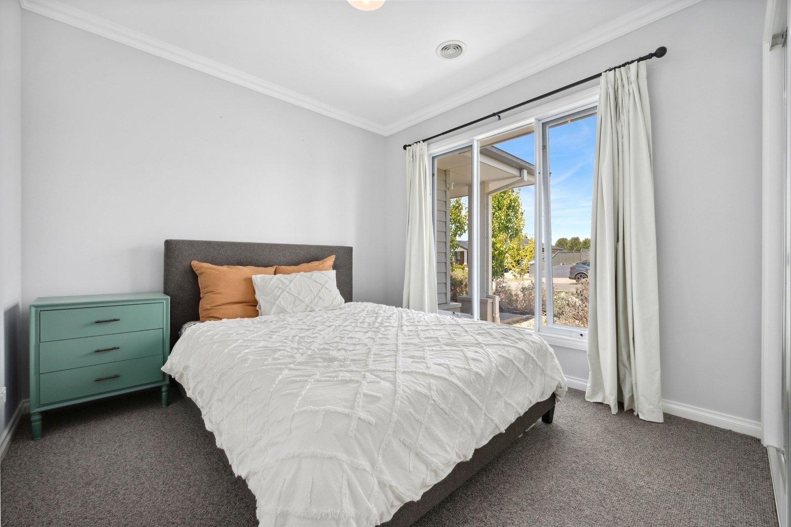 Prepare to be captivated by the allure of this stunning four-bedroom plus study, two-bathroom Lomandra Estate gem, set on sprawling landscaped gardens spanning approximately 1130m. Seamlessly blending with its picturesque Macedon Ranges surroundings, the home is characterized by long, horizontal lines that exude a sense of cleanliness and contemporary sophistication. Embracing classic elegance, the residence is detailed with superb high end selections, downlights and feature light fittings, wainscoting, and a soothing patina of soft neutrals with classic duck egg blue highlights. An expansive lounge offers ample room for relaxation, while the open concept kitchen, meals, and living areas are designed to maximize the influx of natural light. The gourmet kitchen showcases stone benchtops seamlessly extending to the breakfast bar, and features soft-close cabinetry, a large walk-in pantry, and stainless steel ILVE appliances including an oven and dishwasher. Outside, a spacious alfresco entertaining area is surrounded by the fully fenced, level rear yard with citrus trees. Luxurious accommodation enhanced by wool carpets include three bedrooms fitted with mirrored built-in robes, while the primary bedroom retreat is graced by a walk-in robe and a sumptuous ensuite featuring a twin stone-topped vanity and a double shower with herringbone-tiled niching. The main bathroom carries the same elegant theme and includes a relaxing bath. For those seeking a dedicated workspace or a home office, a study provides the ideal nook for productivity. The property includes an integrated oversize remote-controlled double garage with a rear roller door, gated side access with ample space for trailer parking, ducted heating, evaporative cooling, a 2020-litre water tank, sizeable laundry, and Bosch alarm. It's the perfect blend of privacy and community close to shops, schools, parklands, childcare centres, and every essential for a comfortable lifestyle.