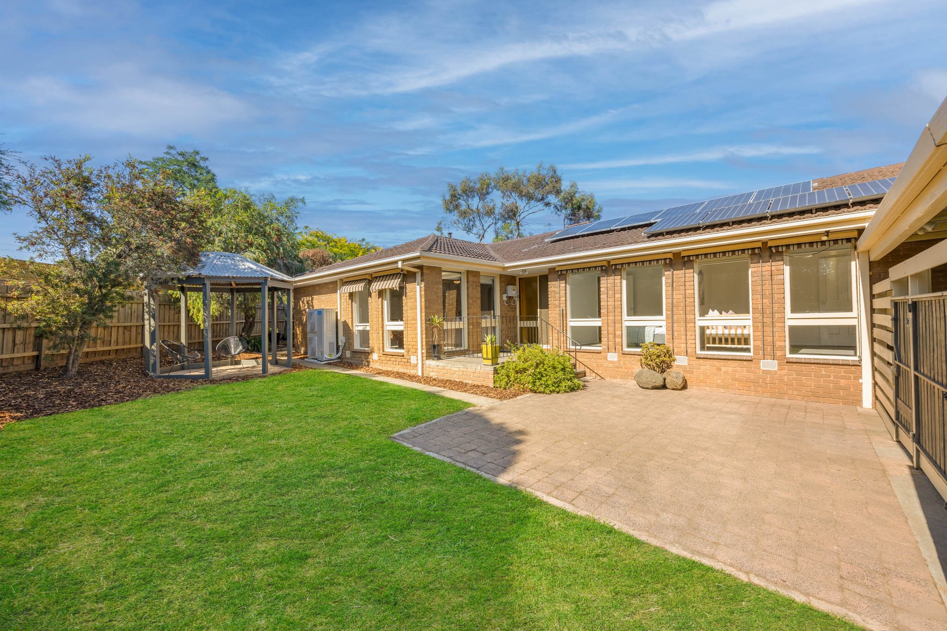 A spacious living zone partners with a versatile rumpus, while a bright white kitchen features an Electrolux oven and a stainless-steel dishwasher, adjoining the dining area for easy everyday flow. Outdoors, a pergola anchors the lovely rear yard, with a side gazebo creating additional space for alfresco entertaining.