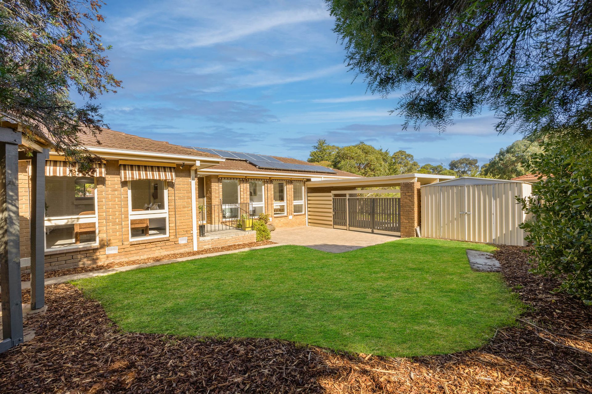 Practical inclusions comprise a double carport with gated rear access, external awnings, a garden shed, split-system heating/cooling, ceiling fans, a cloak closet and a water tank.