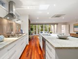 The expansive central living and dining zone continues the impressive highlights, with timber floors, back garden views, and a feature stacked stone fireplace among its enticing hallmarks. Incorporated into the main space is the stone kitchen which is graced with an island bench and stainless steel Miele and Smeg appliances. At the rear of the floorplan, 3 bedrooms all feature built-in robes and easily access 2 bathrooms!