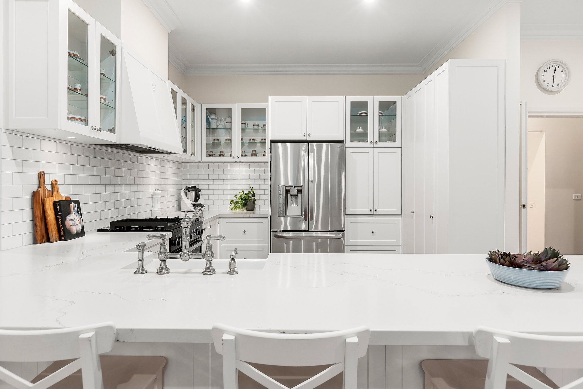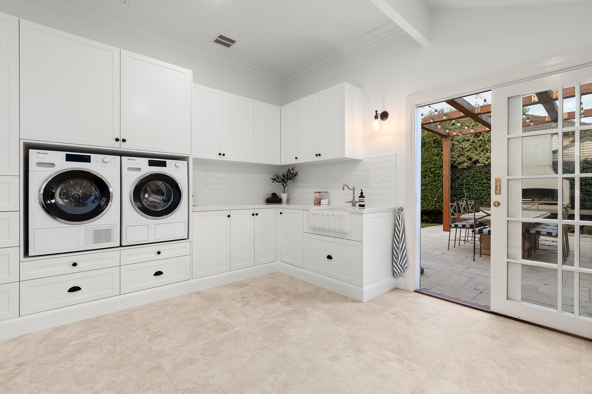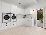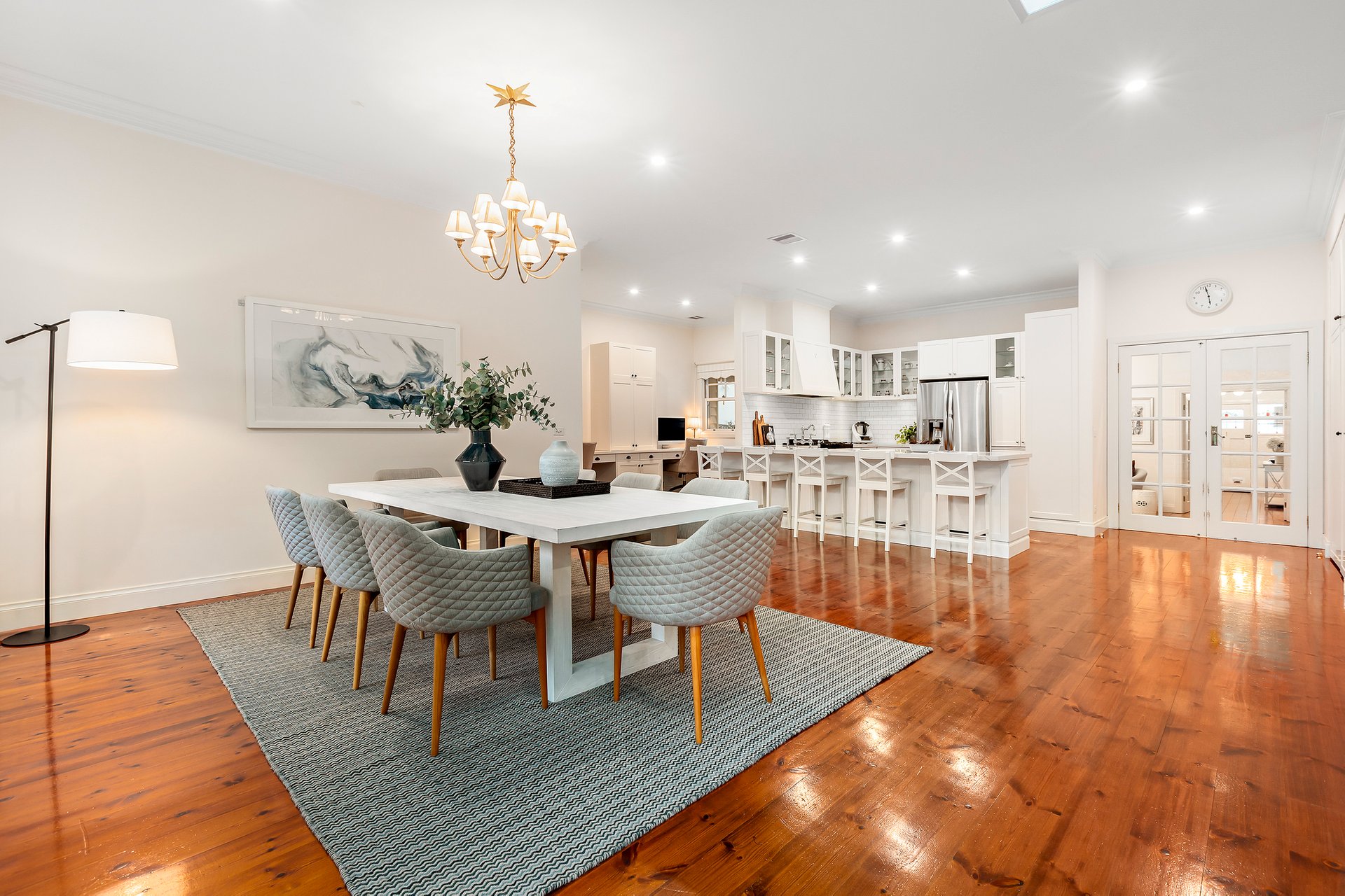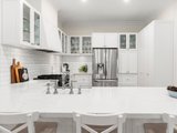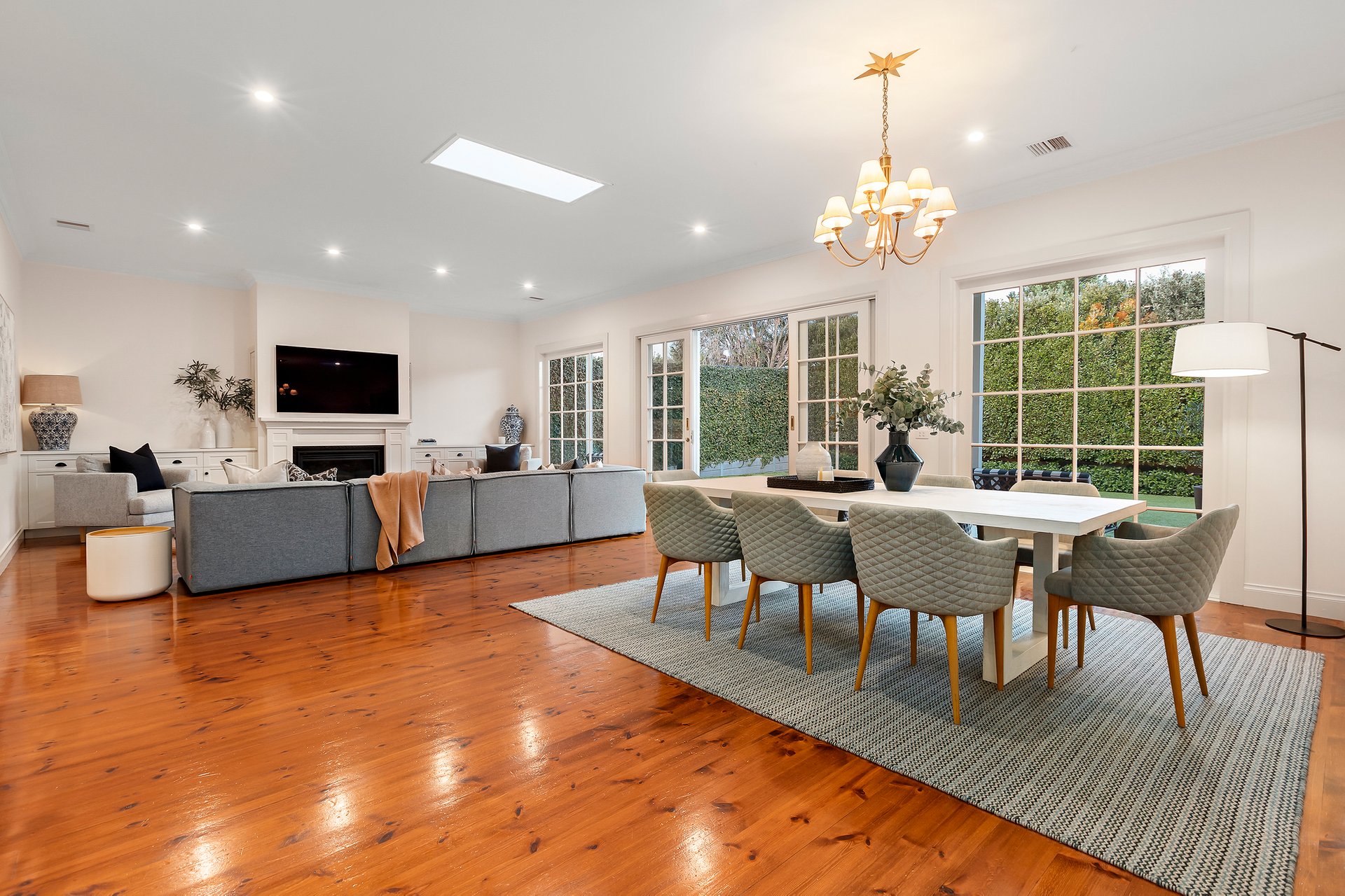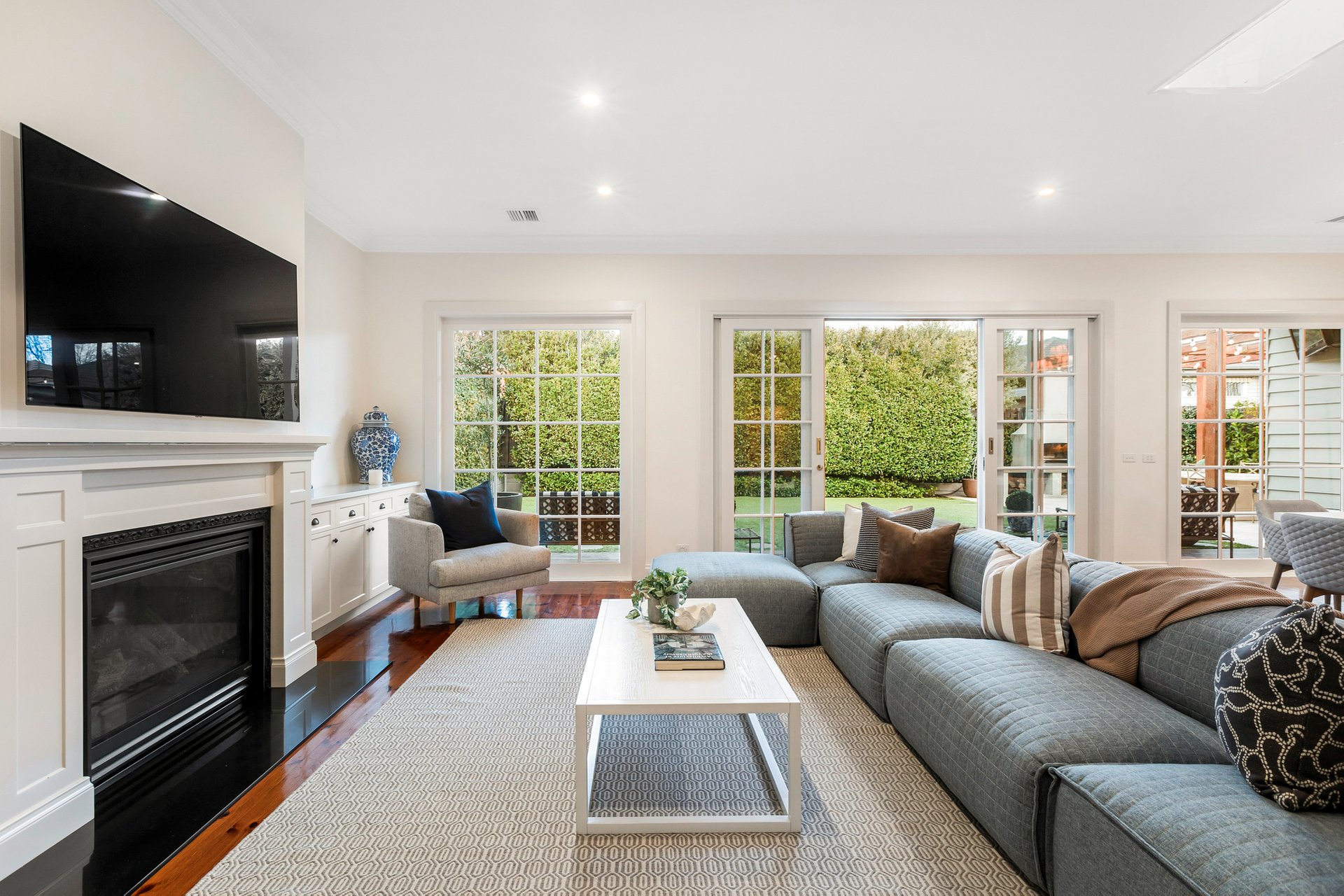 Three more bedrooms are positioned towards the front of the effortless layout, and all have easy access to the formal sitting room which enjoys a roaring gas log fireplace. The rear central family and dining zone (also with fireplace) is utterly expansive and has panoramic views of the private garden. The kitchen shares a space with this main zone and is flawless thanks to immaculate stone, a sizeable breakfast bar, country-style sink with tapware from The English Tapware Co, quality appliances including Miele dishwasher and a 900mm Falcon oven and cooktop.