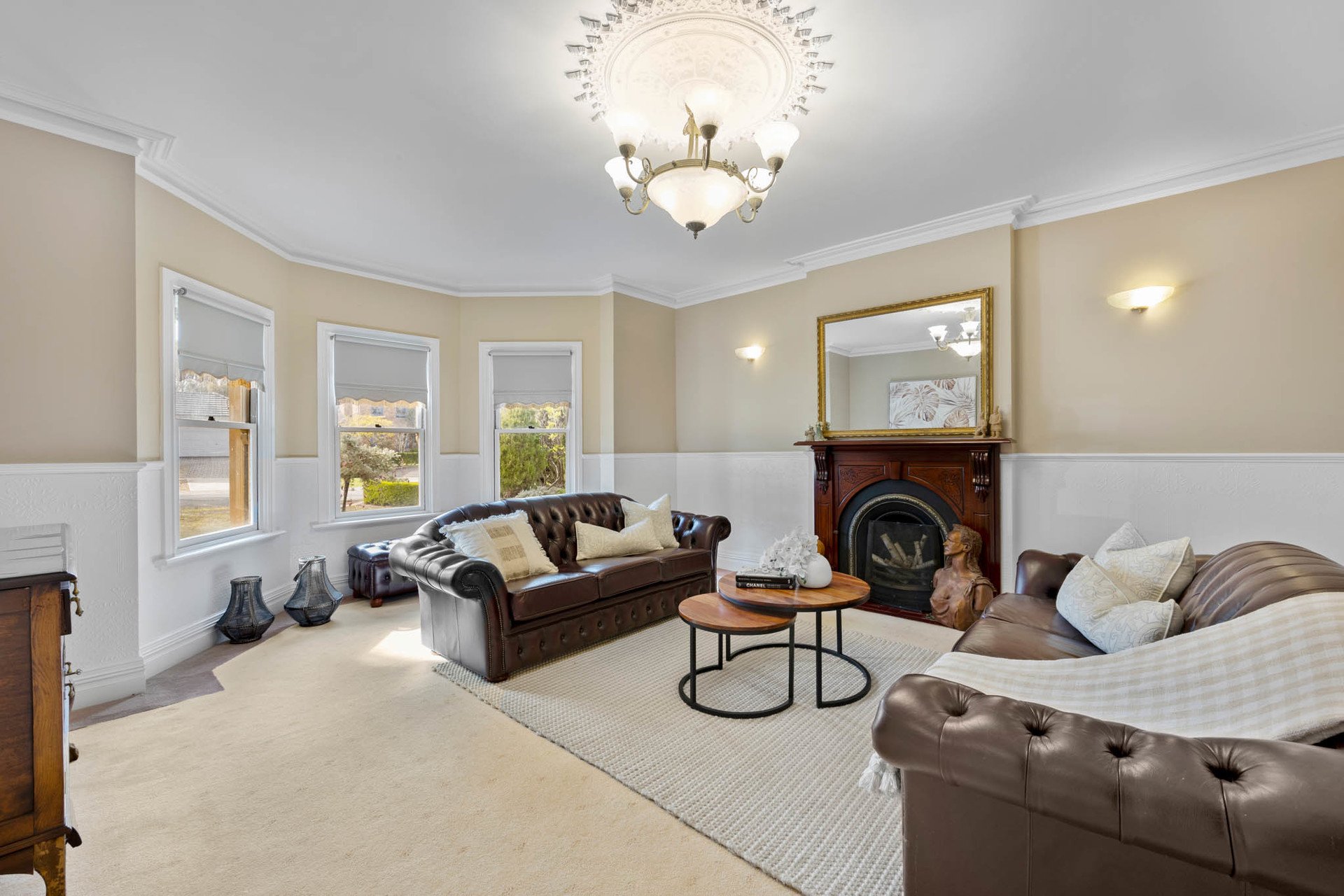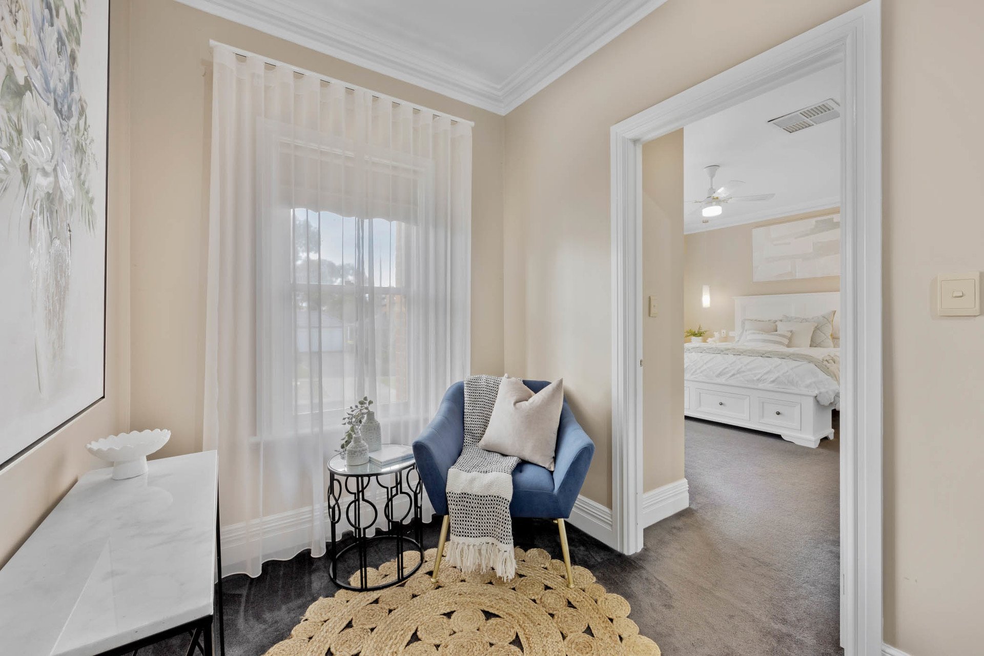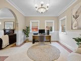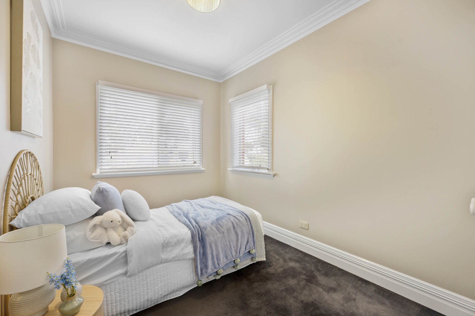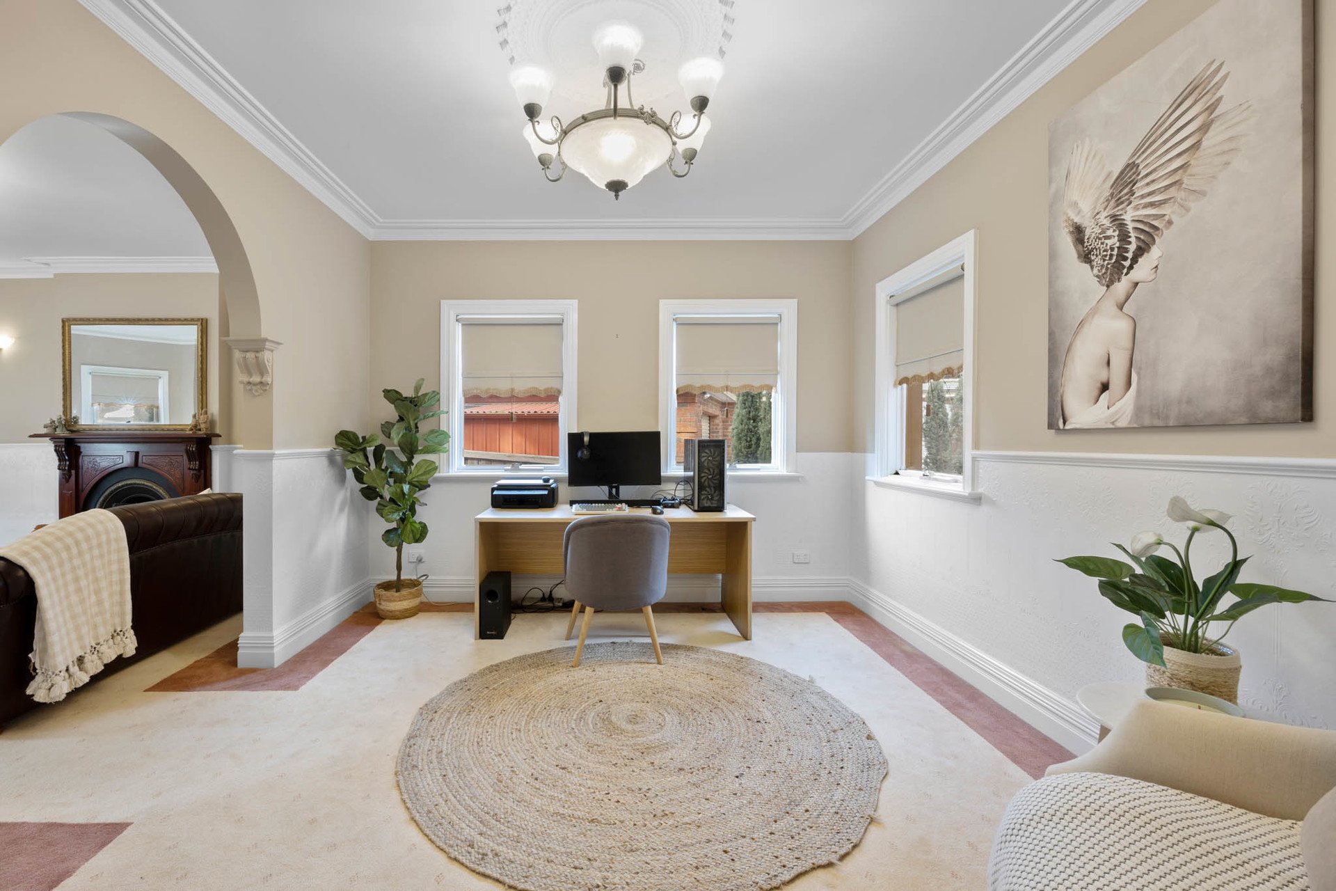 The welcoming entrance showcases leadlight windows and tessellated feature tiles, setting a refined tone. A front lounge with ceiling rose, fireplace, and bay window creates a light-filled retreat overlooking the leafy garden. An arched entry leads to a sunlit study nook, while clever storage is tucked neatly under the staircase.
