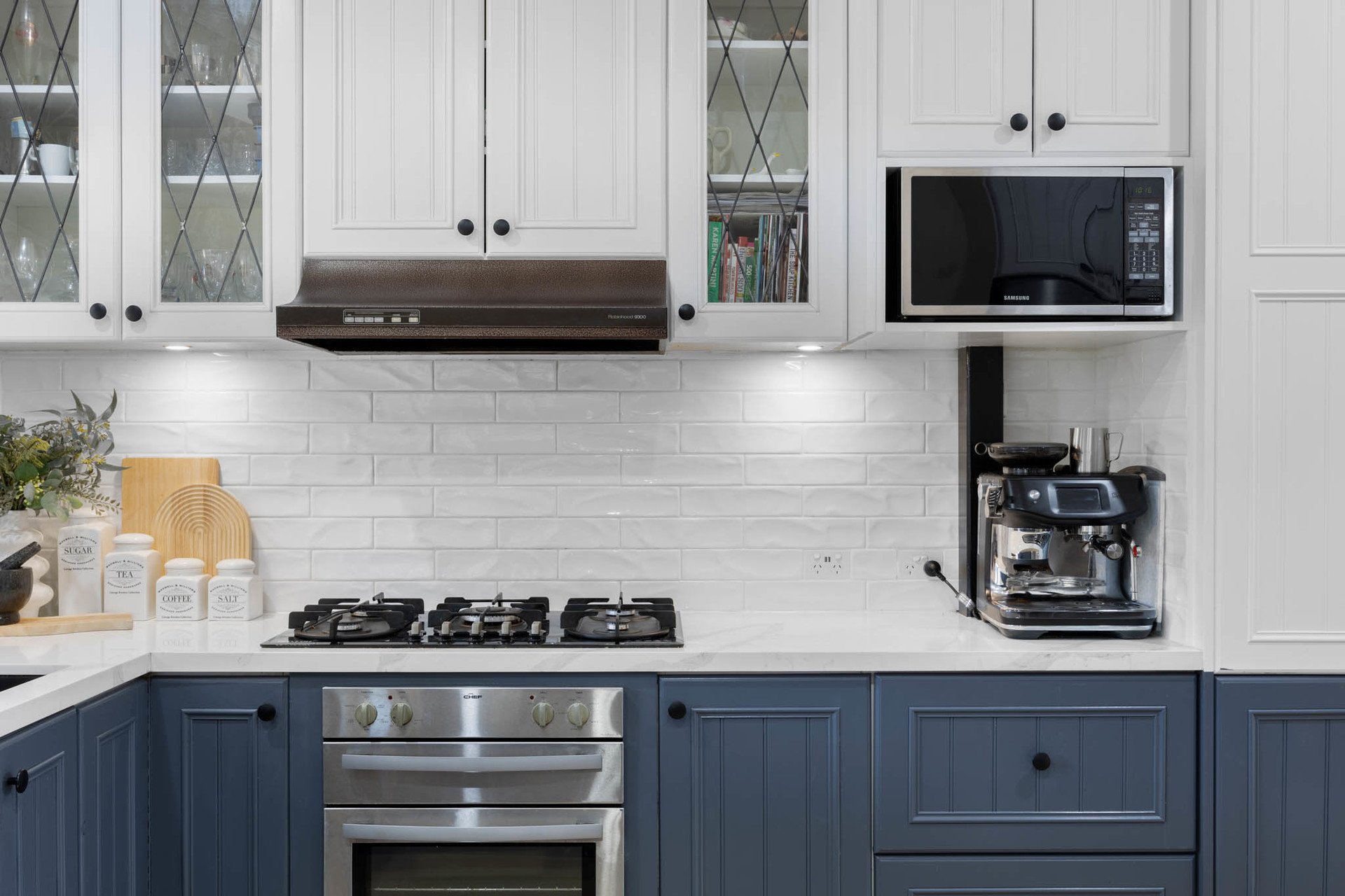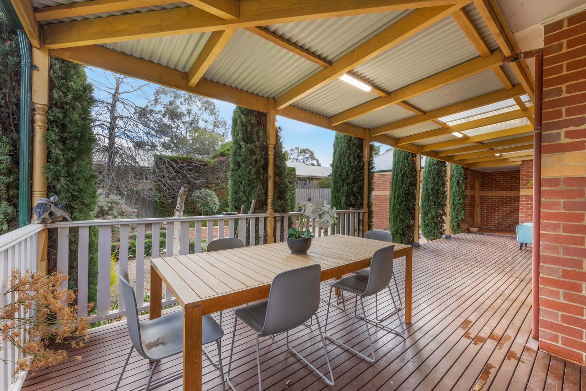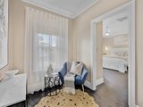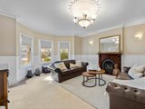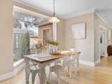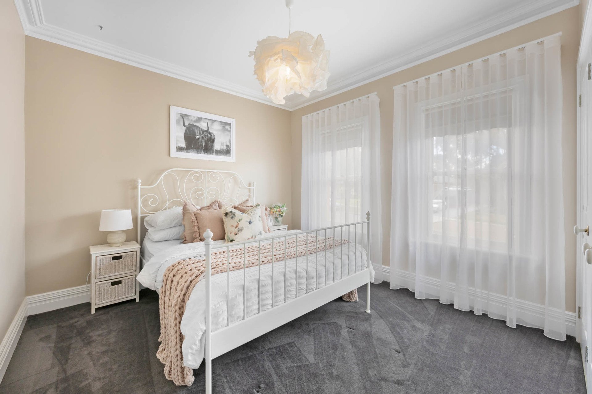 The welcoming entrance showcases leadlight windows and tessellated feature tiles, setting a refined tone. A front lounge with ceiling rose, fireplace, and bay window creates a light-filled retreat overlooking the leafy garden. An arched entry leads to a sunlit study nook, while clever storage is tucked neatly under the staircase.