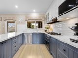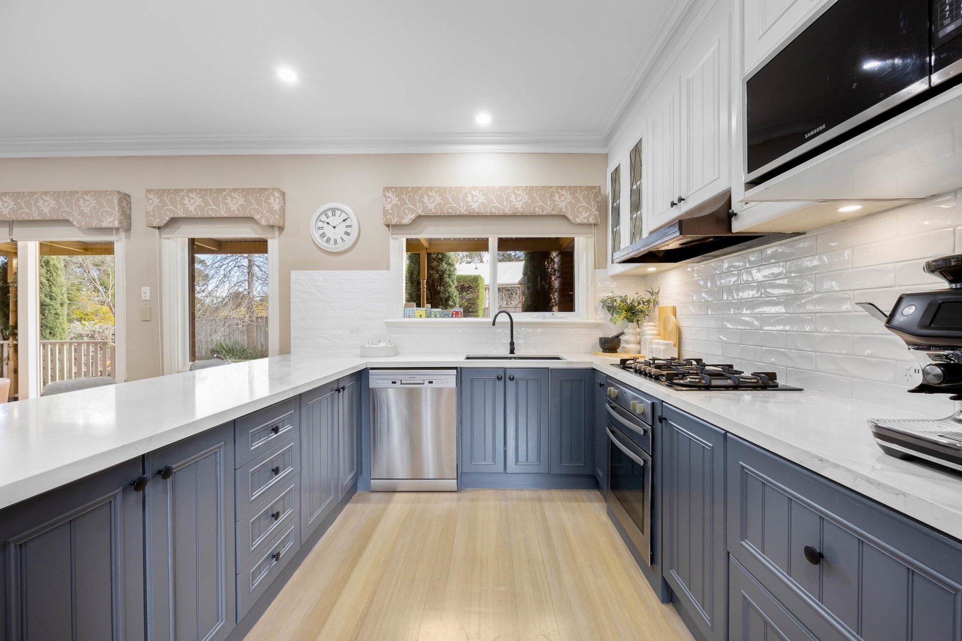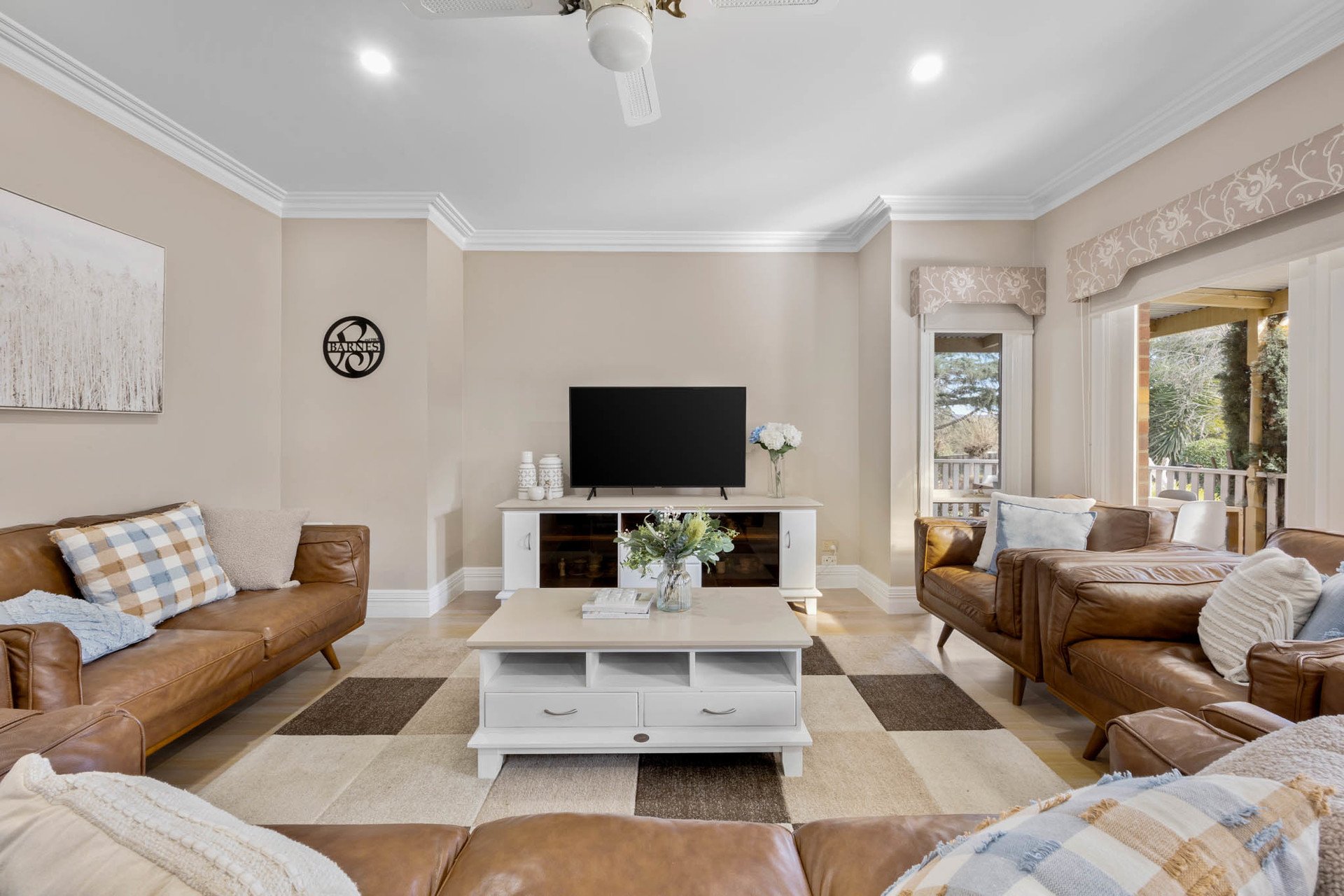 The heart of the home reveals a warm meals area with genuine timber flooring and garden views, adjoining a modern kitchen with stone benchtops, 60cm Chef Oven, 5 hob cooktop, Stirling dishwasher, and soft-close cabinetry. The open living and family rooms extend seamlessly to the wraparound deck, perfect for year-round entertaining.