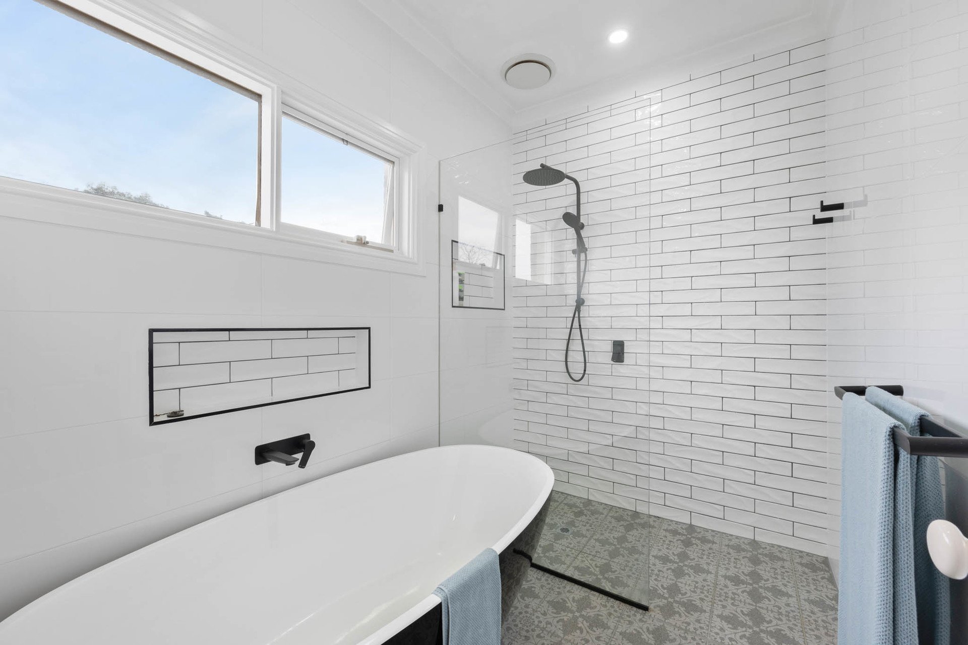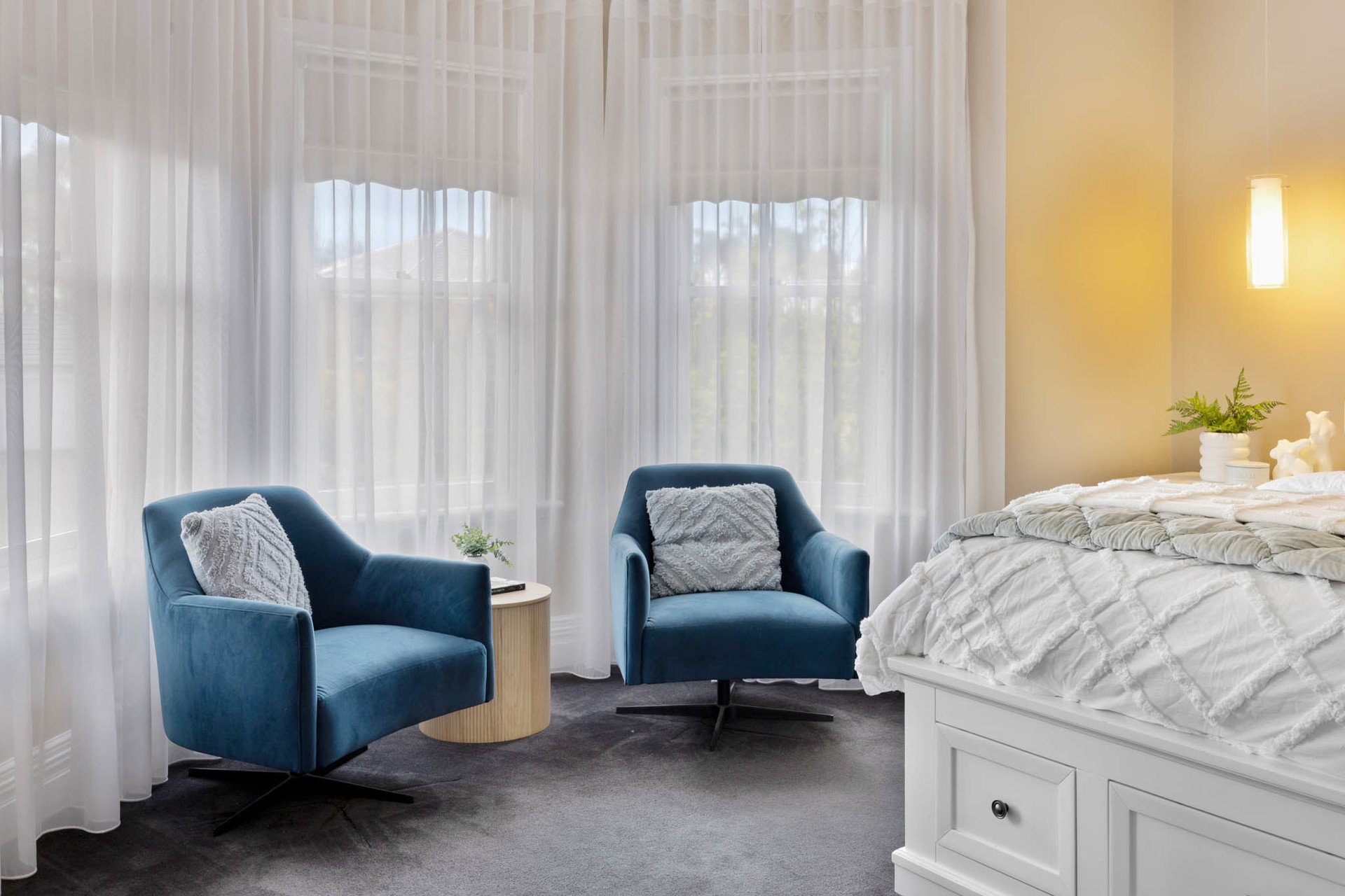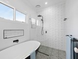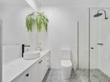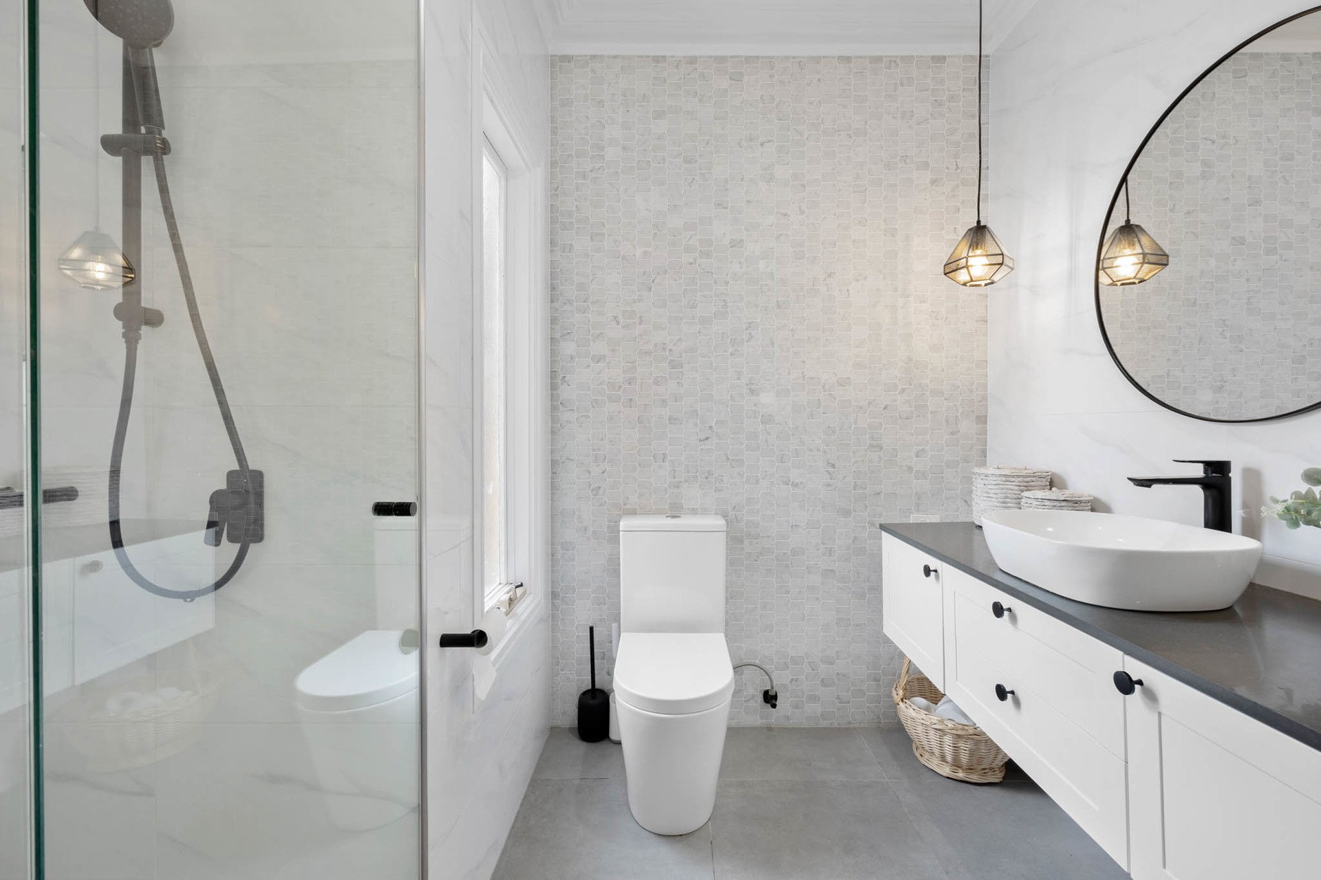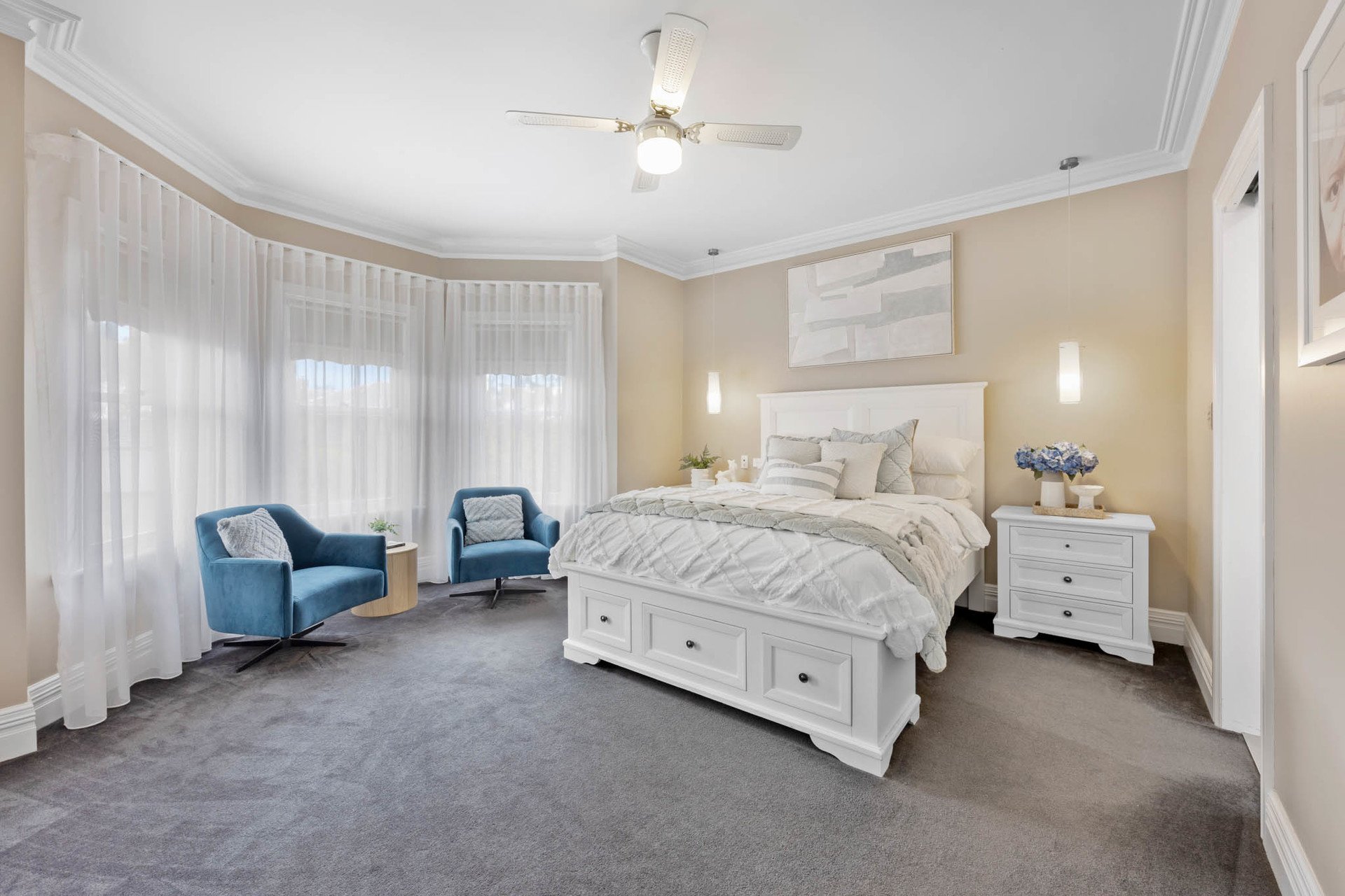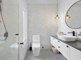 Upstairs, three robed bedrooms share a luxurious bathroom with double vanity, freestanding bath, frameless shower, and separate toilet and are also serviced by a convenient laundry chute. The main bedroom suite impresses with bay windows, walk-in and built-in robes, pendant lighting, and a private ensuite finished with stone, large-format tiles, and a waterfall shower.