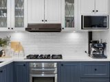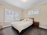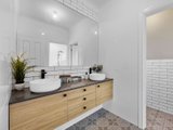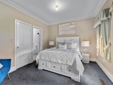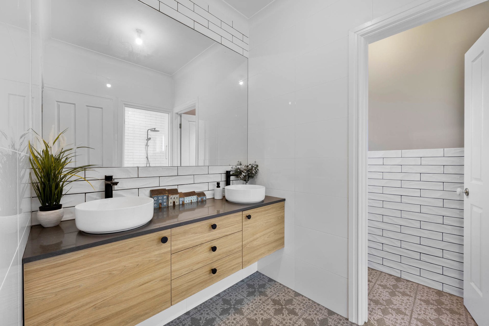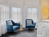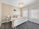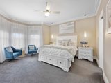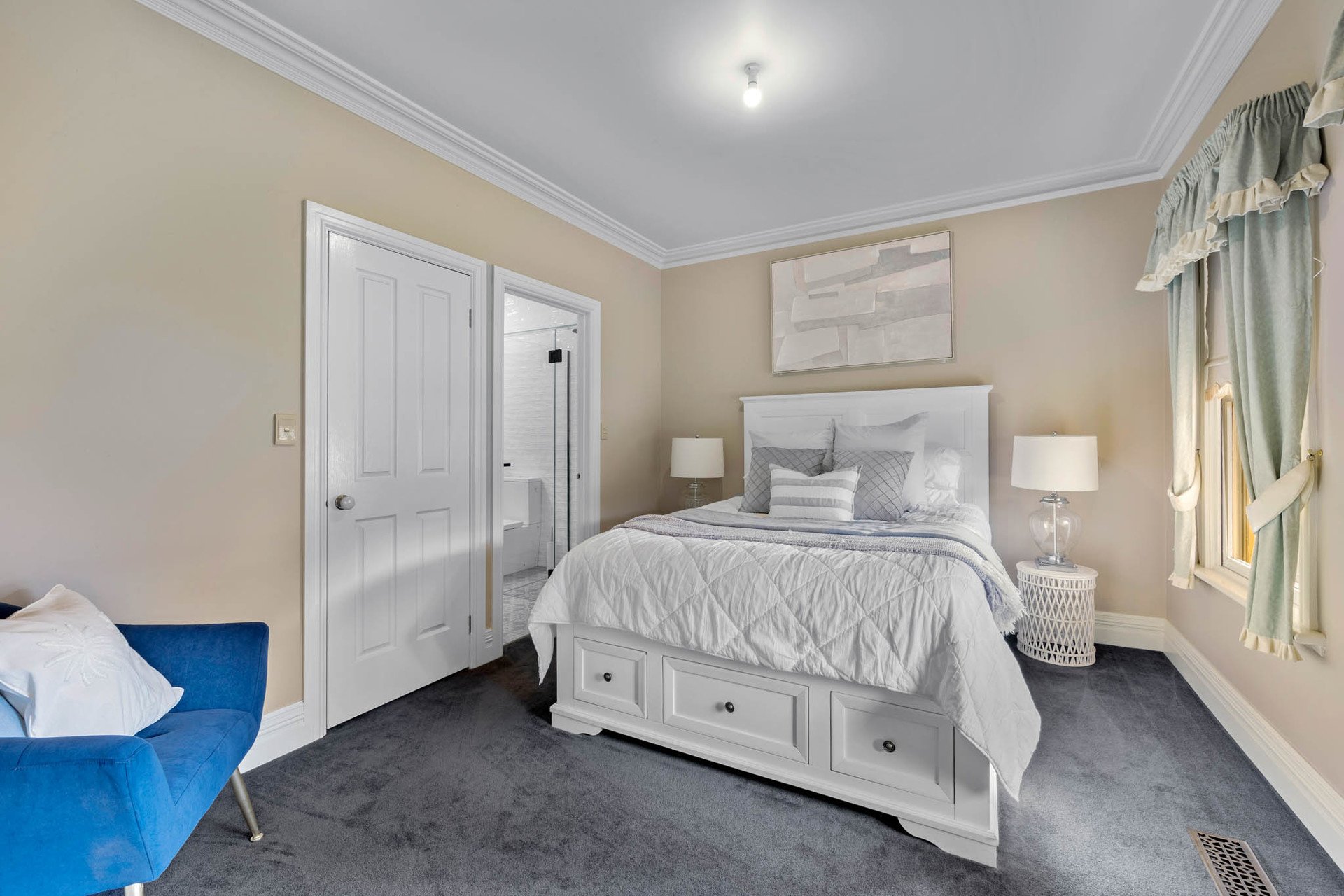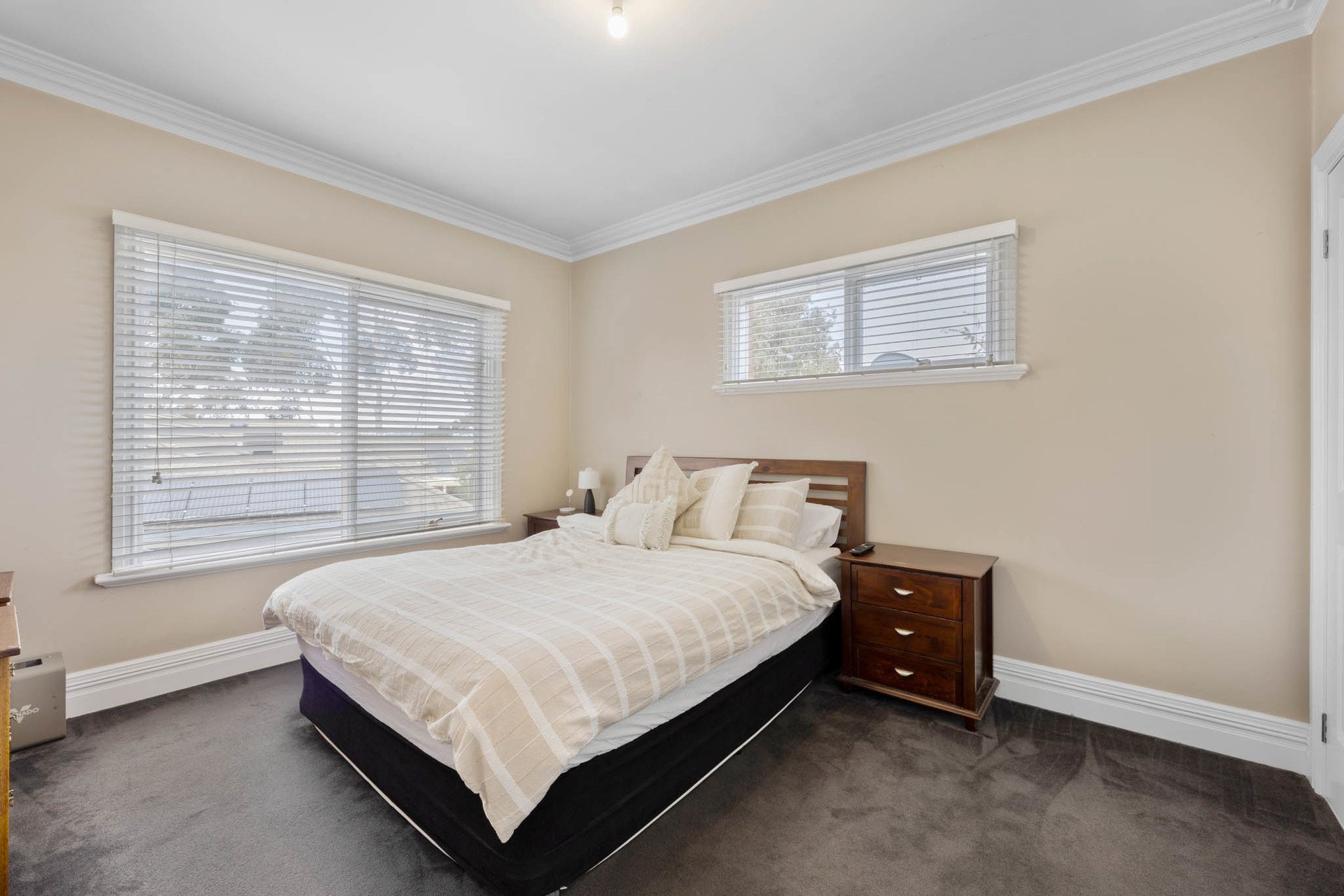 Upstairs, three robed bedrooms share a luxurious bathroom with double vanity, freestanding bath, frameless shower, and separate toilet and are also serviced by a convenient laundry chute. The main bedroom suite impresses with bay windows, walk-in and built-in robes, pendant lighting, and a private ensuite finished with stone, large-format tiles, and a waterfall shower.