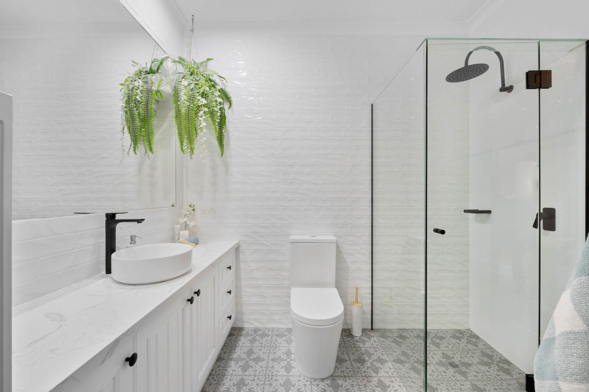 The ground floor includes a versatile bedroom with access to a stylish two-way ensuite featuring decorative tiling, stone vanity, and floor-to-ceiling finishes. A well-appointed laundry with abundant storage and stone benchtop flows out to the side deck.