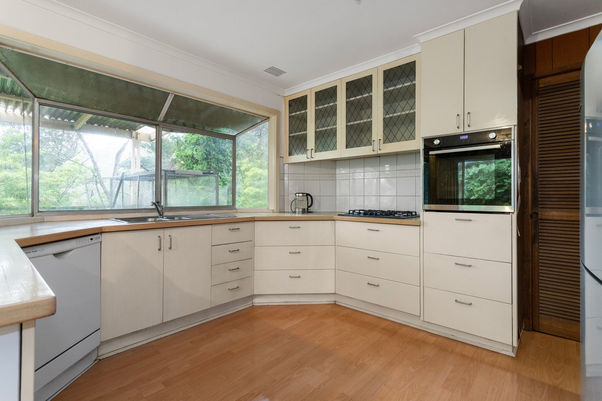 The home spans two spacious levels, with a layout that allows for effortless reconfiguration. Upstairs, an expansive lounge and dining room with a connecting covered deck bask in natural light and treetop vistas, while the adjoining kitchen comes complete with a full suite of modern appliances and a charming box bay window. Down the hall are four bedrooms, including a large room that could easily be converted back into two bedrooms, plus a separate bath room, shower room and toilet.