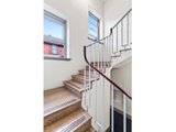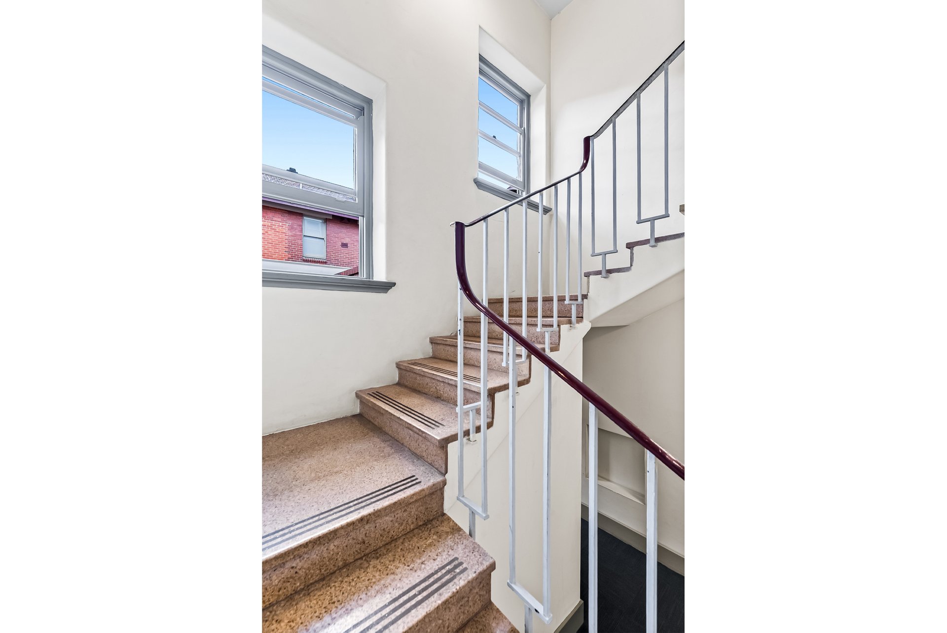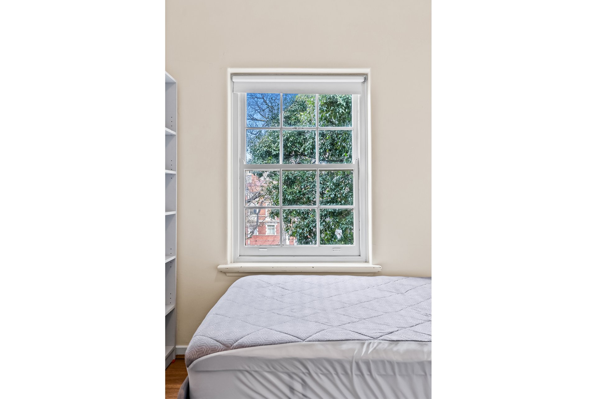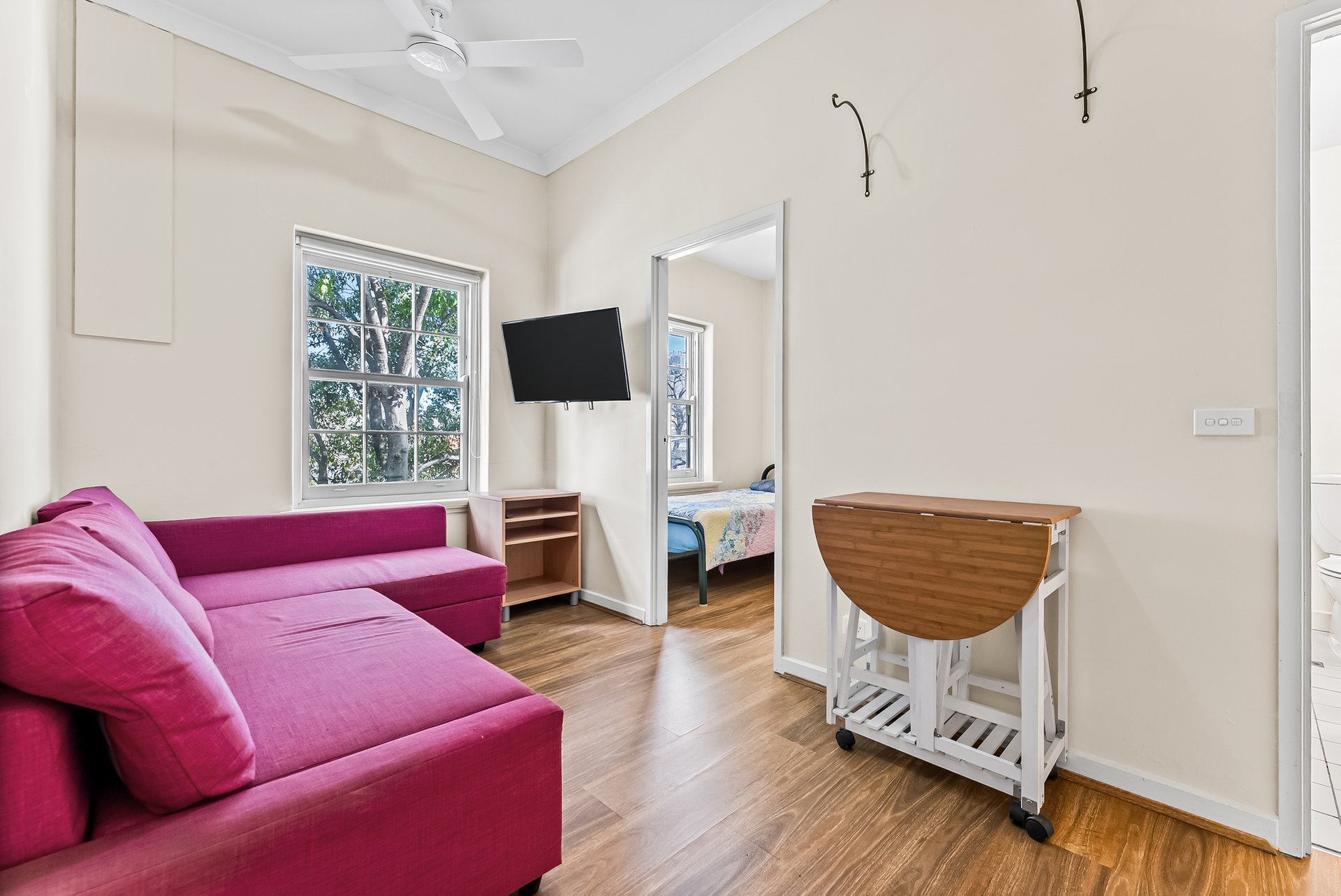 Inside, the apartment delivers comfortable, light-filled living. Large Victorian-style windows frame leafy tree outlooks in every room, bringing in natural light and a calm, airy feel. The generous living area is enhanced by timber floors and ceiling fan, while the tiled kitchen and bathroom add practicality. A spacious bathroom and well-proportioned bedrooms complete the functional layout, with a beautiful stairwell leading up to the apartment adding further character.
