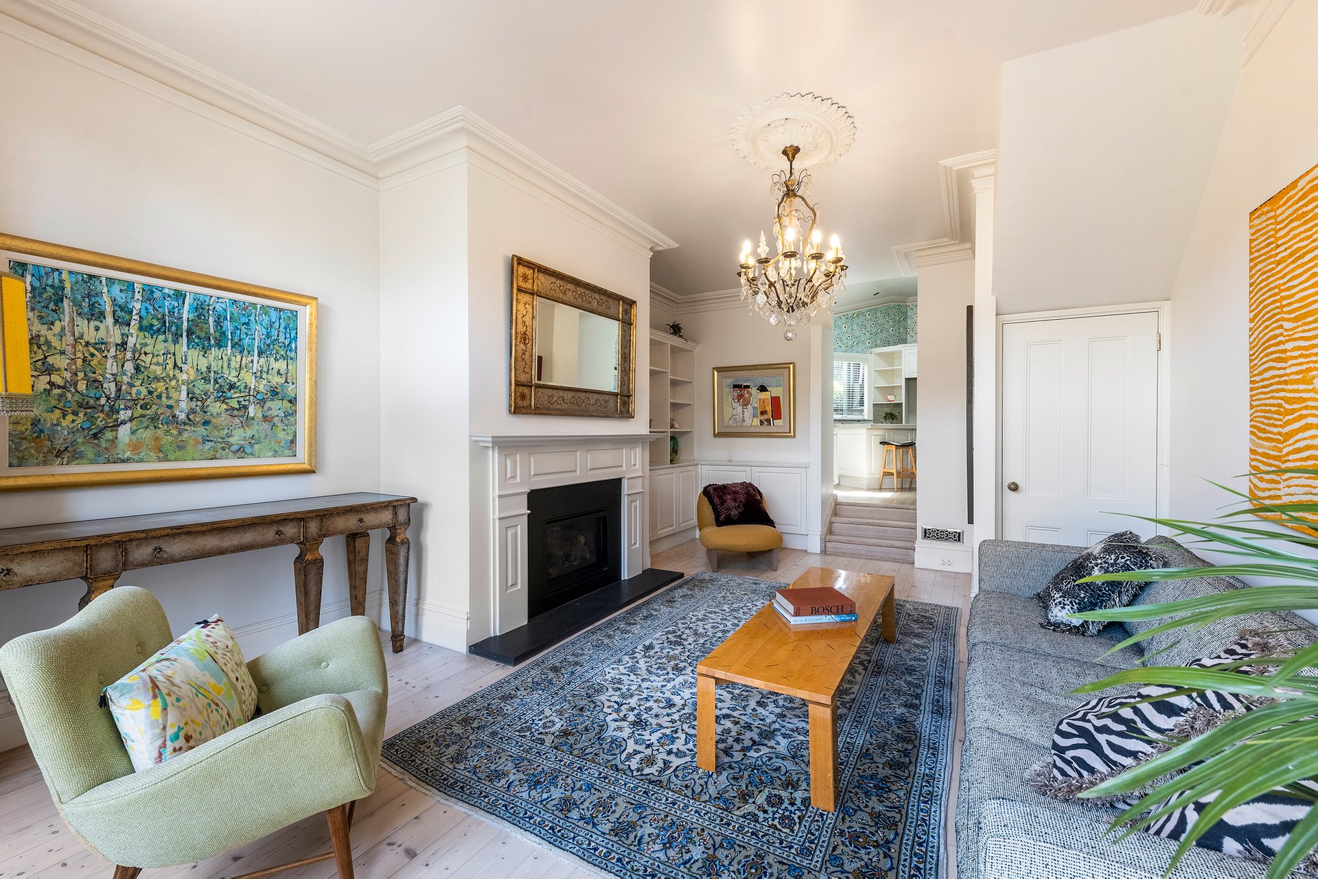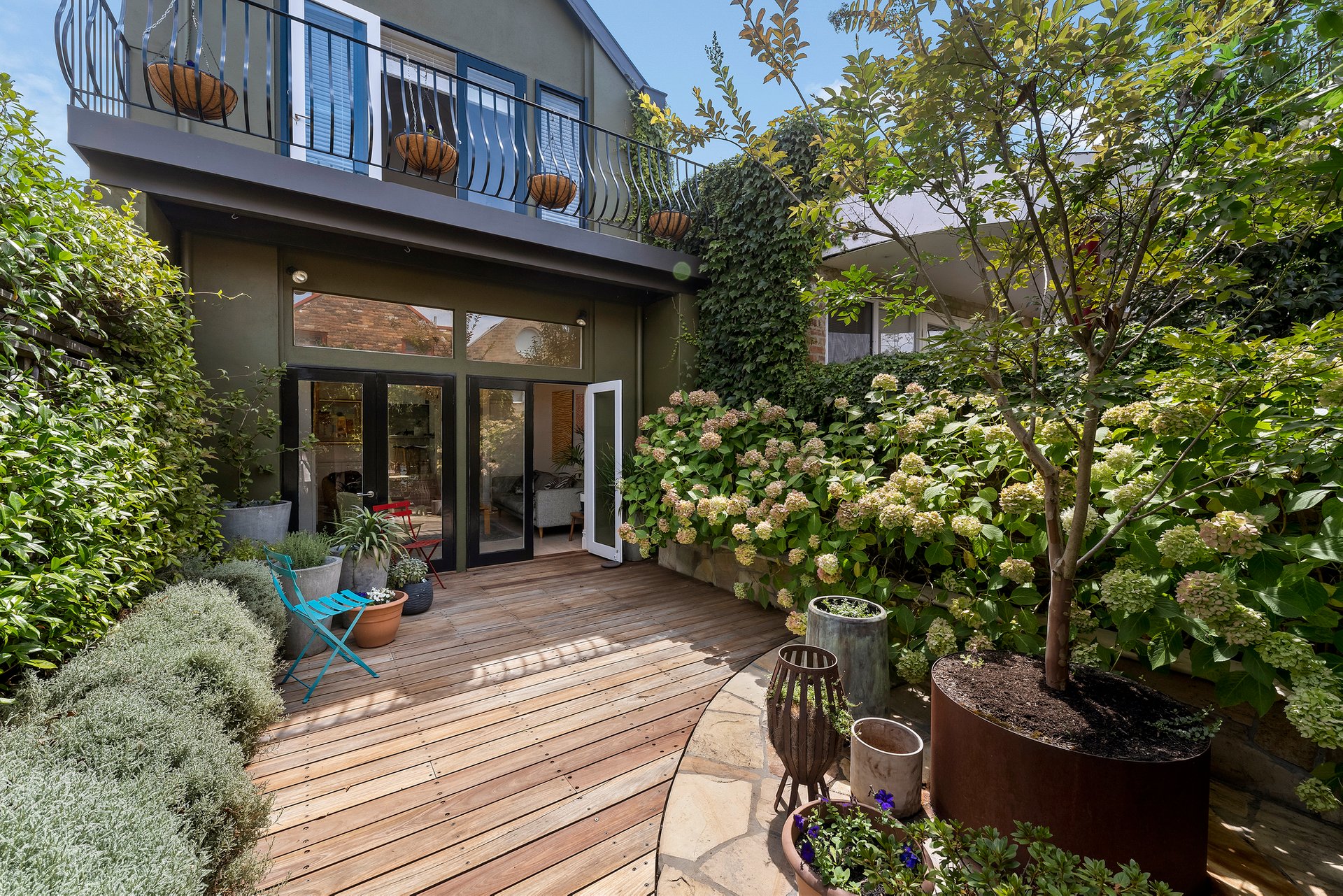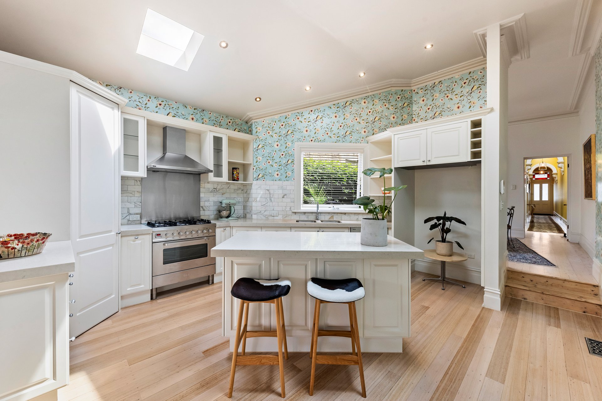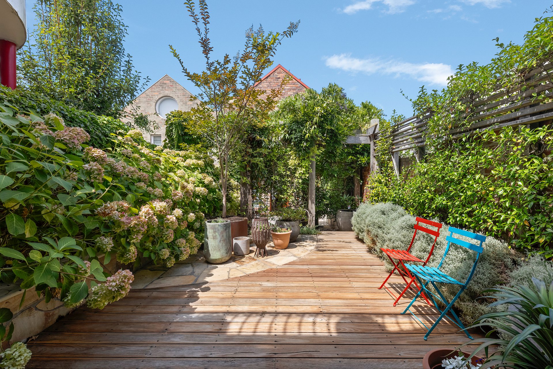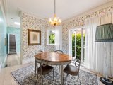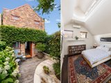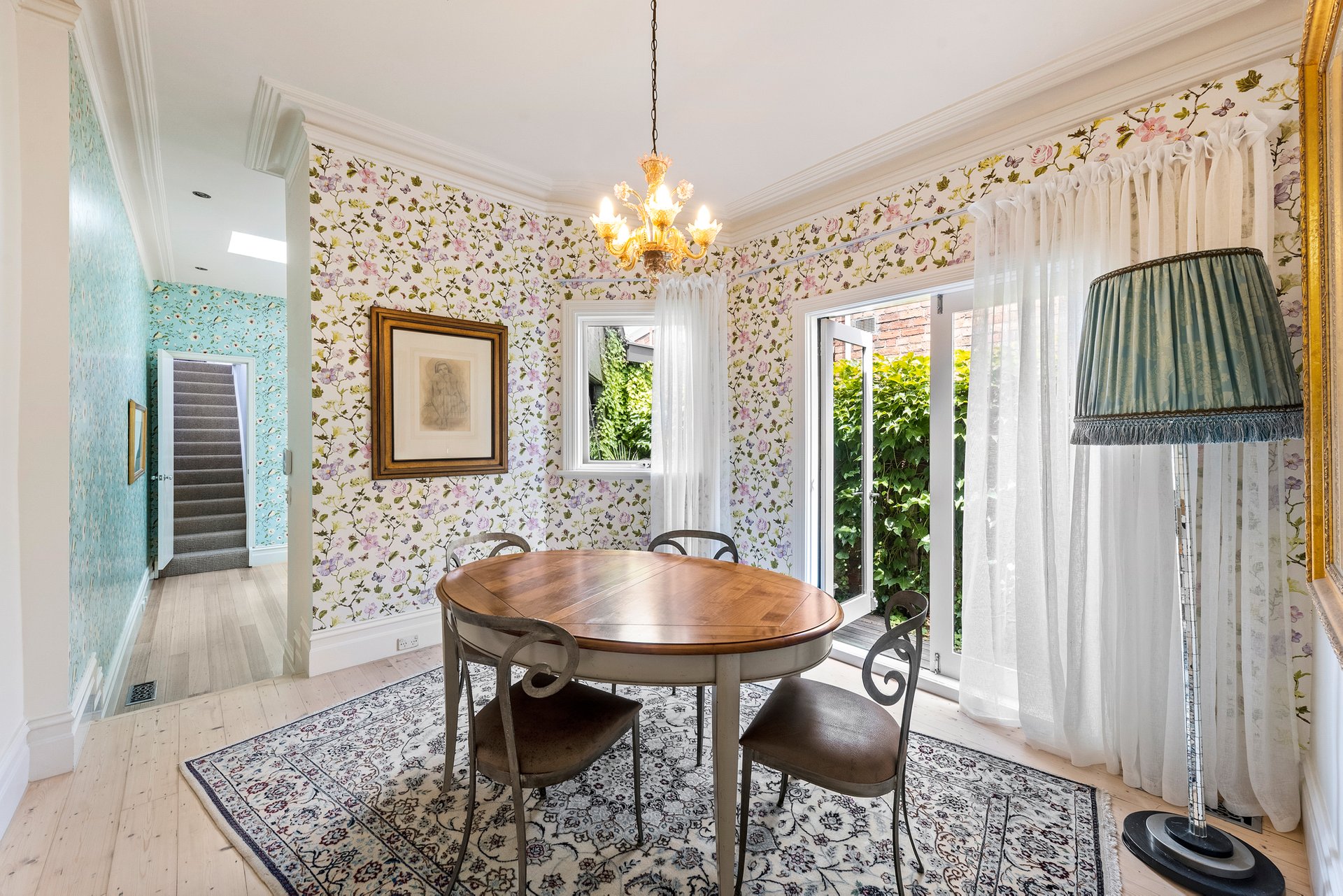 Preceded by a private landscaped front garden, an evocative arched entry hall leads to two large front bedrooms, an opulent central bathroom (with deep freestanding bath), separate laundry, and opens to a unique central dining room set against playful wallpaper and a private garden courtyard.
