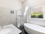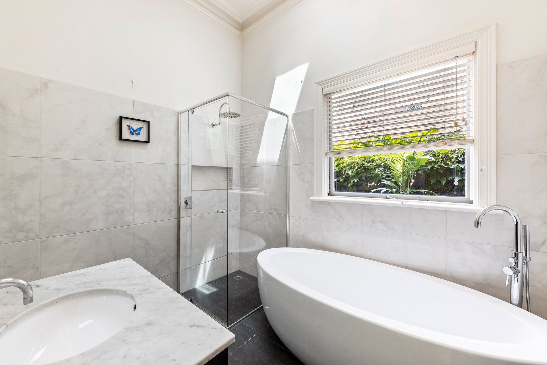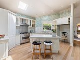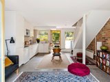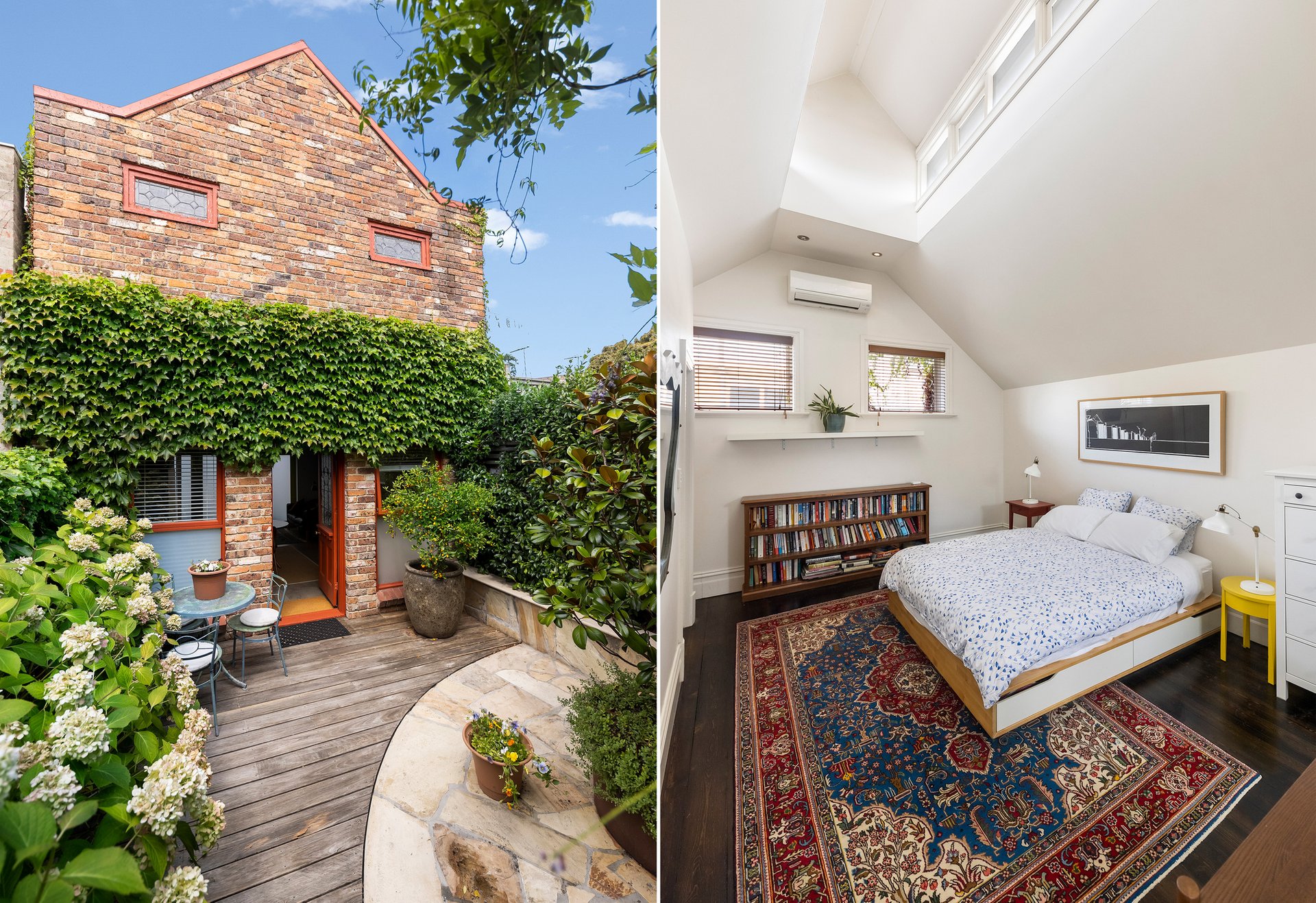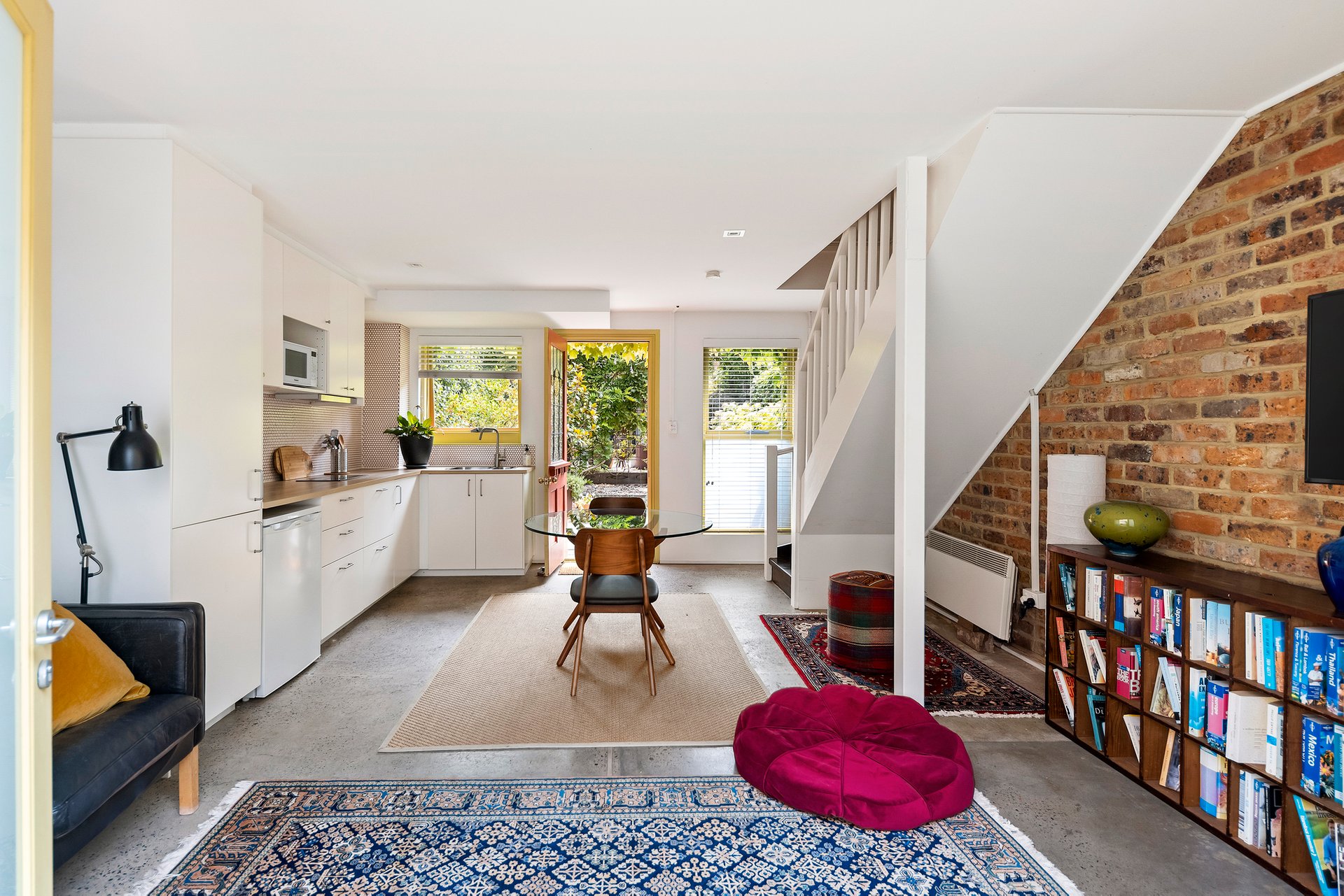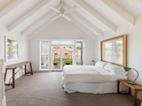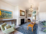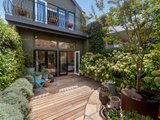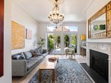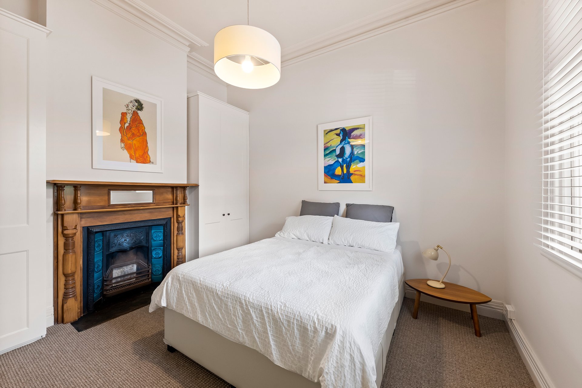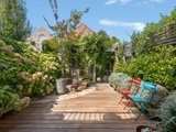 Preceded by a private landscaped front garden, an evocative arched entry hall leads to two large front bedrooms, an opulent central bathroom (with deep freestanding bath), separate laundry, and opens to a unique central dining room set against playful wallpaper and a private garden courtyard.