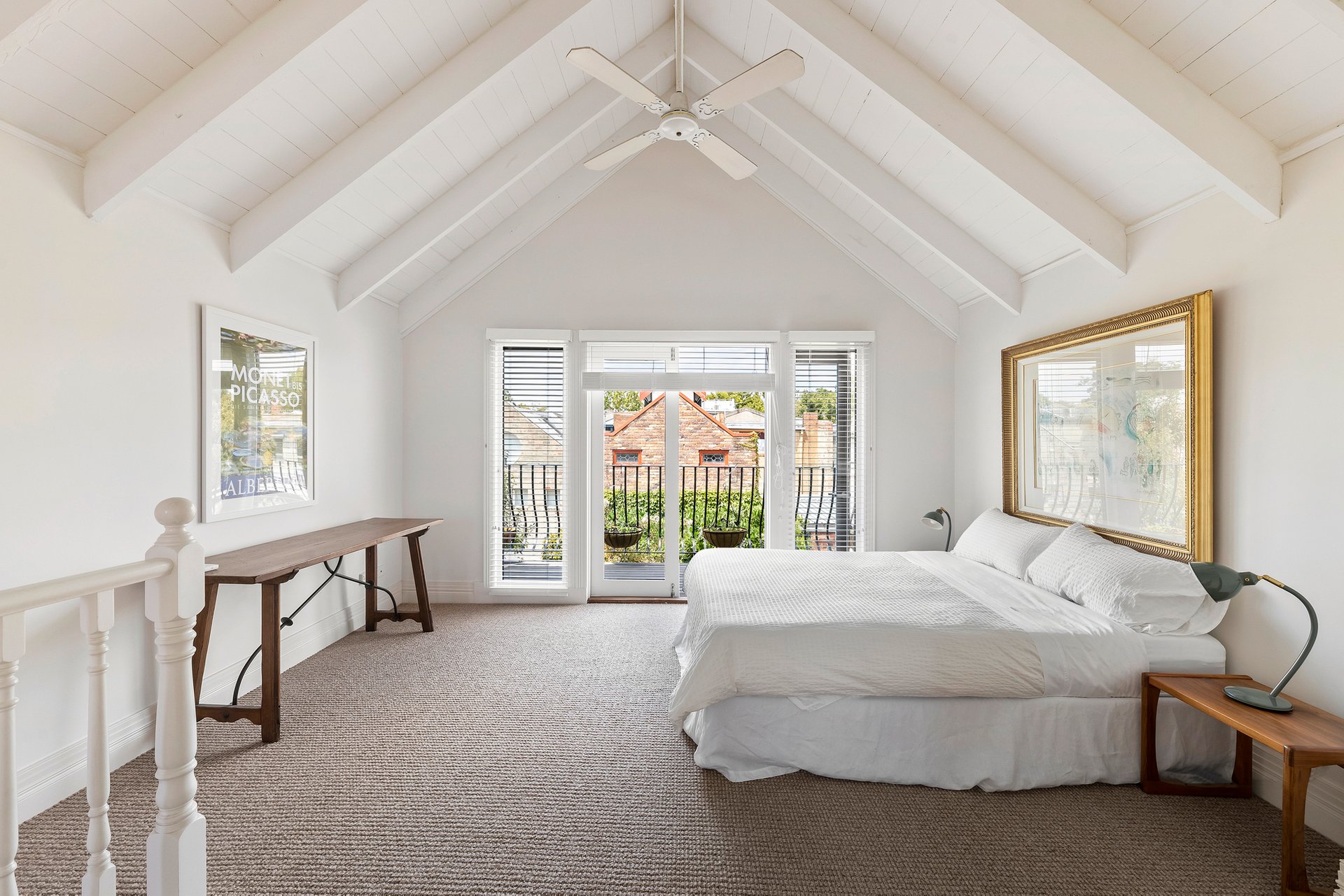 Upstairs finds the main bedroom with soaring cathedral ceilings, private balcony, walk-in robe and gleaming ensuite. The converted rear stables offer separate entry, polished concrete floors, recently updated kitchen, huge bedroom and ensuite. Additional features include quality light fittings, gas fireplace, ducted central heating and split-system heating/cooling.