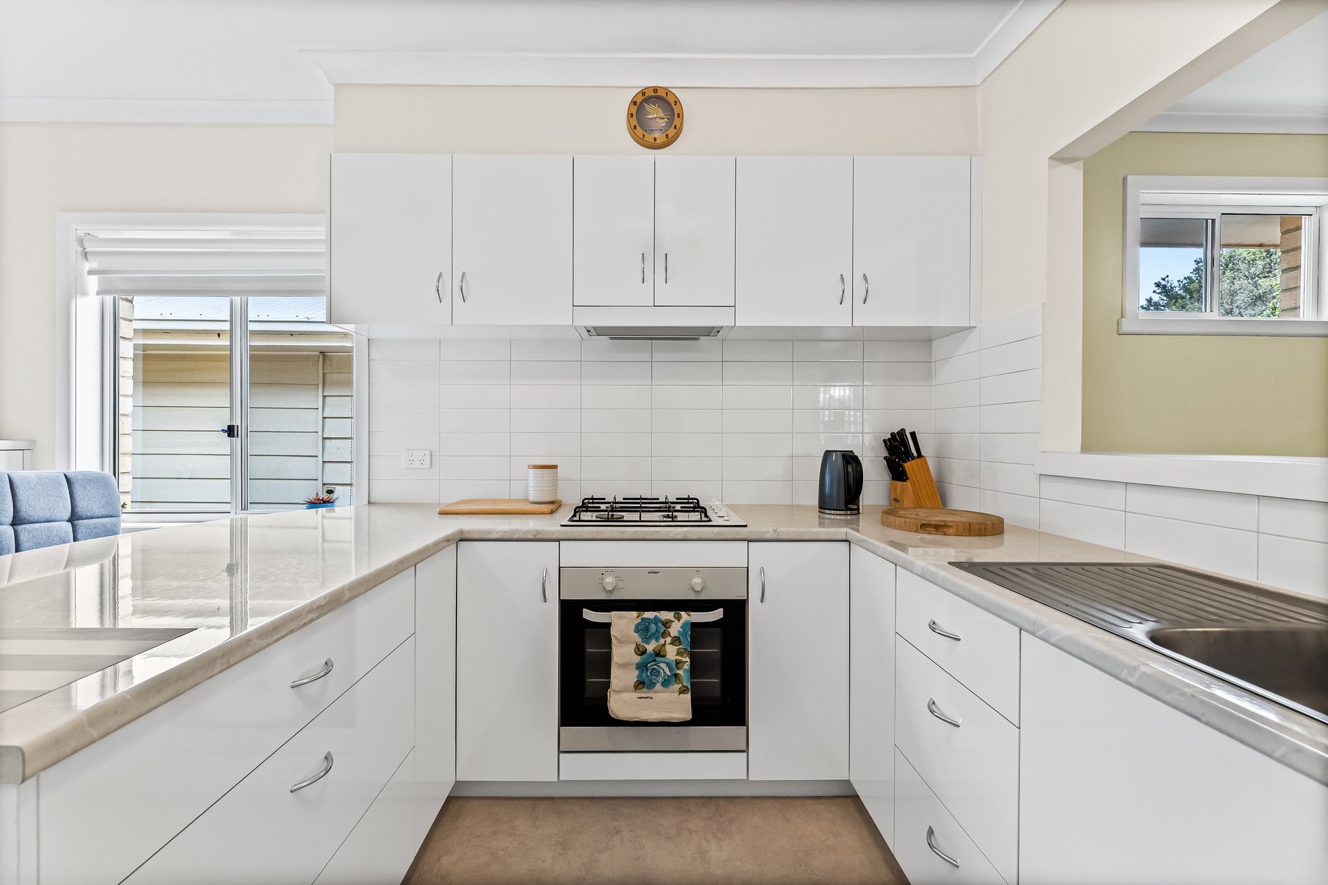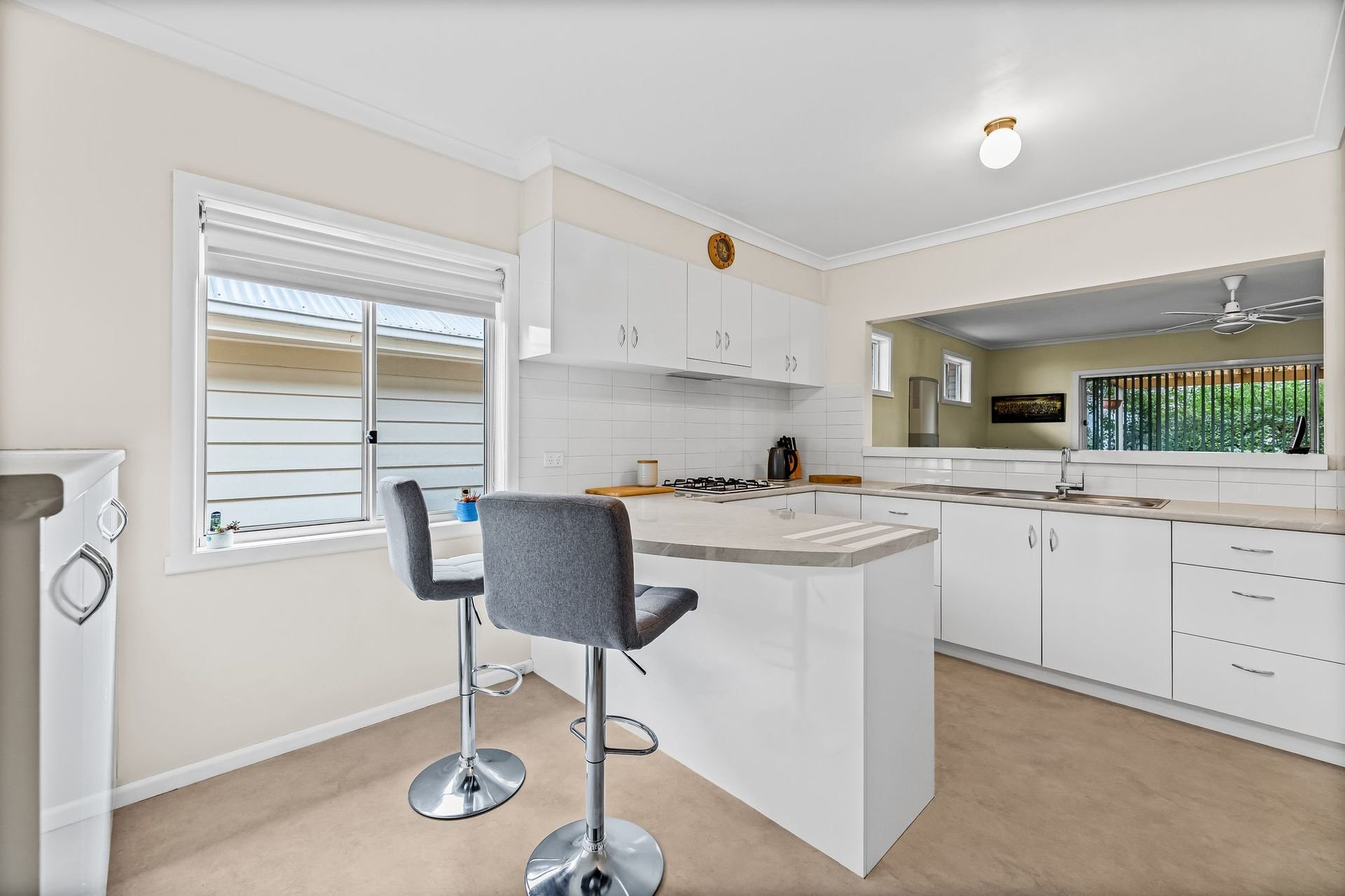 Evaporative cooling throughout, partners with gas heating featured in the front lounge and family/dining domain, which sit either side of an immaculate kitchen/meals centrepiece. The kitchen is equipped with a gas cooktop, electric conventional oven, range hood & fan, laminated bench tops and breakfast bar. It also features sliding door access to a walk in, generous sized pantry. Well positioned wall cabinets located above the meals and breakfast bar, combine with separate bench top storage cabinets, providing ample storage capacity. What's more, soft close drawers, corner cabinets, a double sink, together with a servery bench window into the adjoining family/dining room, highlight this well appointed kitchen package.