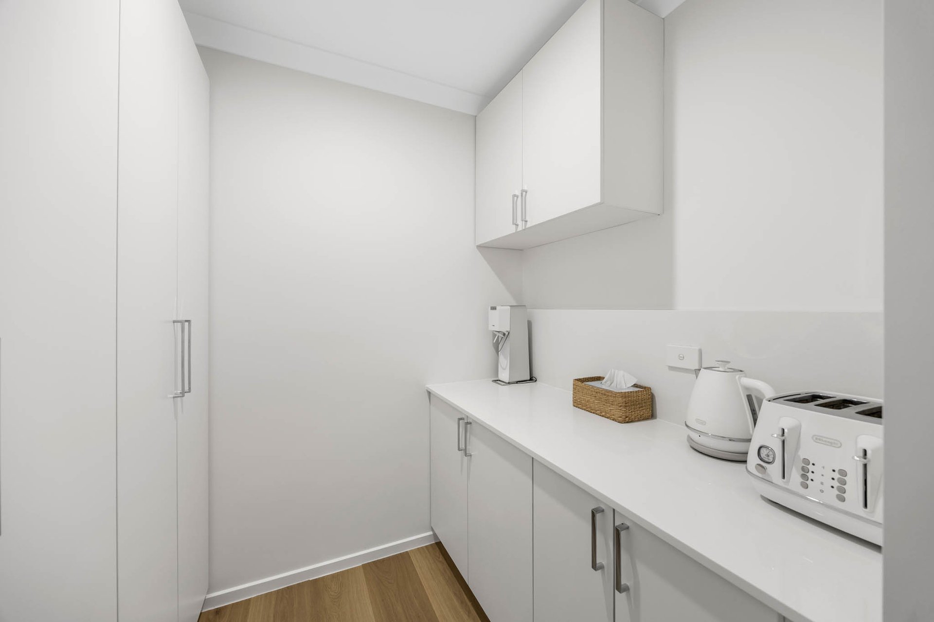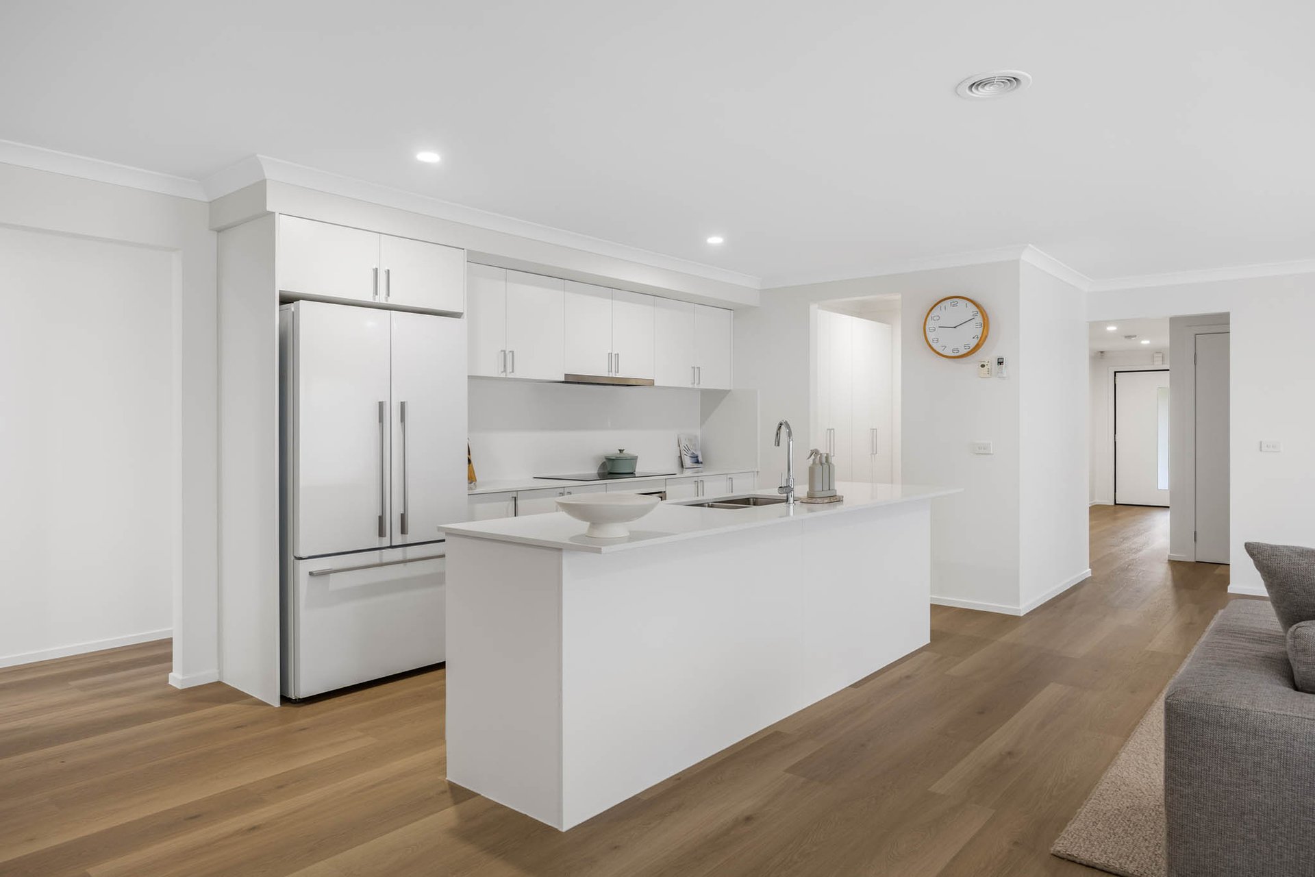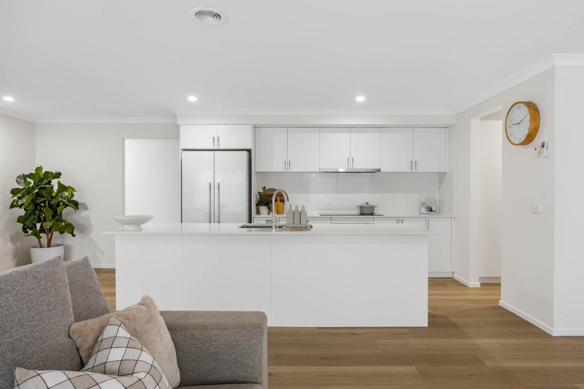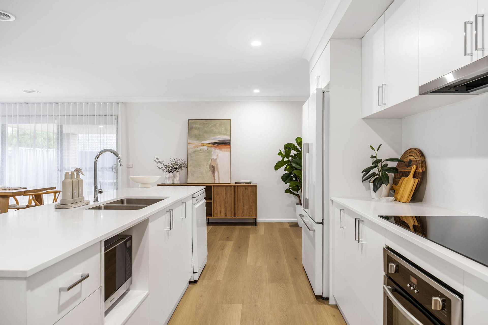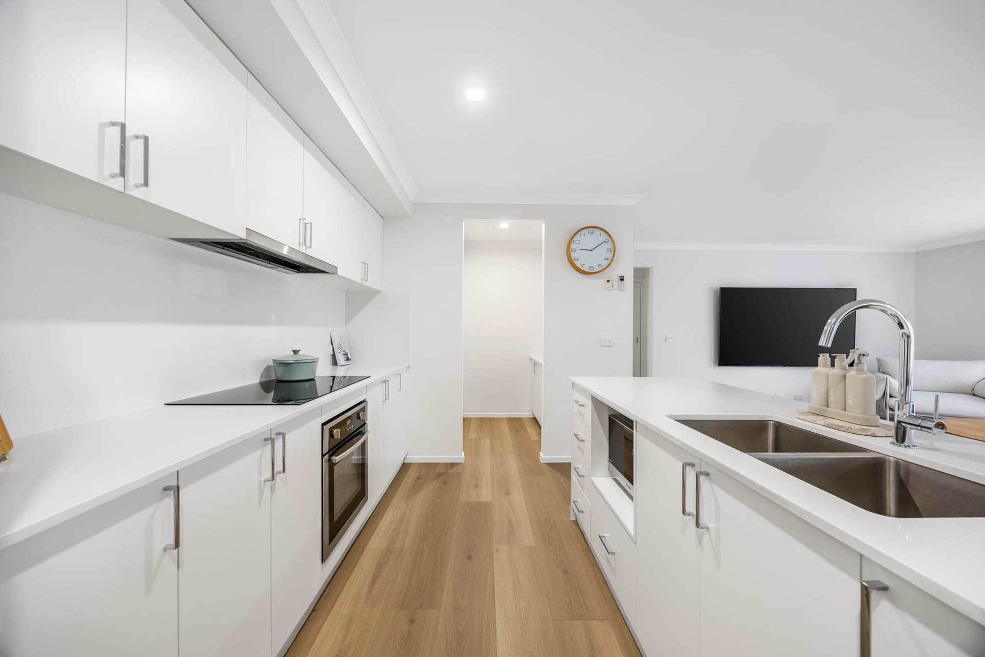 The crisp white kitchen impresses with stone benchtops, undermount sinks, a walk-in pantry, stainless-steel oven, induction cooktop, and an LG dishwasher. Adjacent dining and living effortlessly flow to alfresco entertaining, with the corner allotment promoting easy upkeep with a lush lawn.