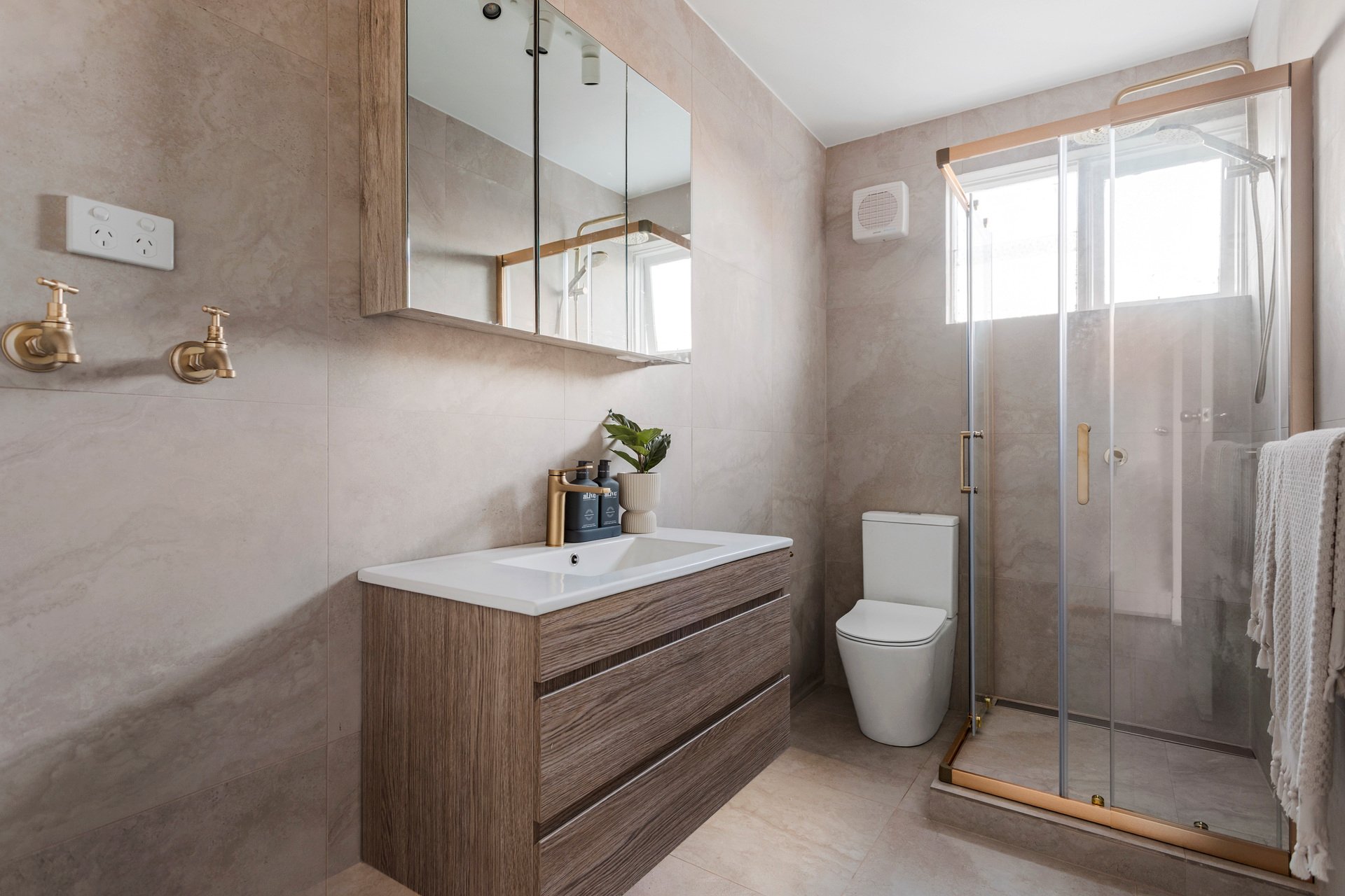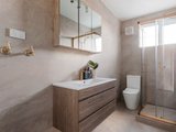 The stylishly reimagined kitchen has been designed with both function and flair in mind. Featuring sleek stone benchtops, stainless steel appliances, and ample soft-close cabinetry, it delivers a modern cooking space that doesn't compromise on storage or sophistication. The bathroom continues the home's elevated aesthetic, with chic full-height tiling, a floating vanity, and discreet laundry facilities that enhance both form and function.