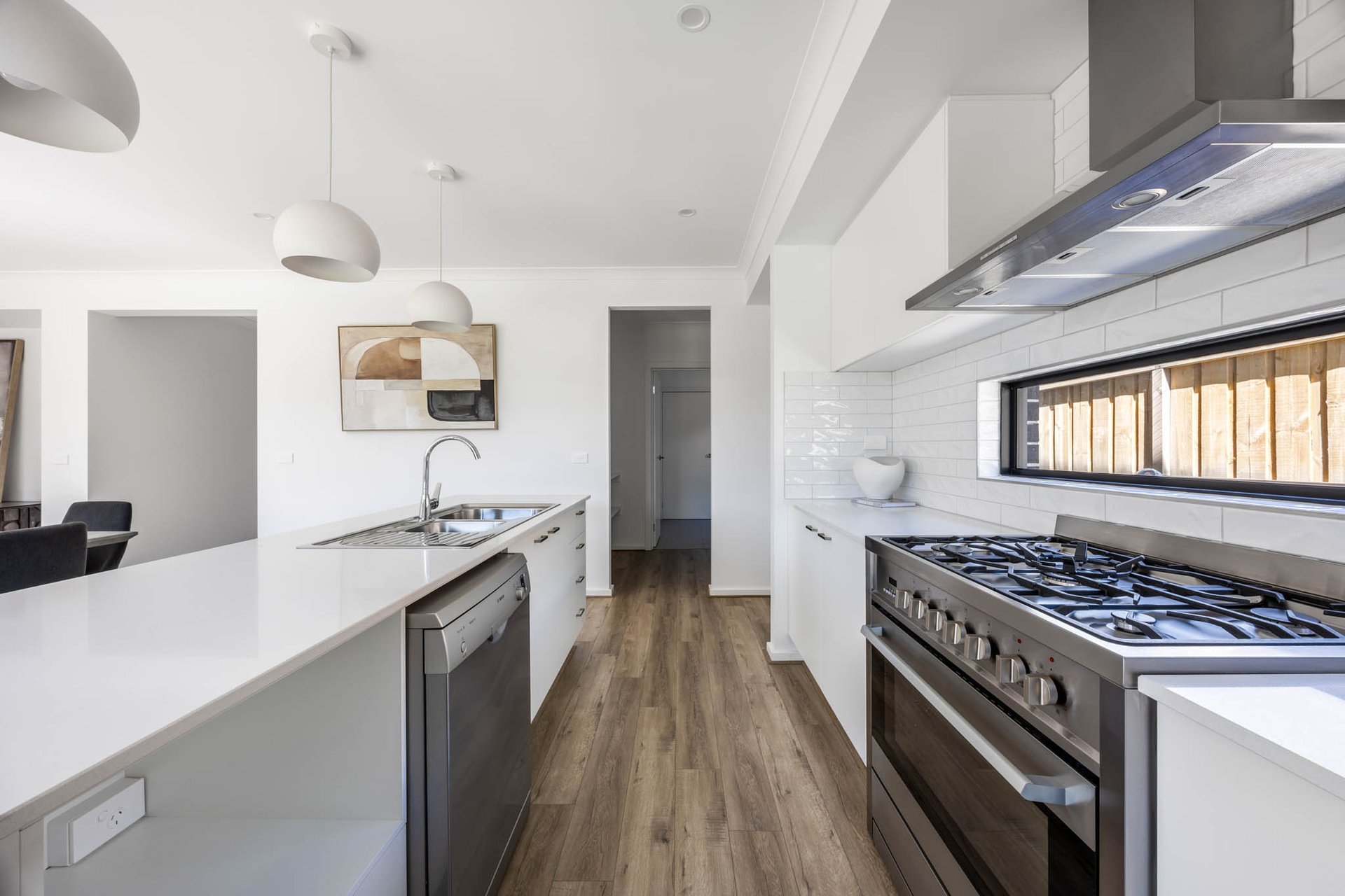 A wide entry hall sets a refined tone, introducing a carpeted lounge before flowing to spacious open kitchen, dining, and living zones that connect seamlessly to the alfresco entertaining area and landscaped rear yard. Polished and precise, the kitchen is appointed with lavish stone surfaces, a large walk-in pantry, a 900mm Technika upright oven, and a Bosch dishwasher, all illuminated by a curvaceous trio of pendant lights.