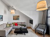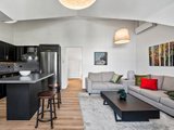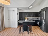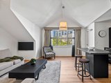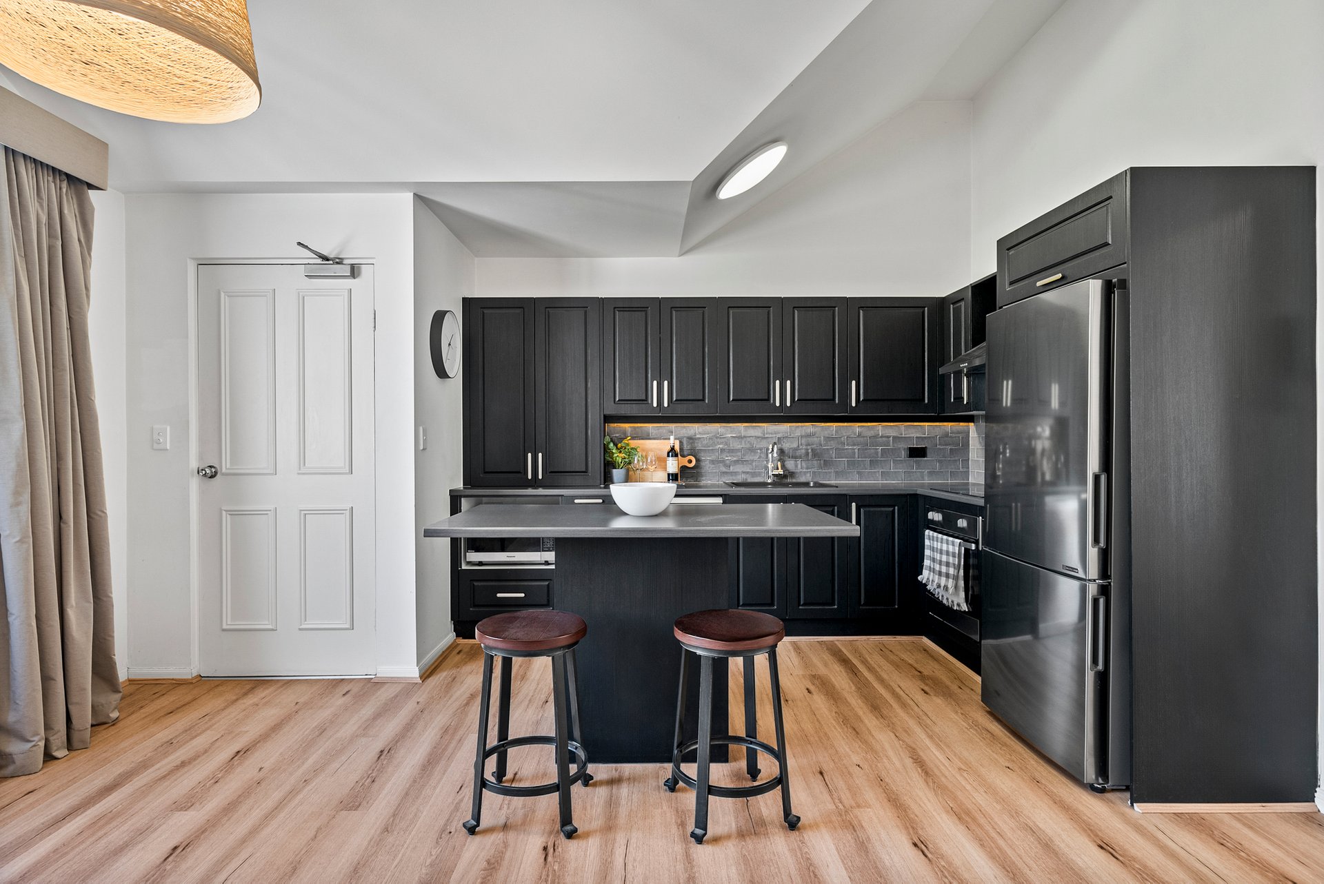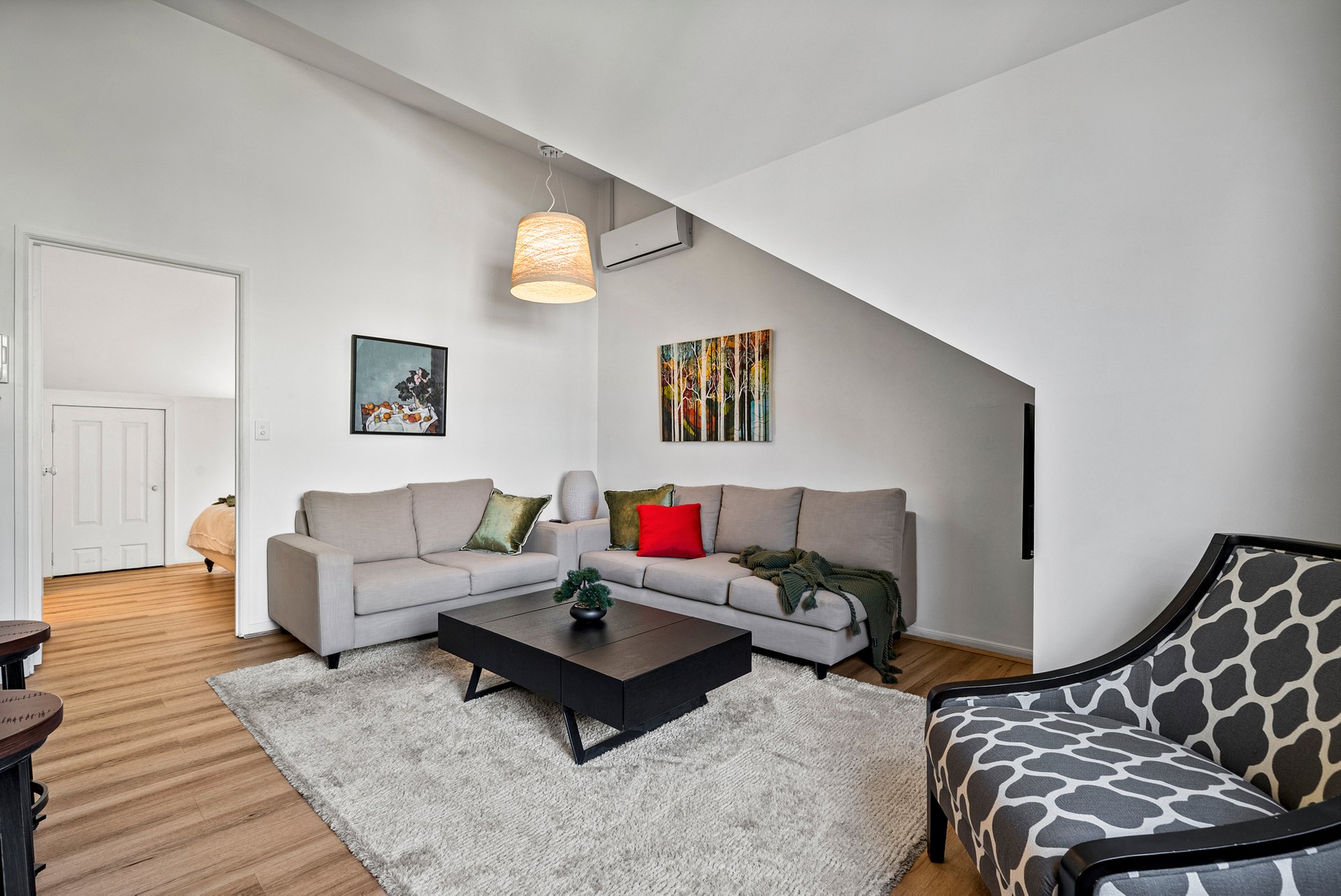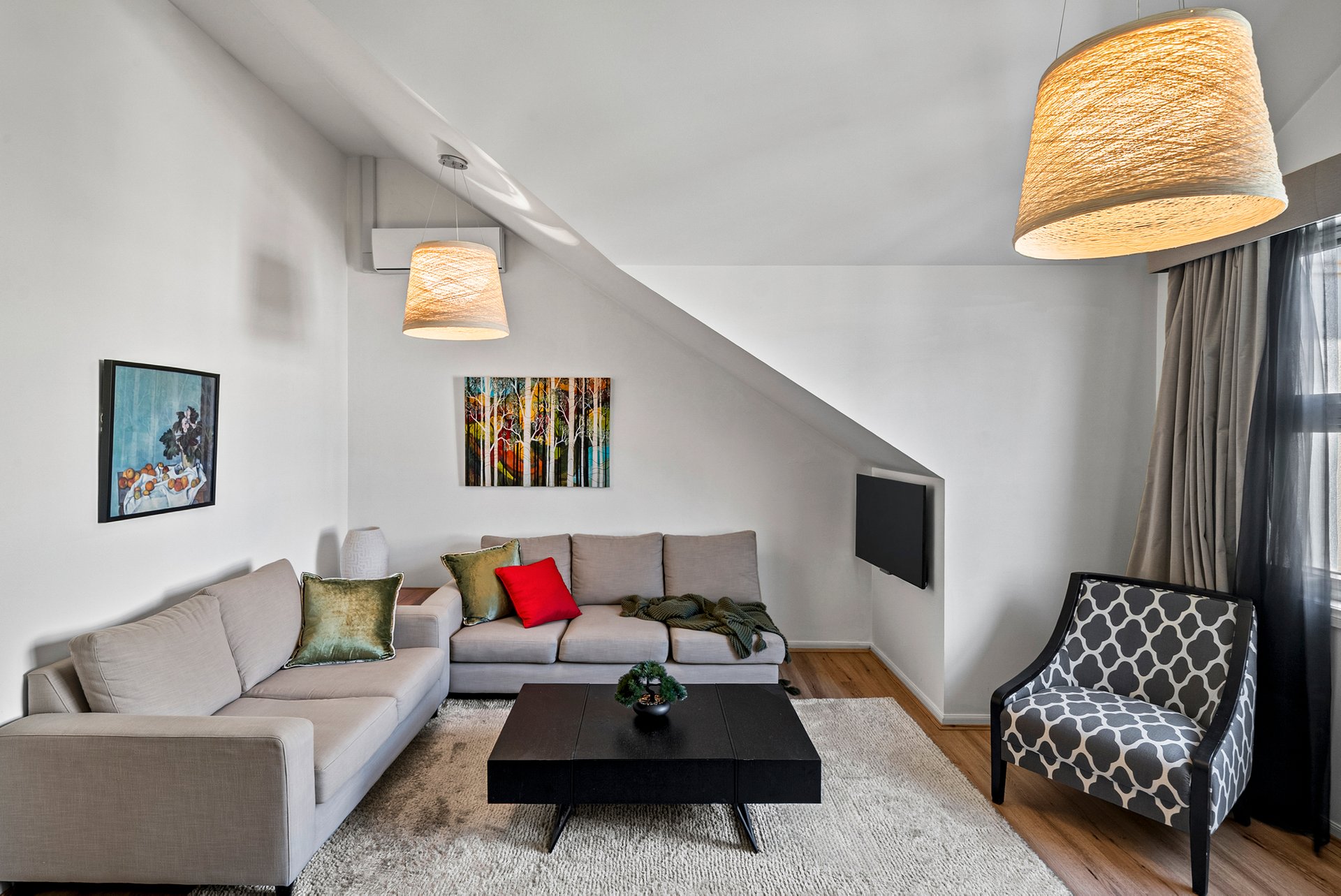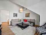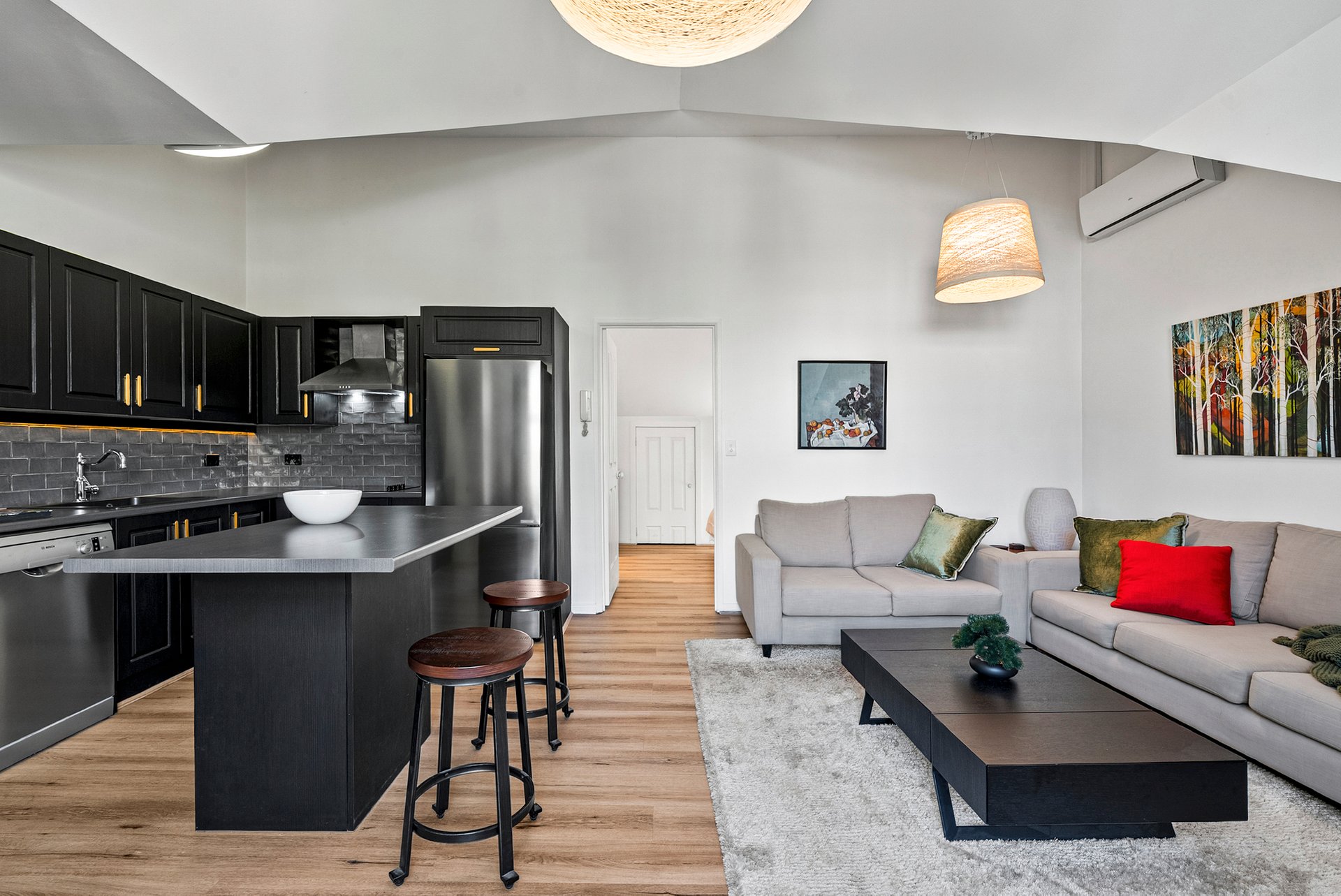 The open-plan kitchen, dining and living area is filled with natural light and enhanced by a striking vaulted ceiling, creating a sense of space rarely found in apartment living. Timber flooring flows throughout, while a split system heating and cooling unit ensures year-round comfort.