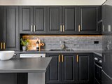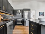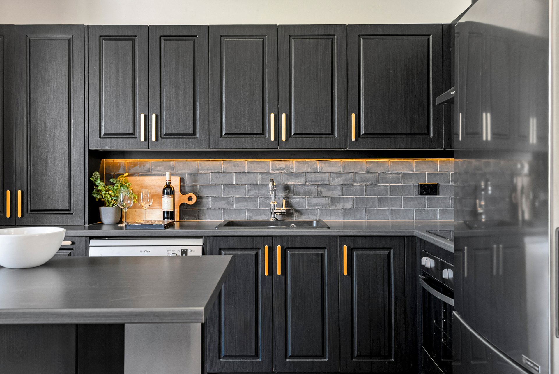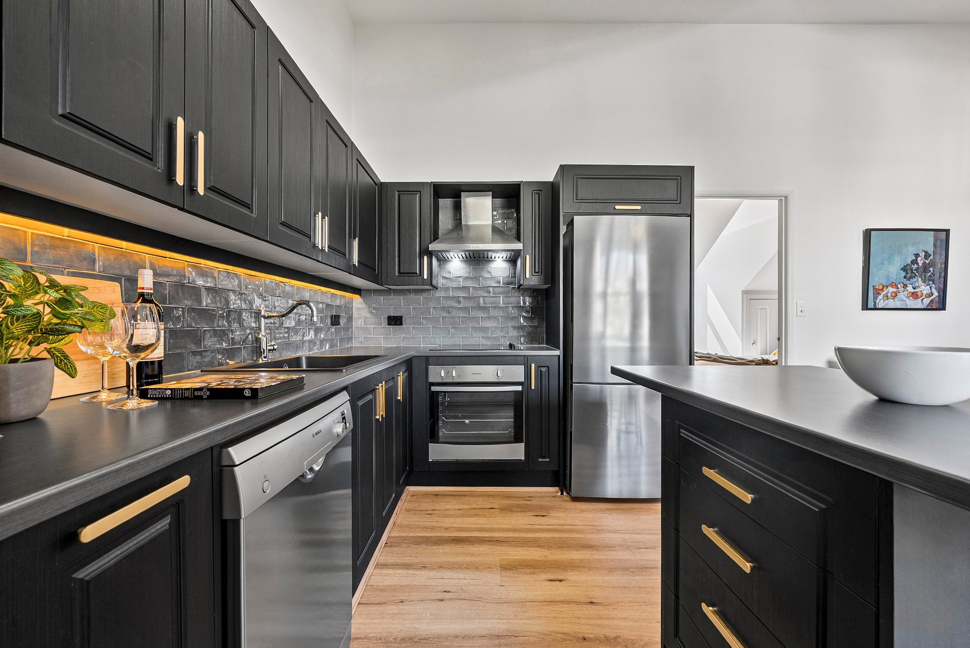 The kitchen presents a sleek and cohesive design, featuring black cabinetry with gold handle fixtures, space grey laminate benchtops and a grey tile splashback. Feature strip lighting under the overhead cupboards adds both style and a luxury touch. Fitted with quality appliances including a Bosch dishwasher, electric oven and induction cooktop complete this modern kitchen.